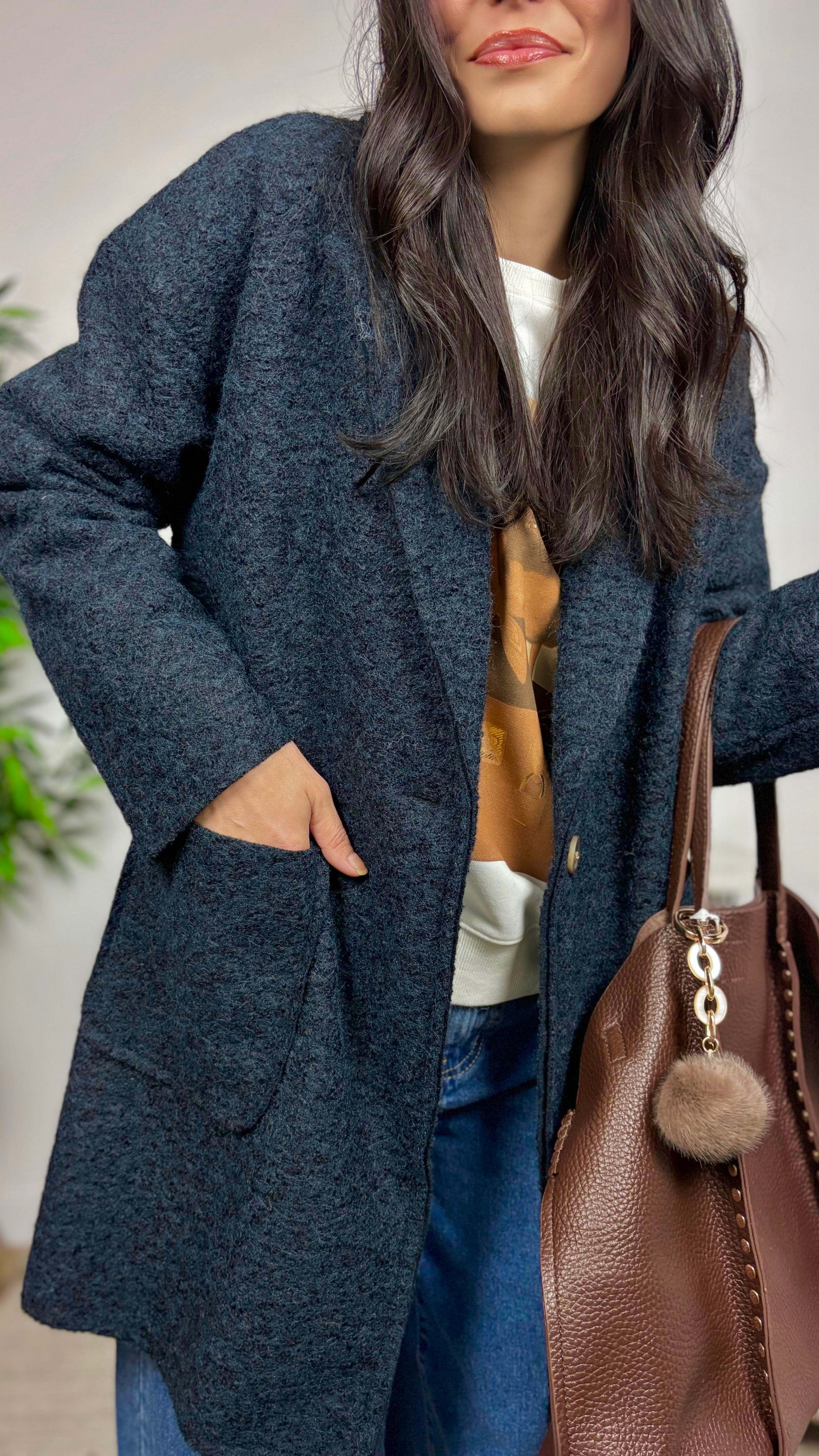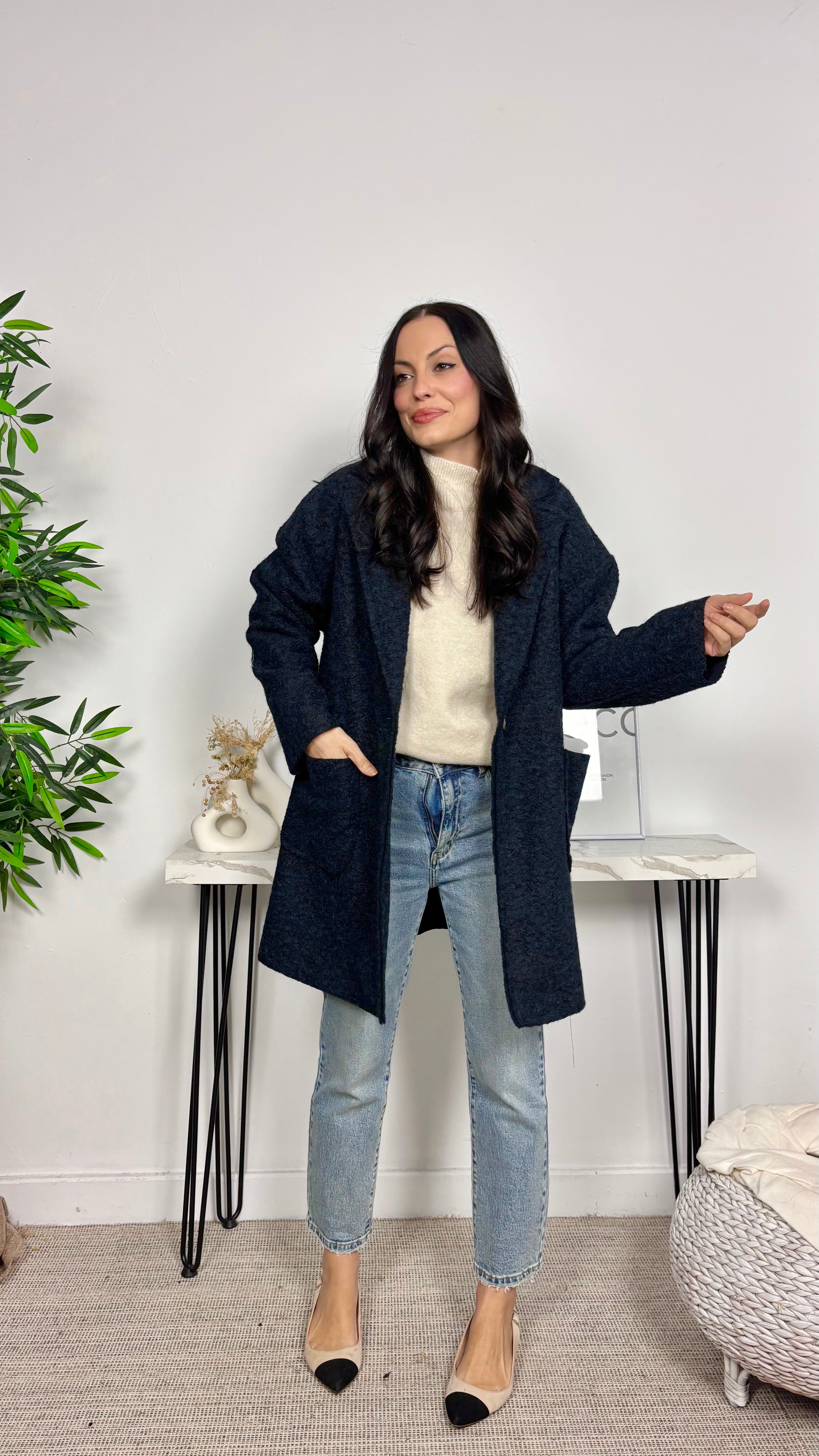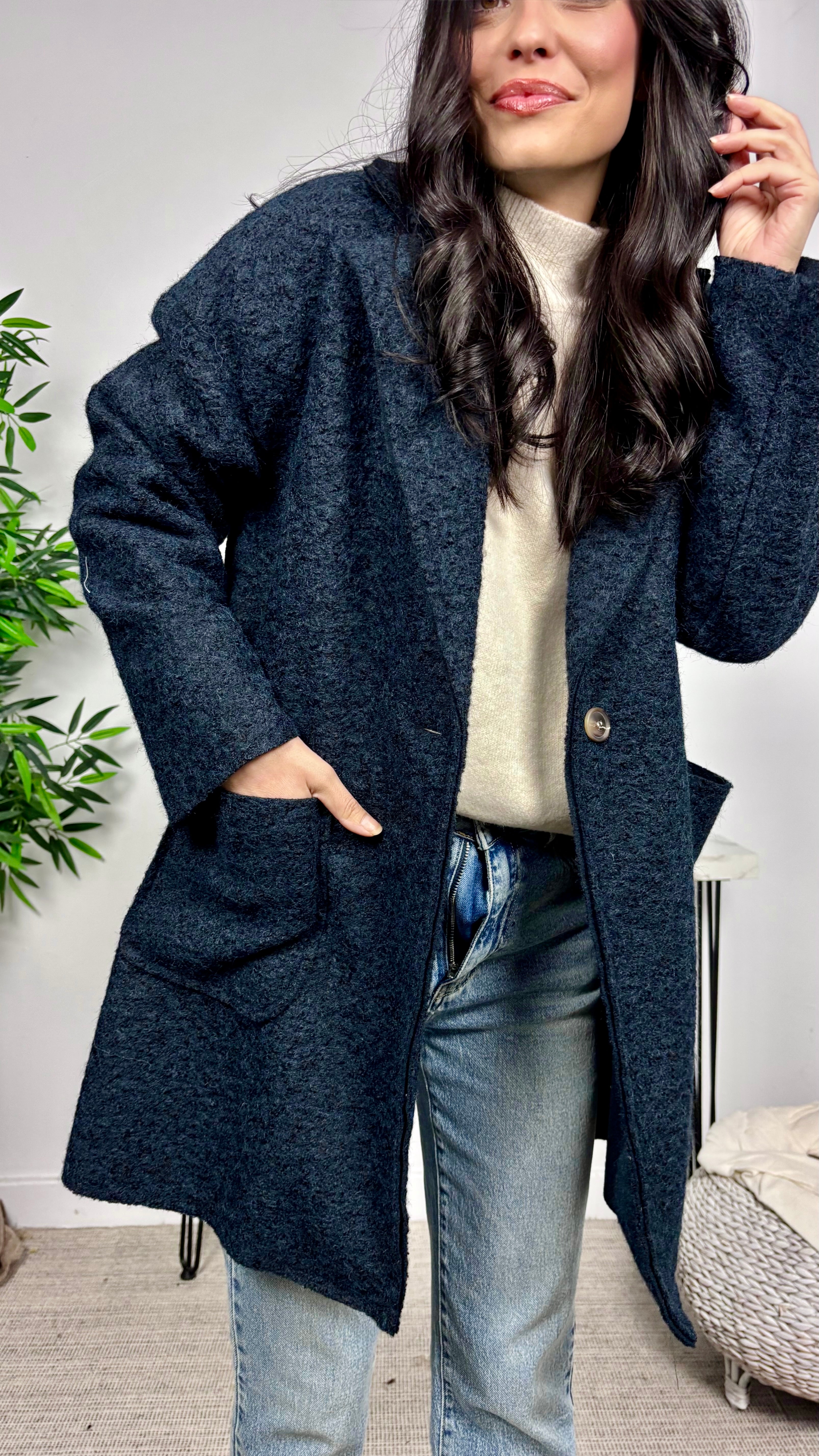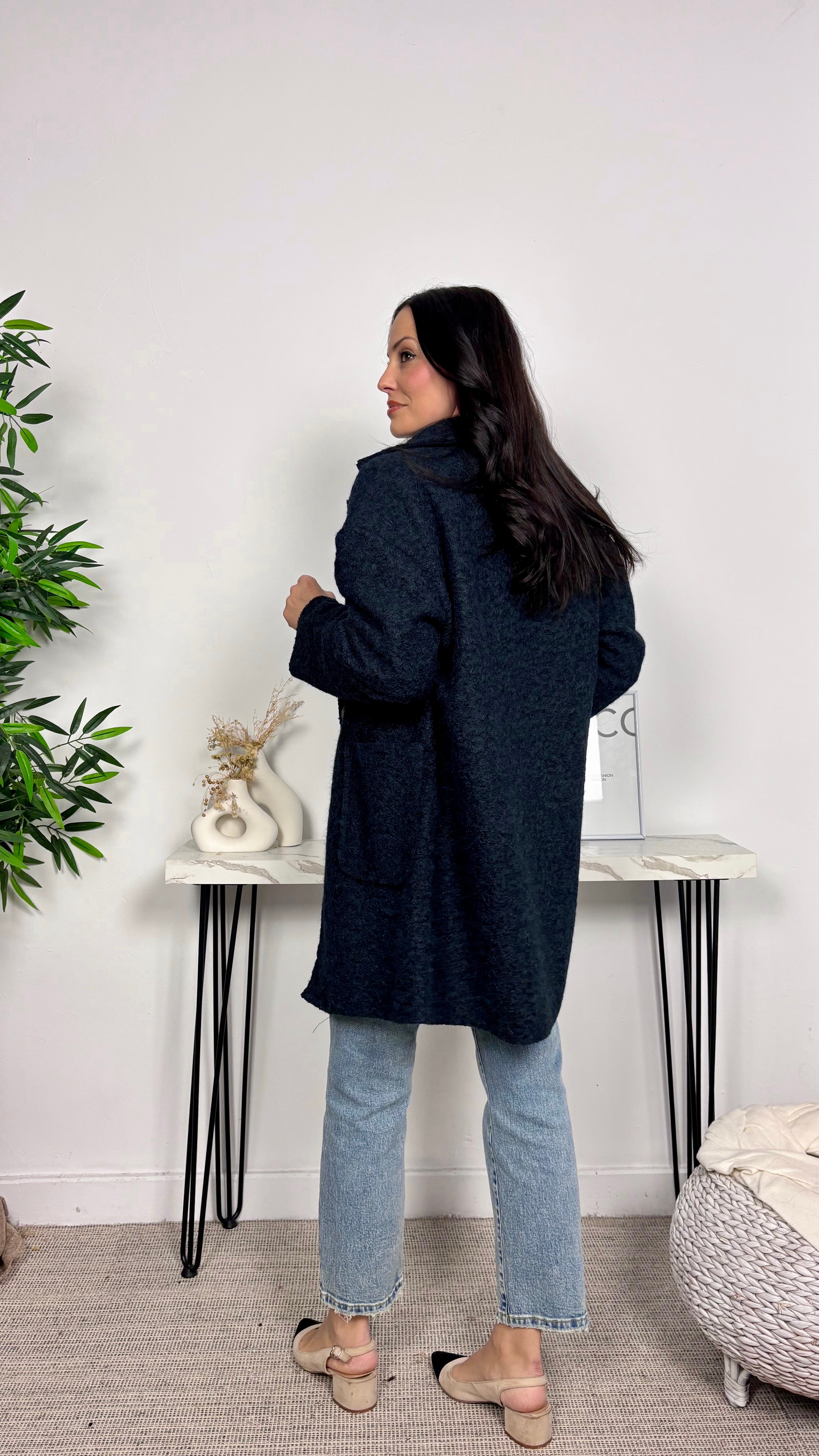 Abrigo con boton exterior e interior. De corte oversize. Bolsillos laterales. Talla única desde S hasta L....