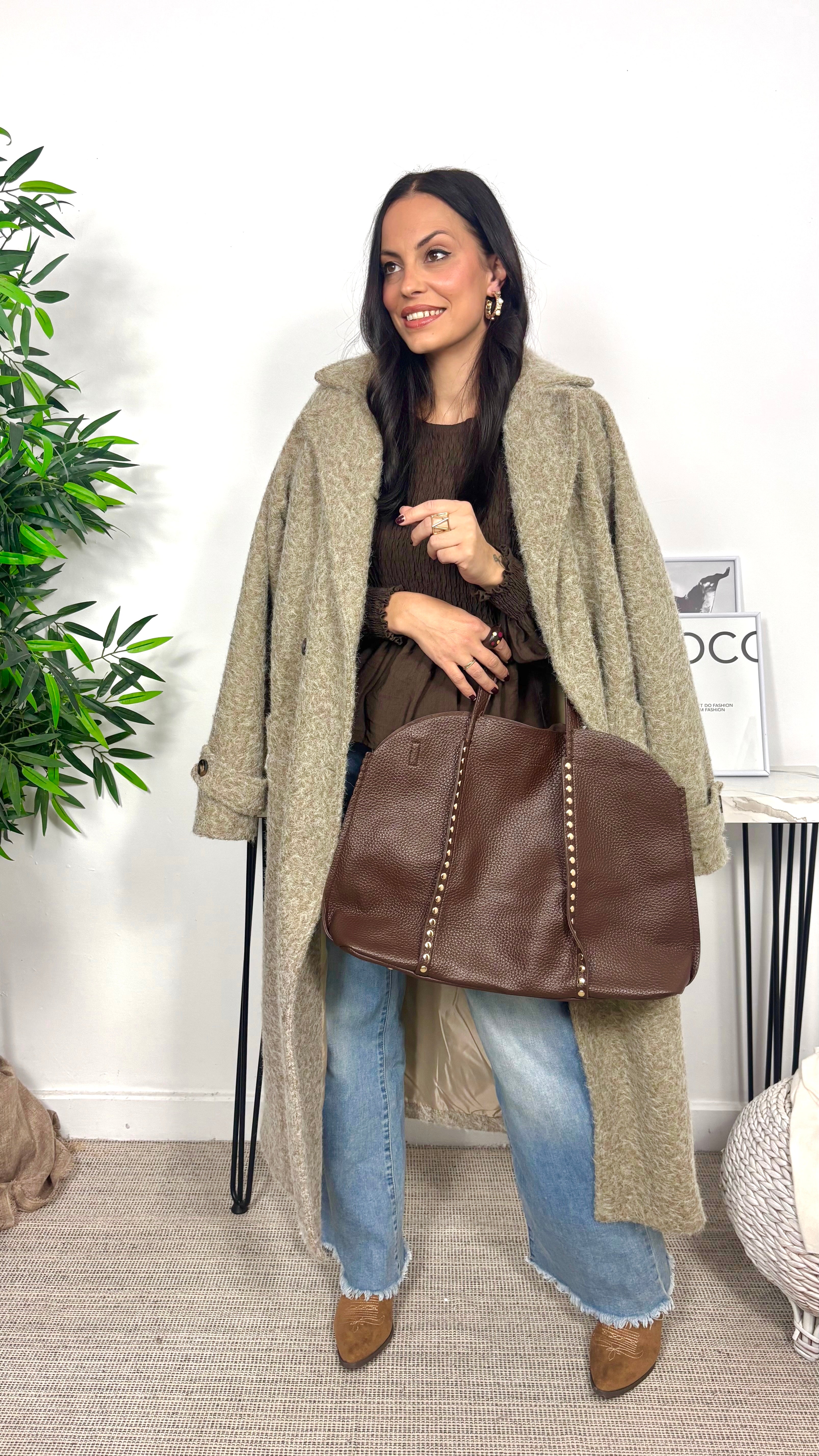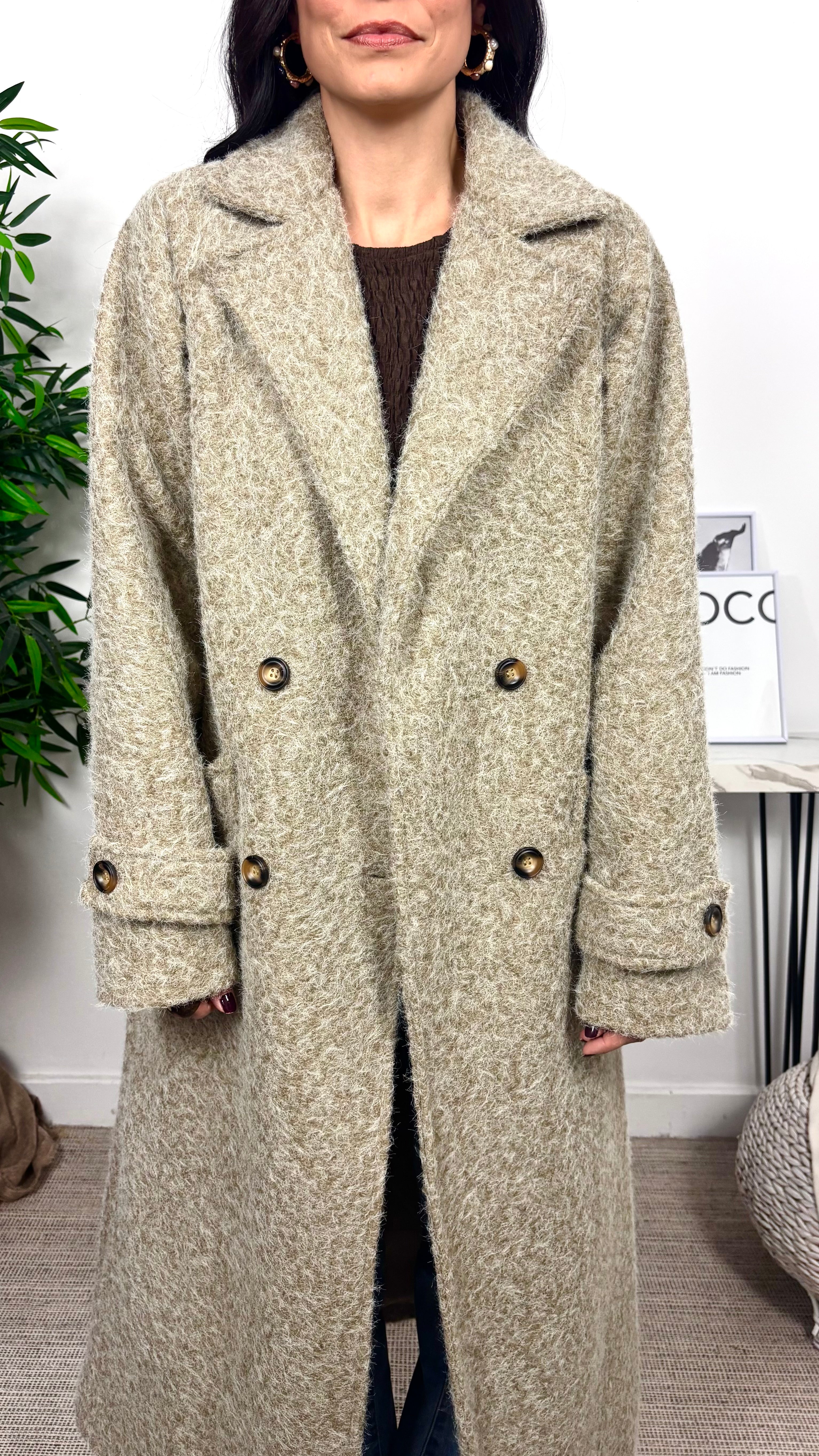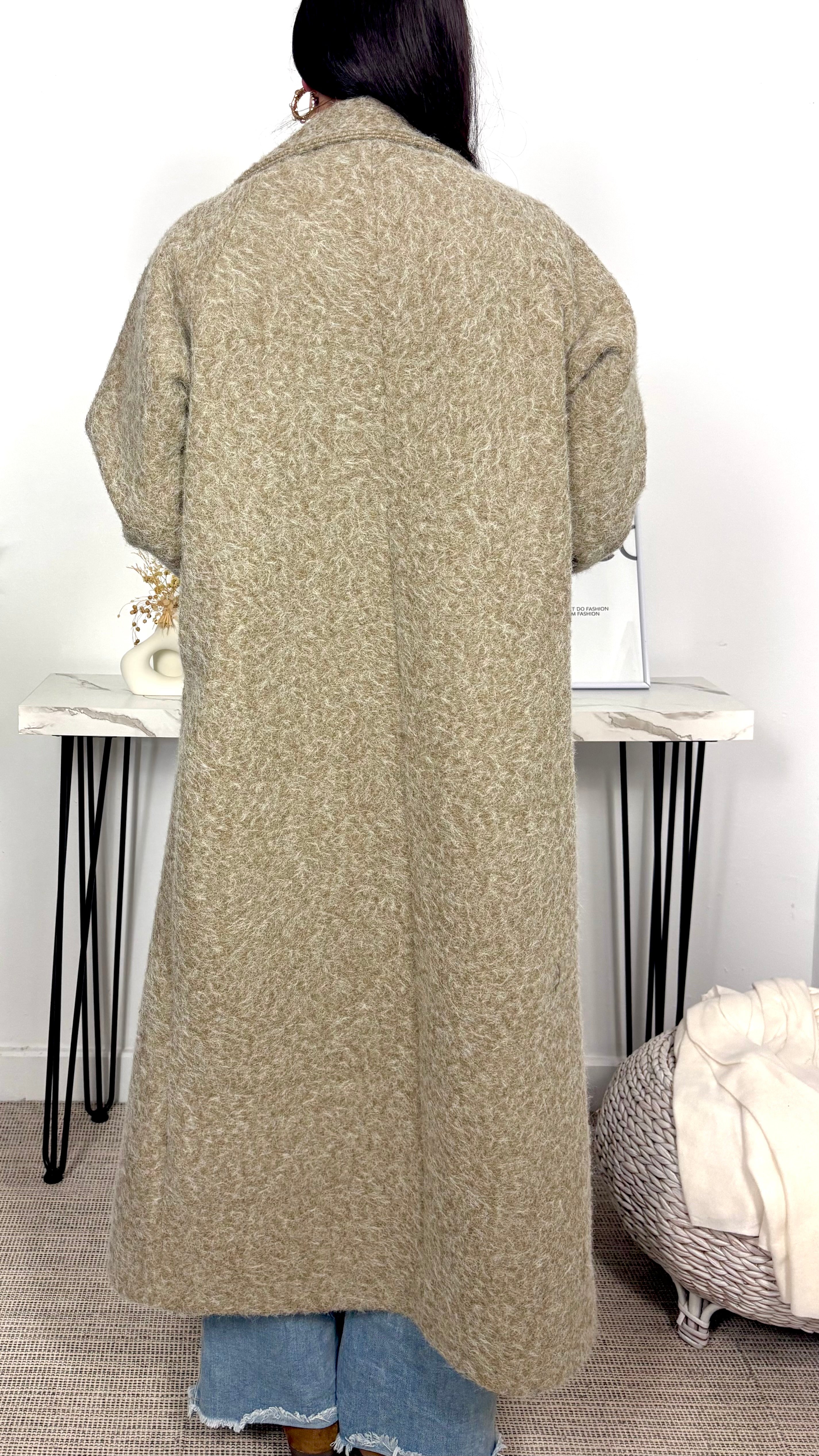 Abrigo de corte oversize largo. De doble botonadura. Botones Carey. Bolsillos laterales. Lleva detalle en el puño....