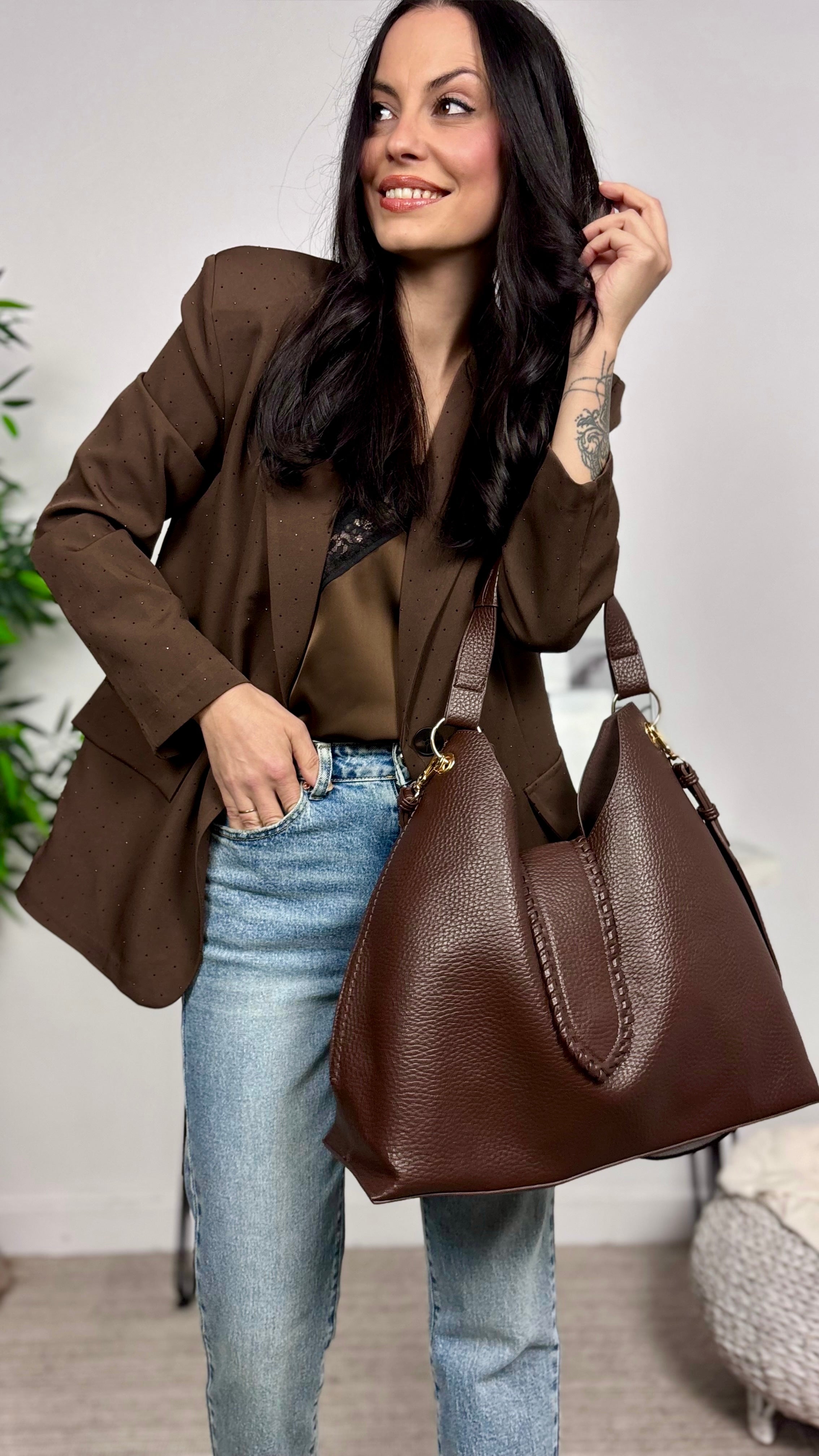 Blazer con mini brillos por toda la prenda. Con hombreras, bolsillos delanteros con solapas no utilizables.
