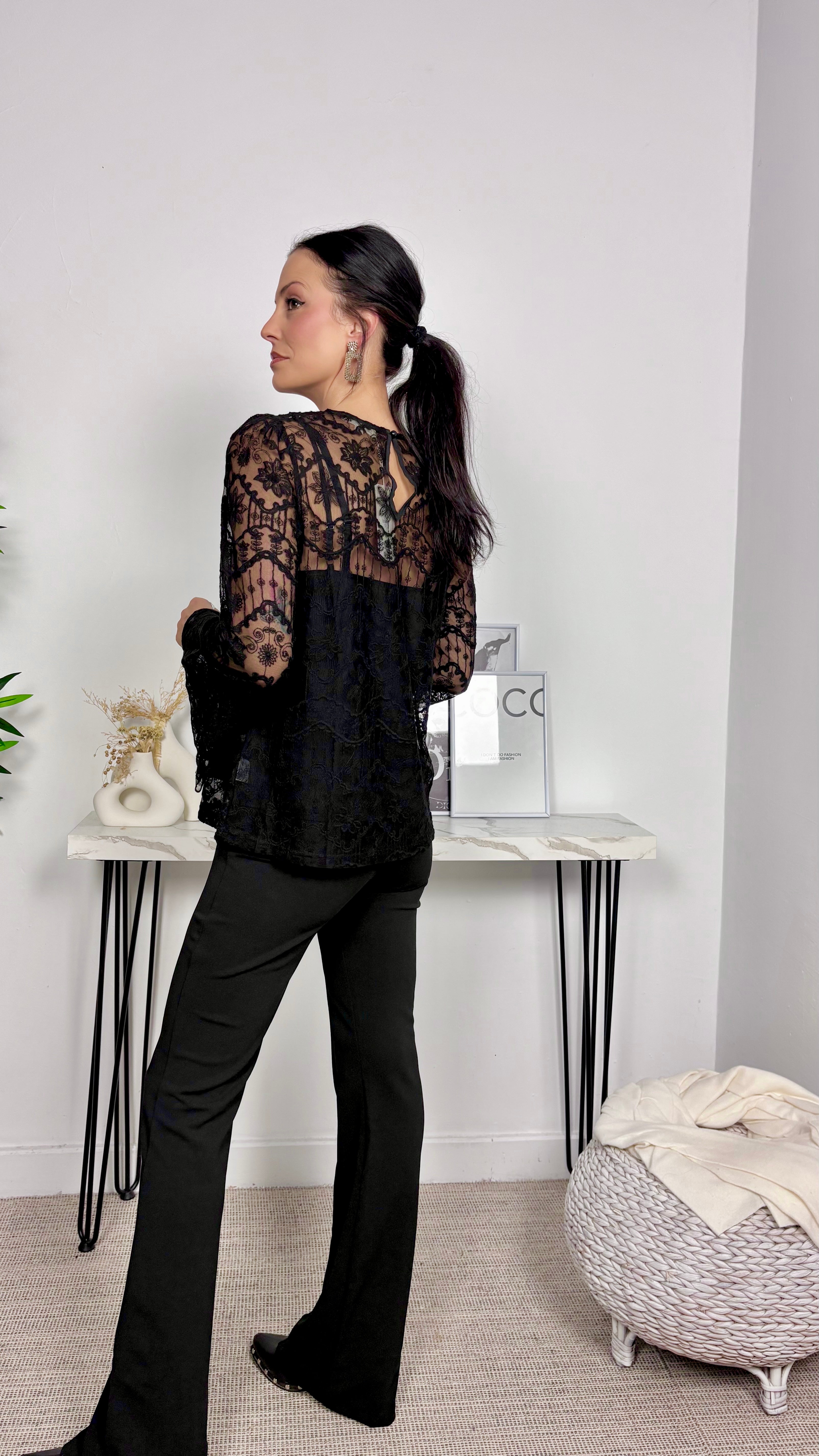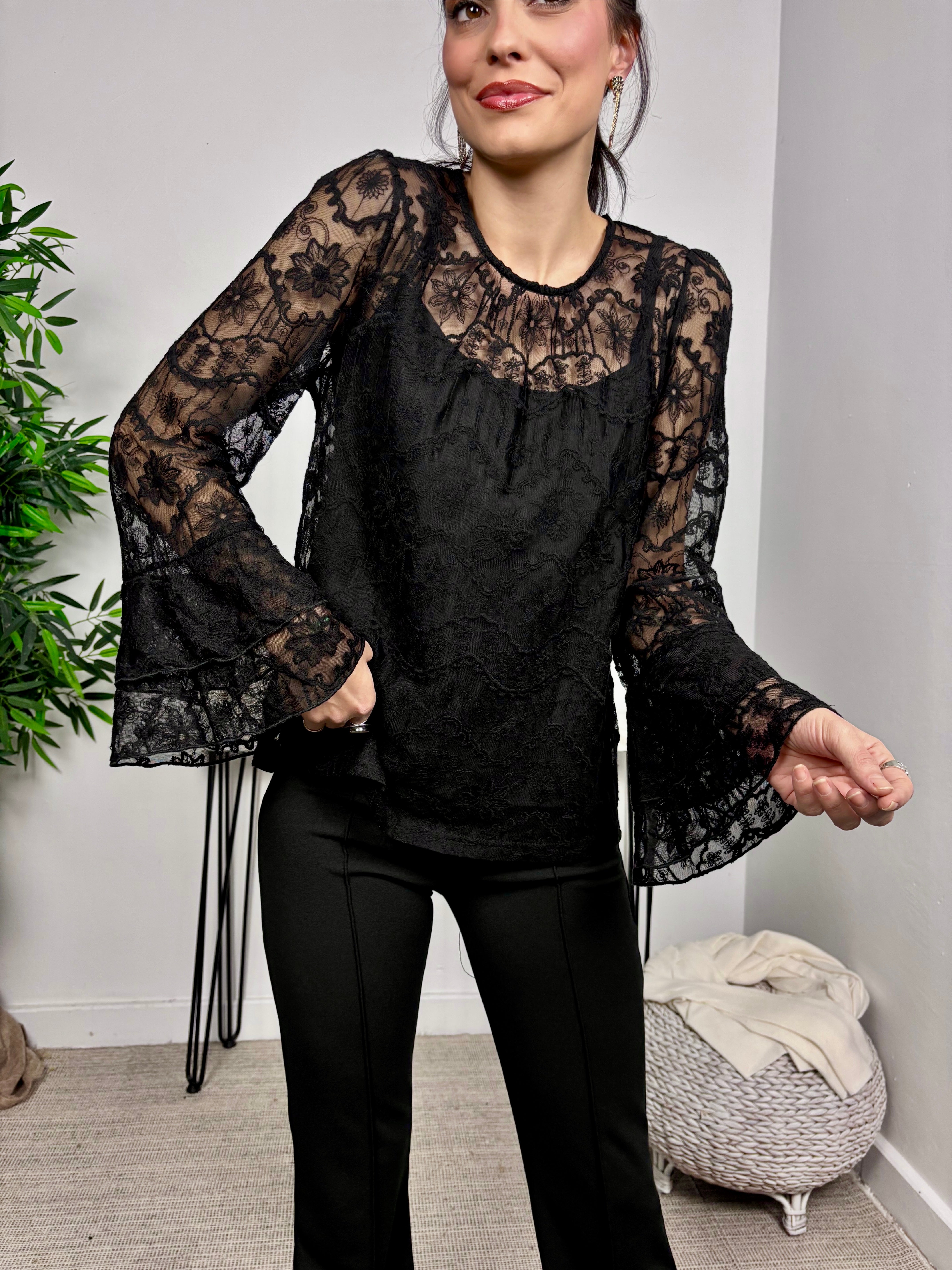 Blusa de encaje con puño acampanado. Trae camiseta interior de tirante regulable.