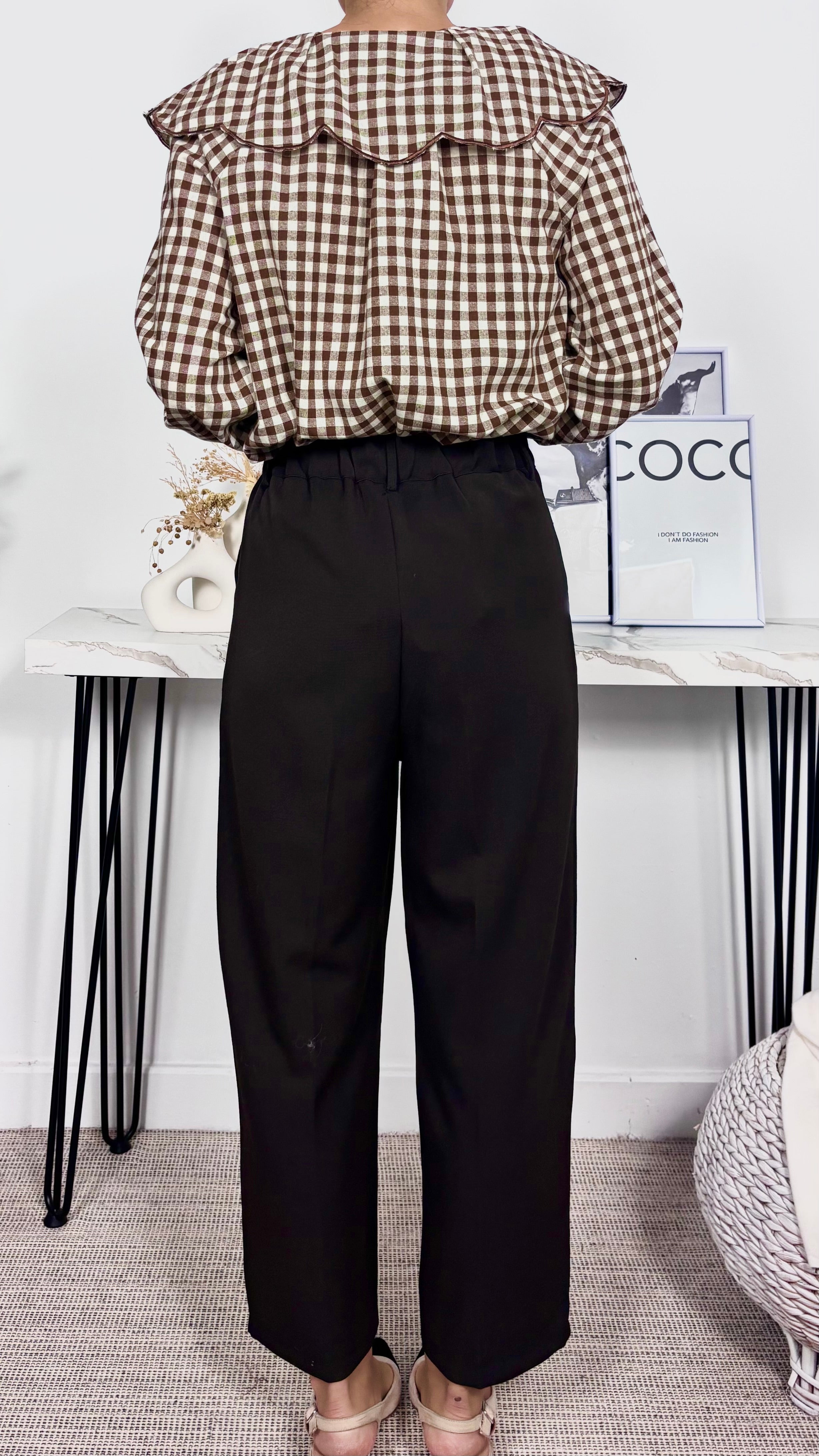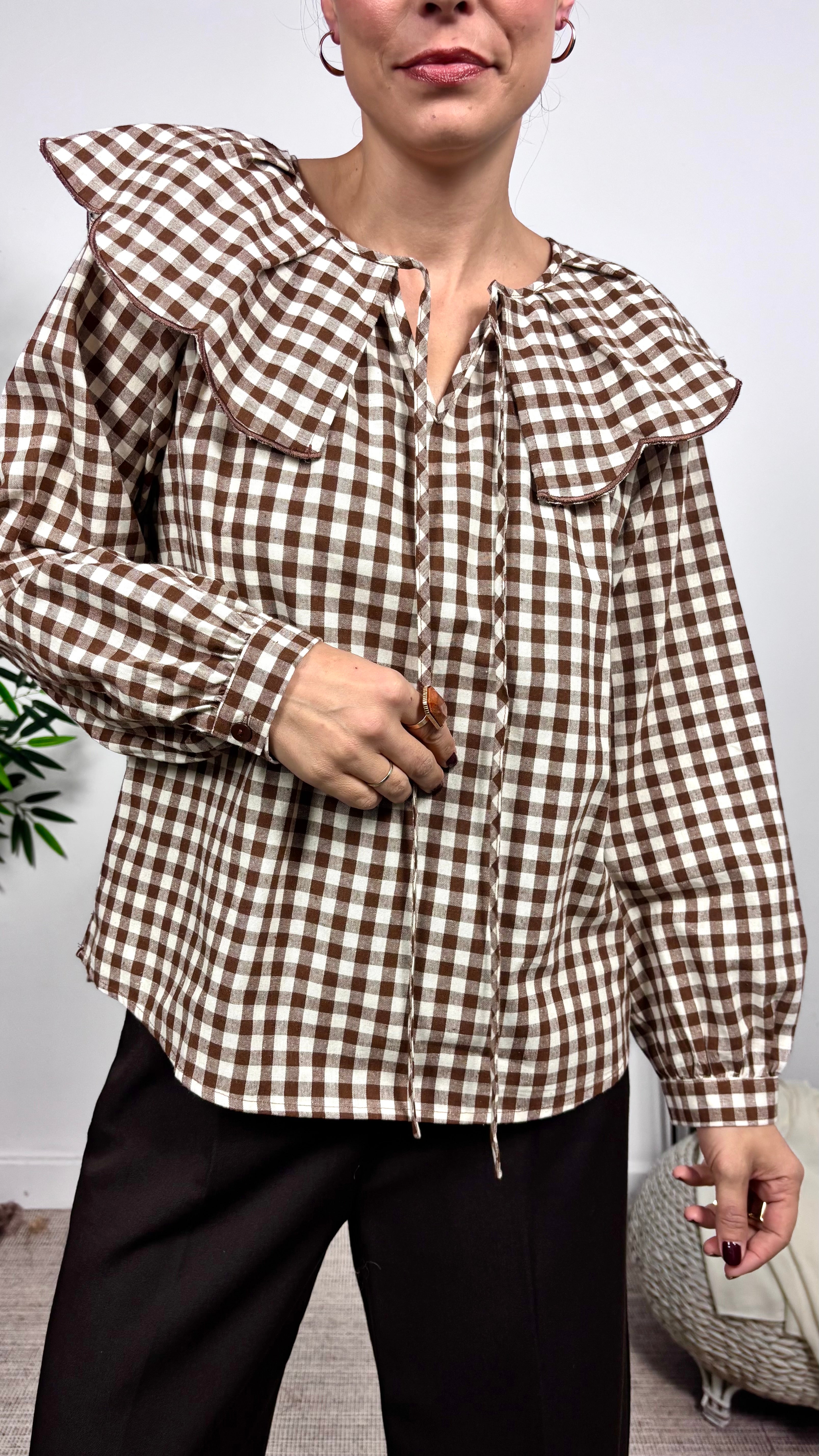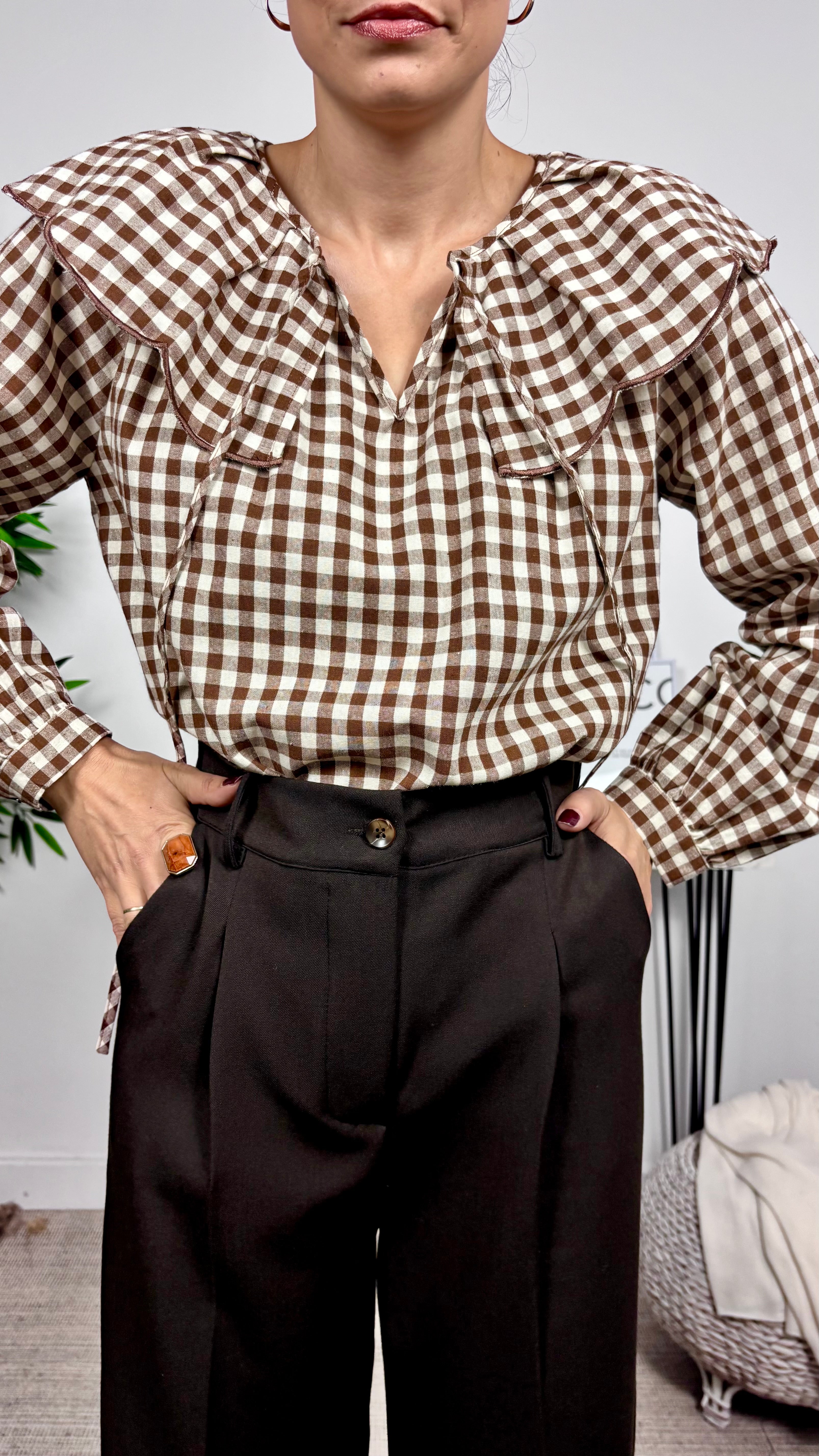 Blusa vichy marrón con cuello tipo bebe. Se puede desanudar. Boton en la manga. Corte recto.