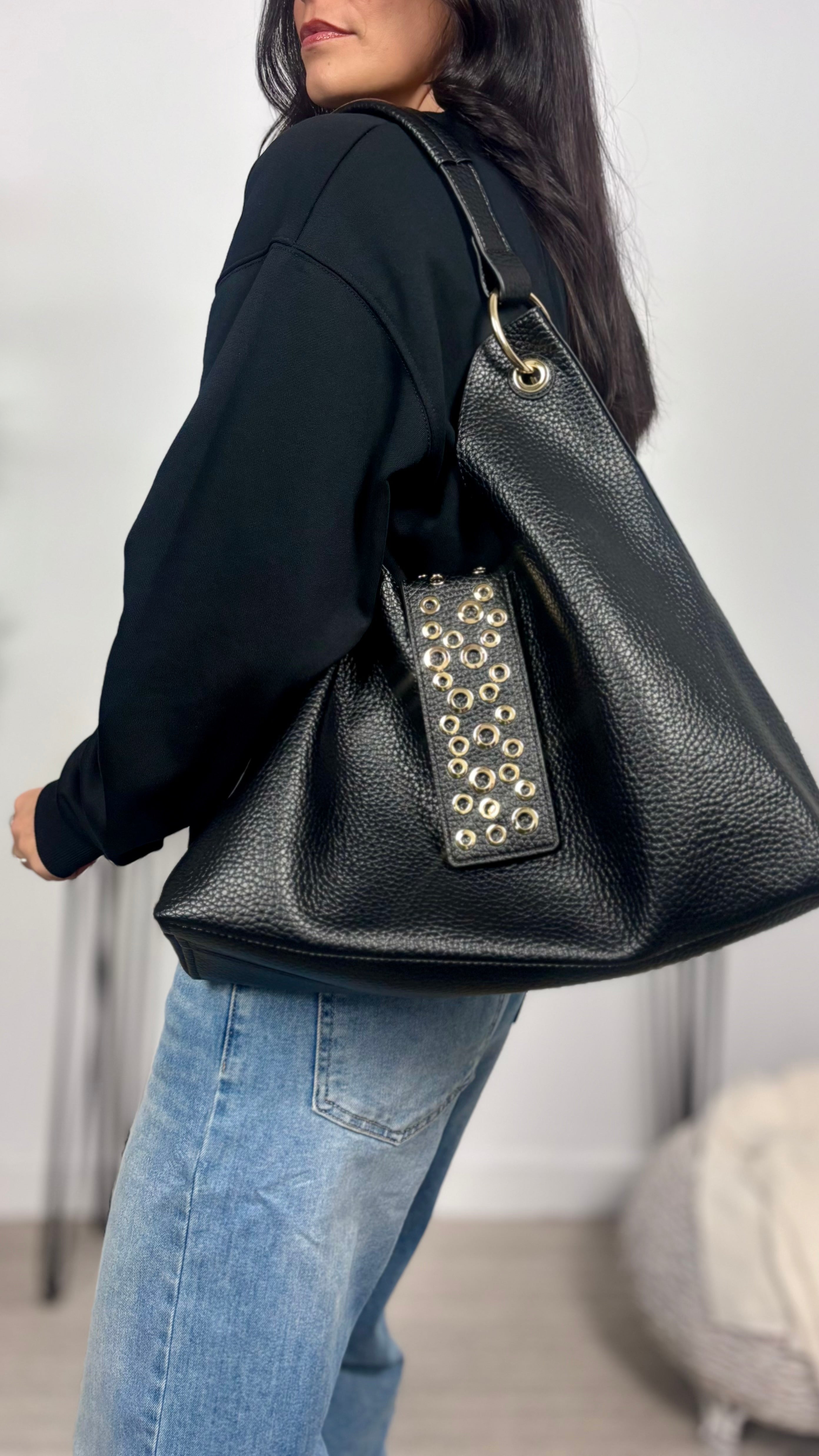 COMPOSICIÓNBolso de hombro con asa ancha. Cierre en el centro con detalle de tachuelas. Incluye asa larga para llevar tipo bandolera. Cierre con botón imán. Neceser interior. Forro de ante. Bajo bolso rígido que guarda la forma.