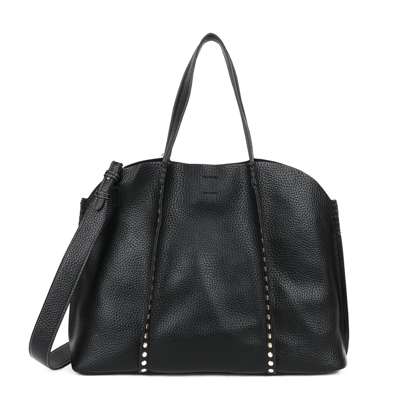 Bolso Maxi de polipiel vegana. Con tachuelas doradas en ambas partes. Detalle de cadena con pompom. Neceser...