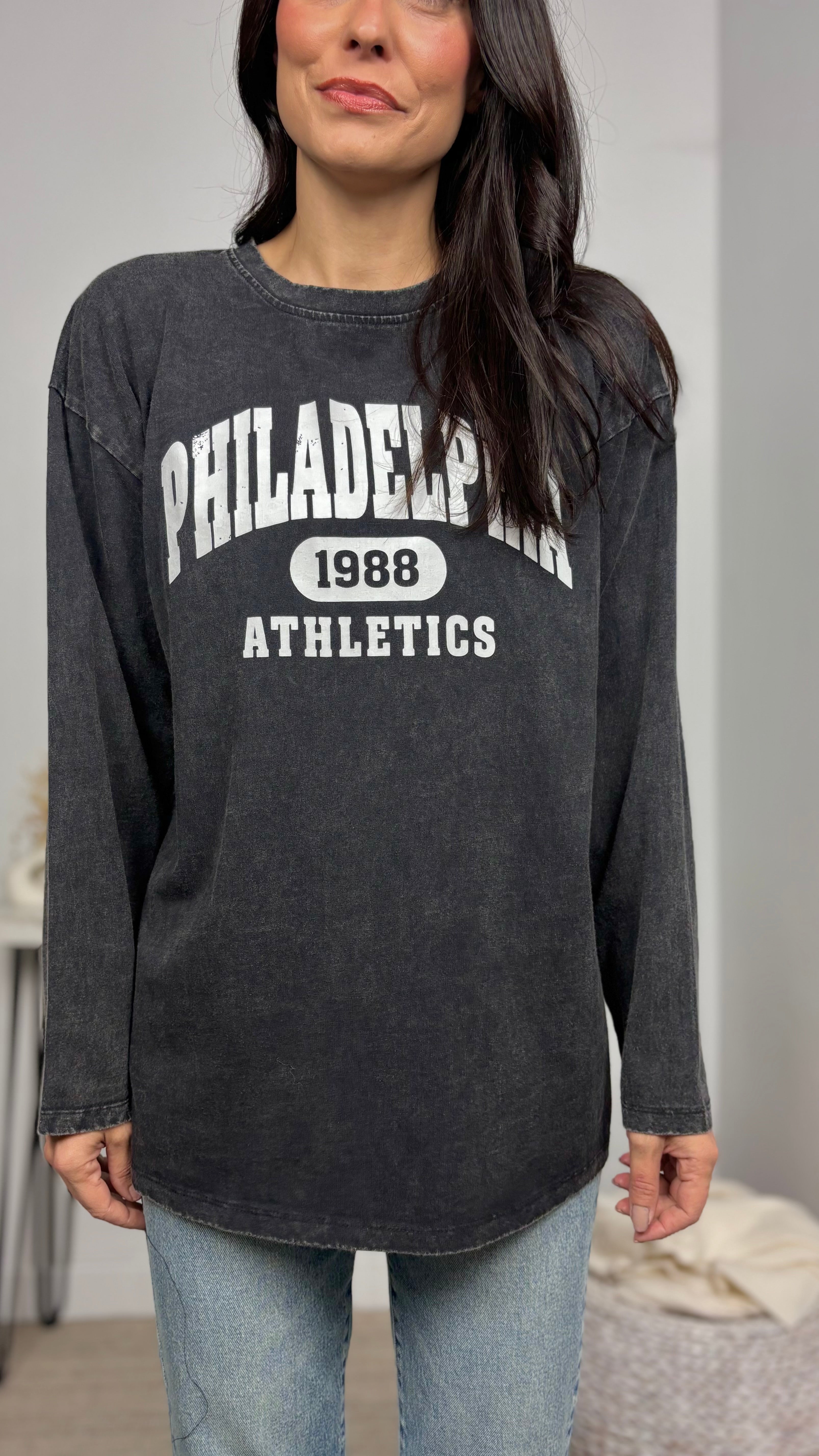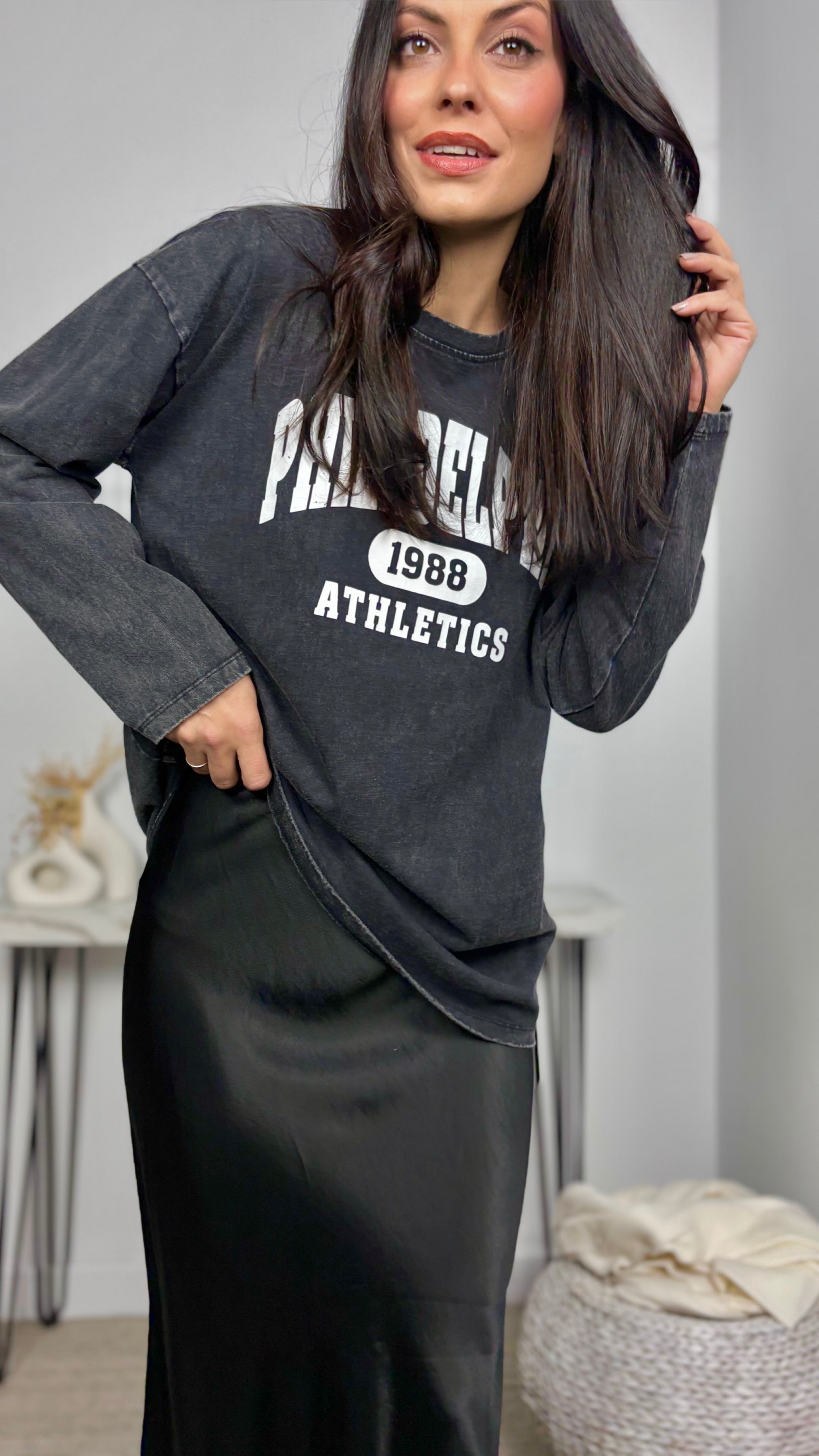 Camiseta delavada con letras en blanco, corte oversize.