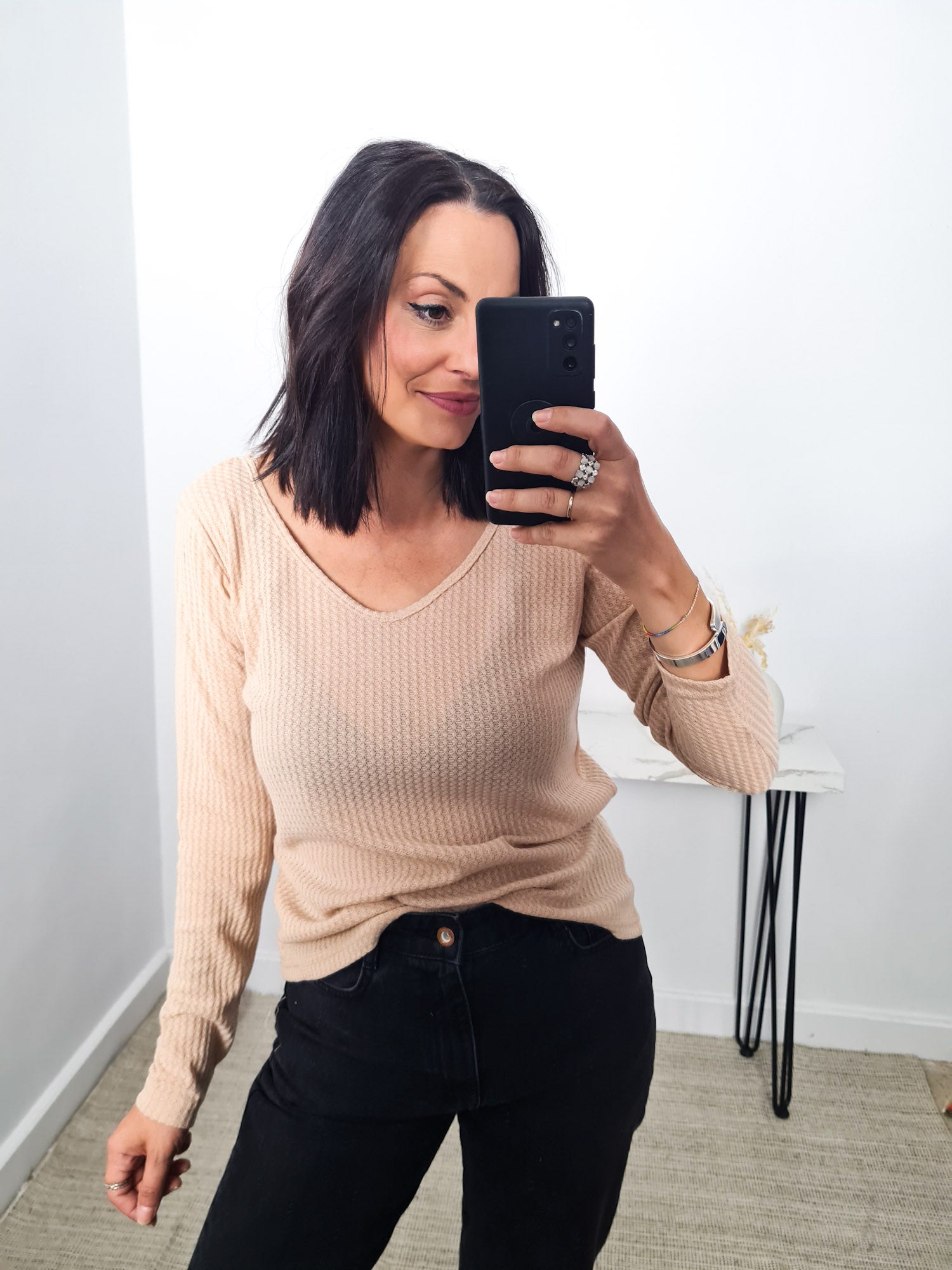 Camiseta de manga larga con escote pico y detalle de encaje en la espalda. Tejido gofrado.