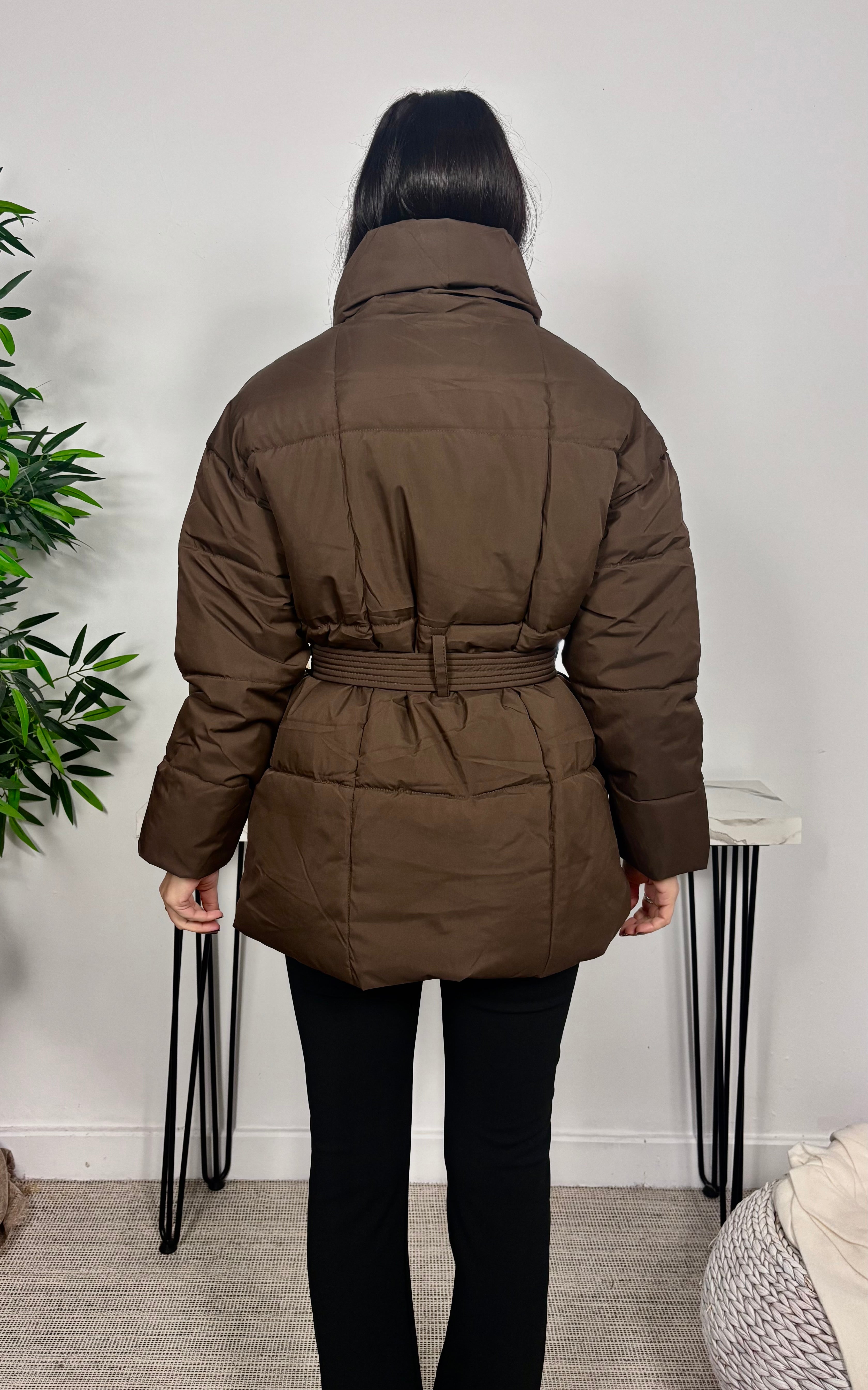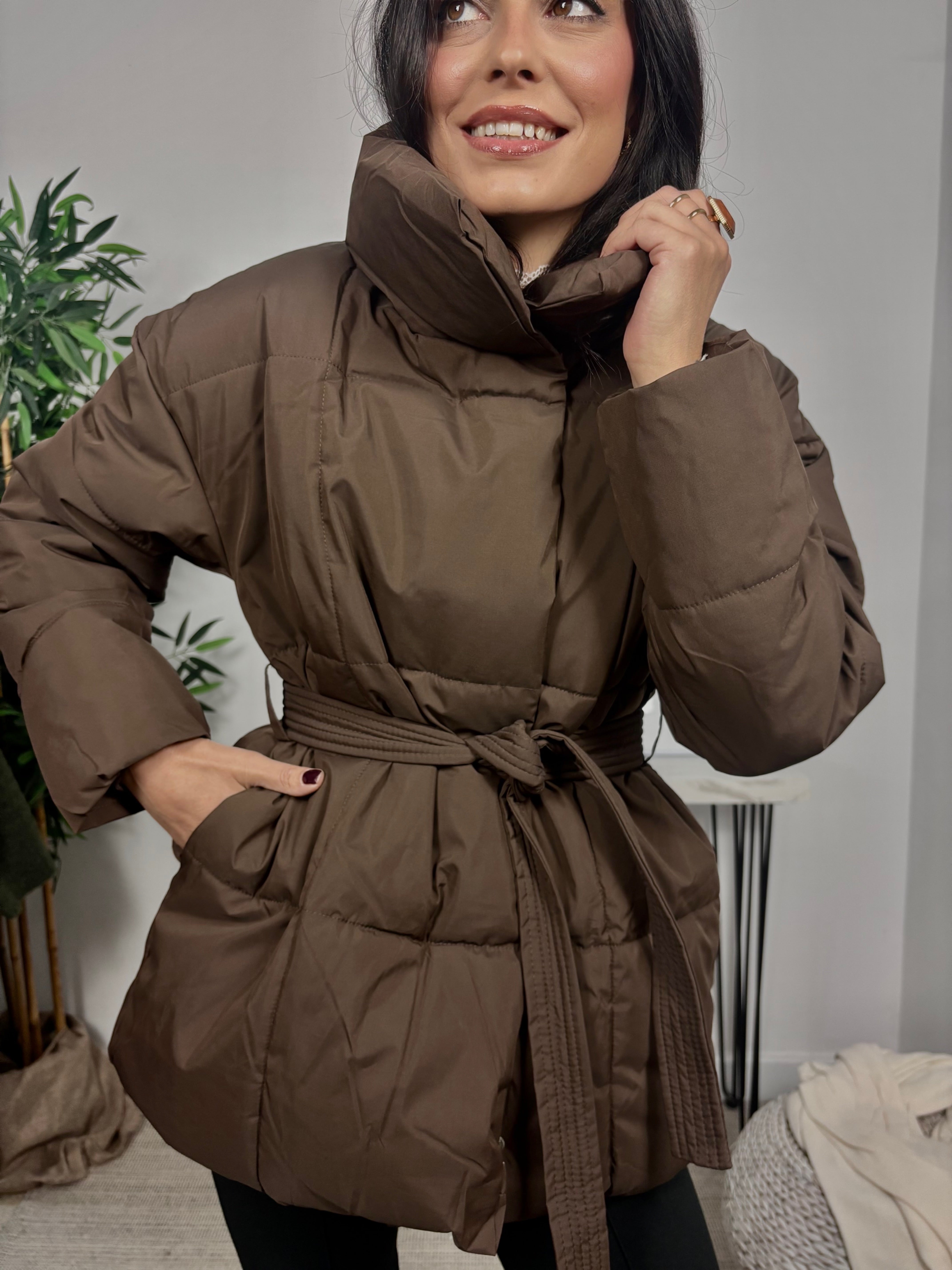 Cazadora acolchada con cinturón. Cuello alto o doblado. Cierre con broches y cremallera. Bolsillos laterales.