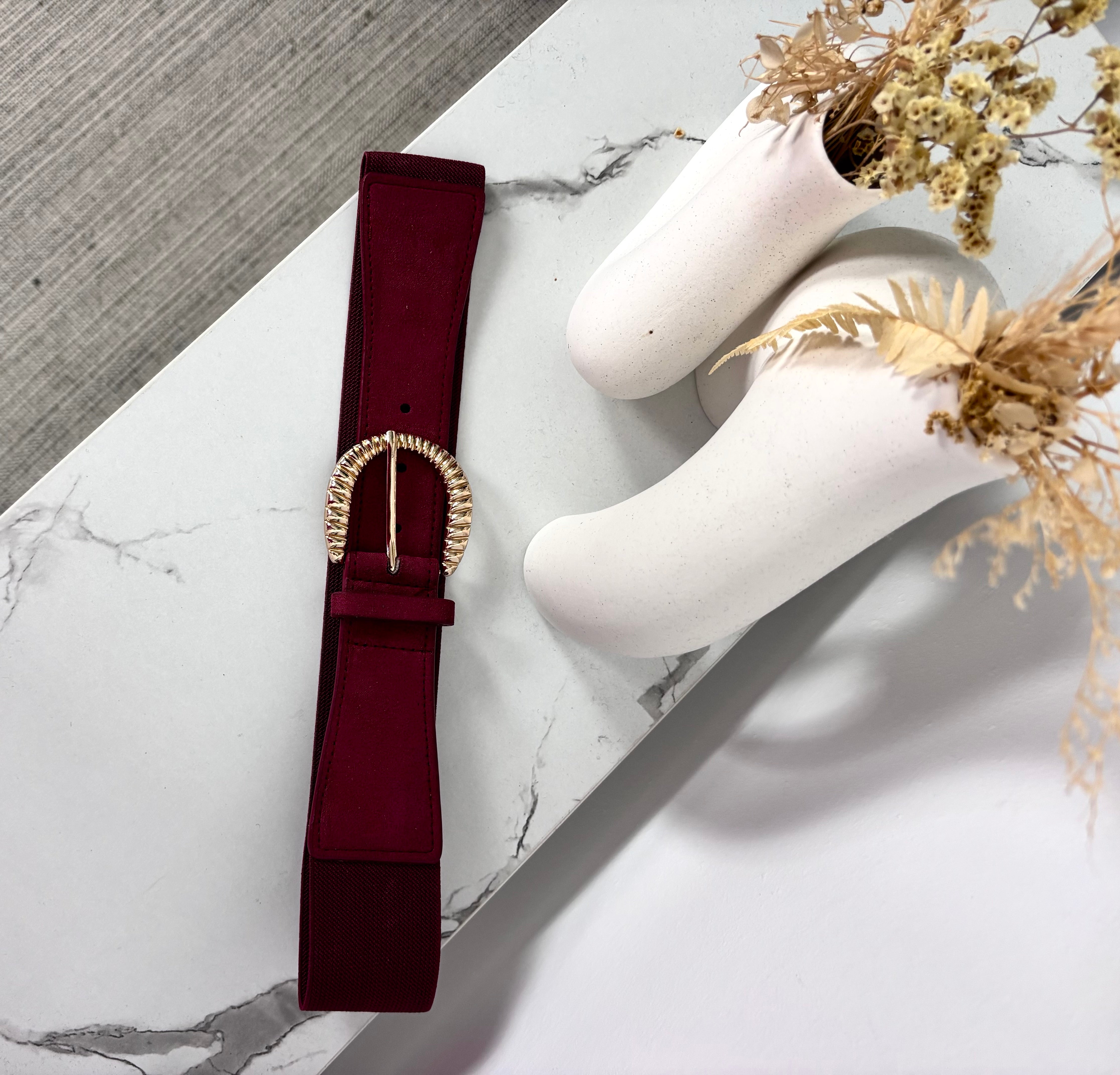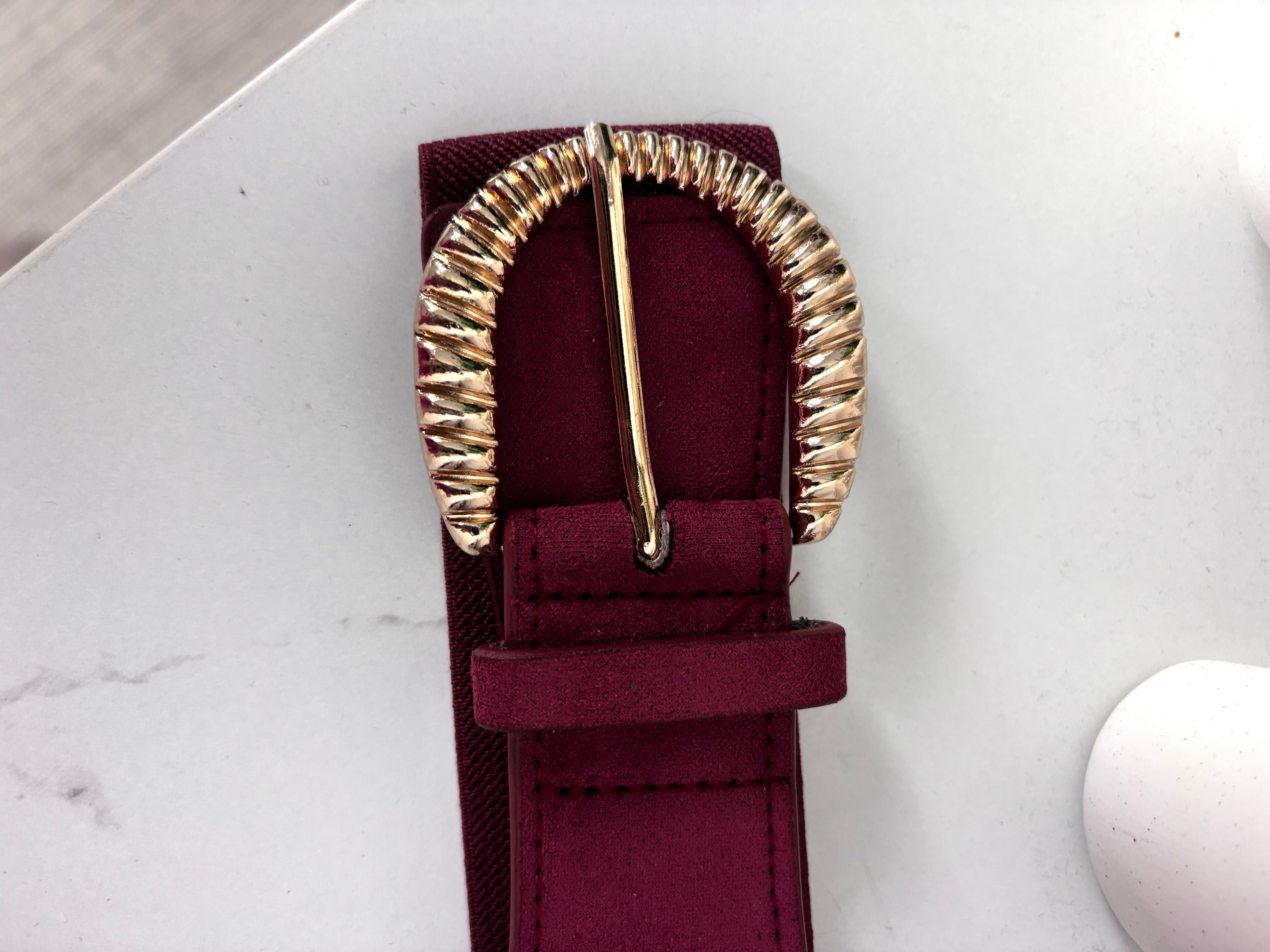 Cinturón con parte de goma elastica y parte de antelina. Hebilla dorada. Para poner con vestido o pantalón.
