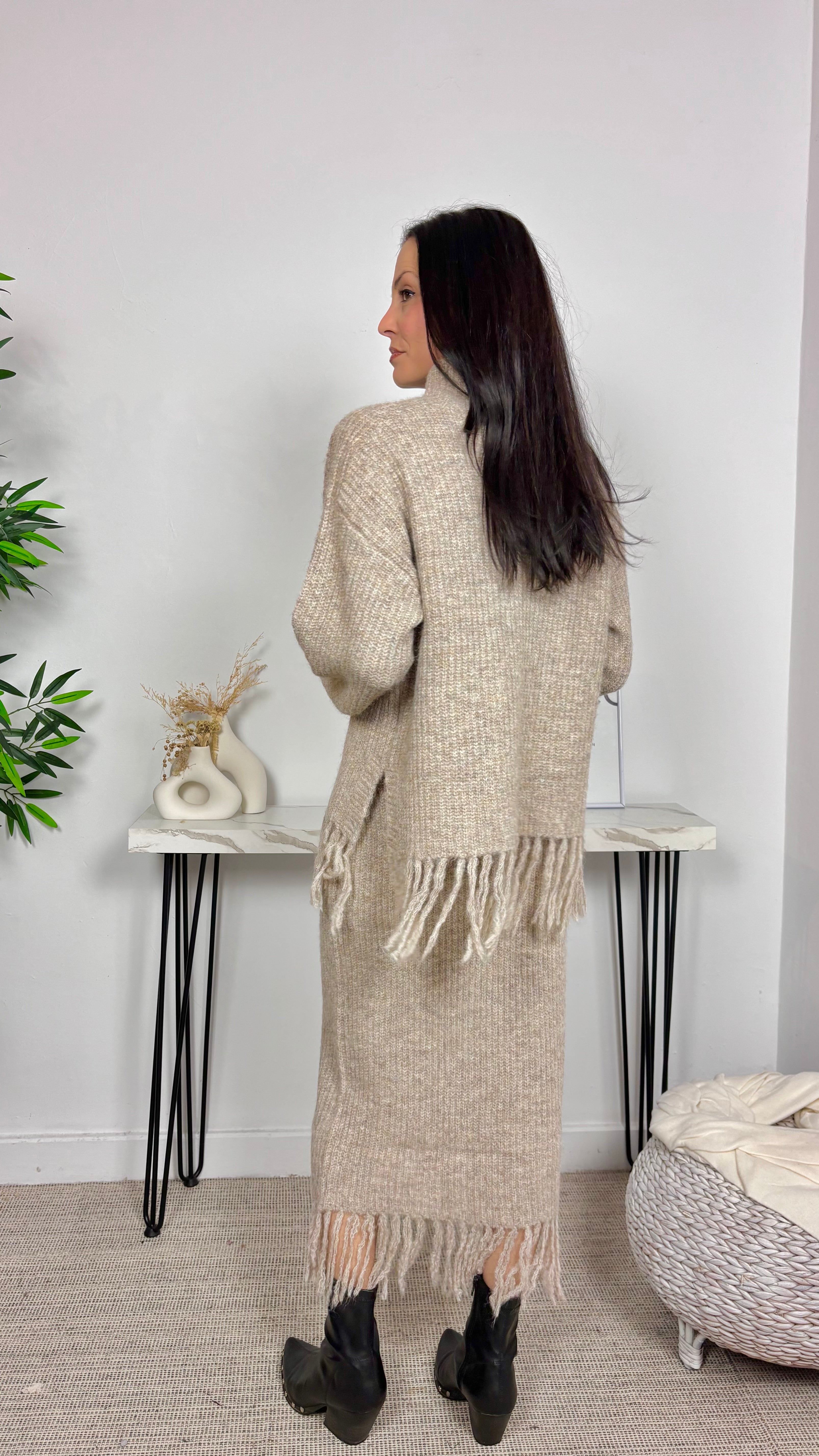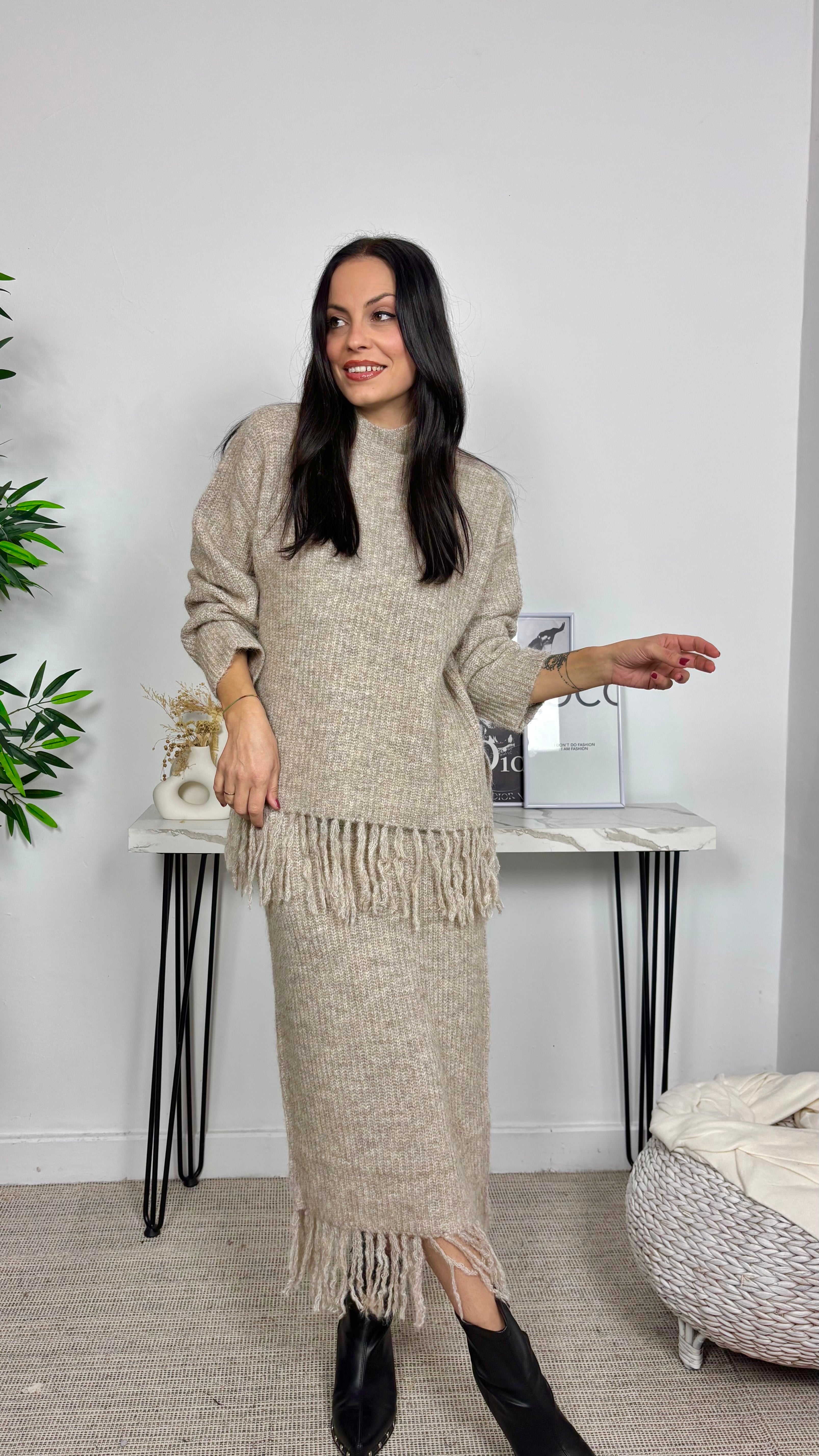 Conjunto de punto jaspeado, con cuello perkins. Flecos en el bajo de la falda y del jersey. Goma en la cintura de la falda.