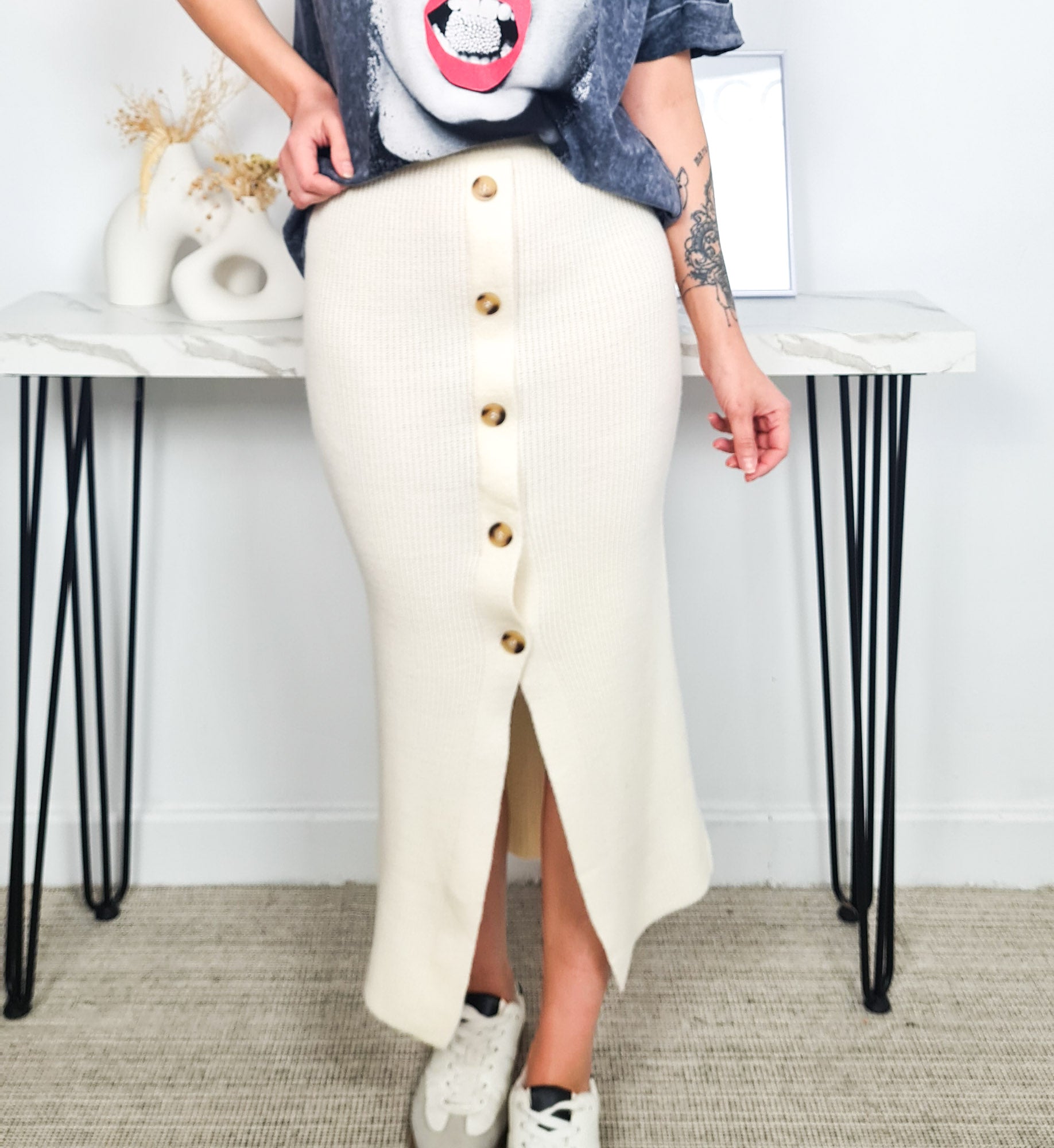 Falda de punto abotonada con abertura delantera,. Muy elástica.