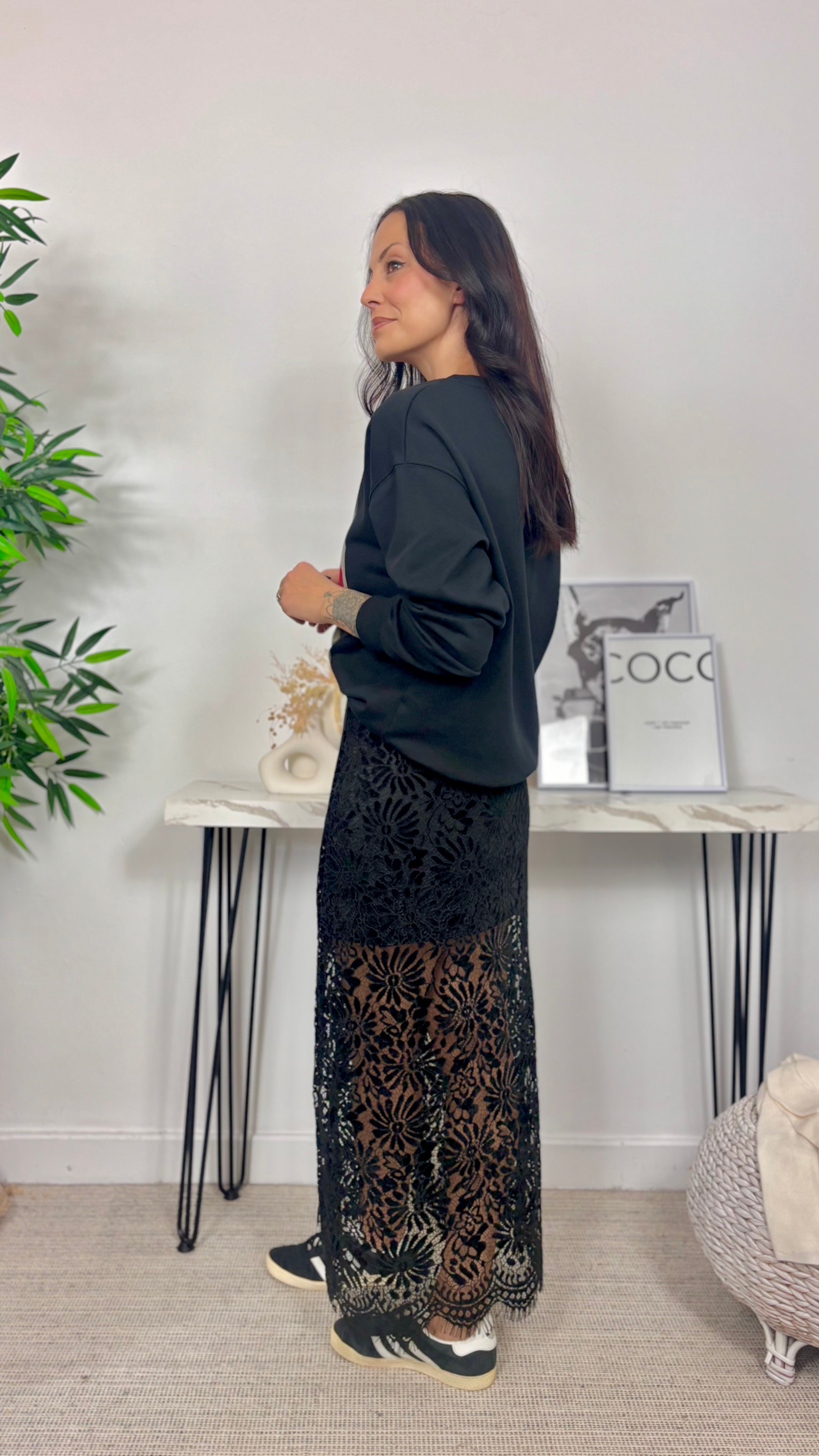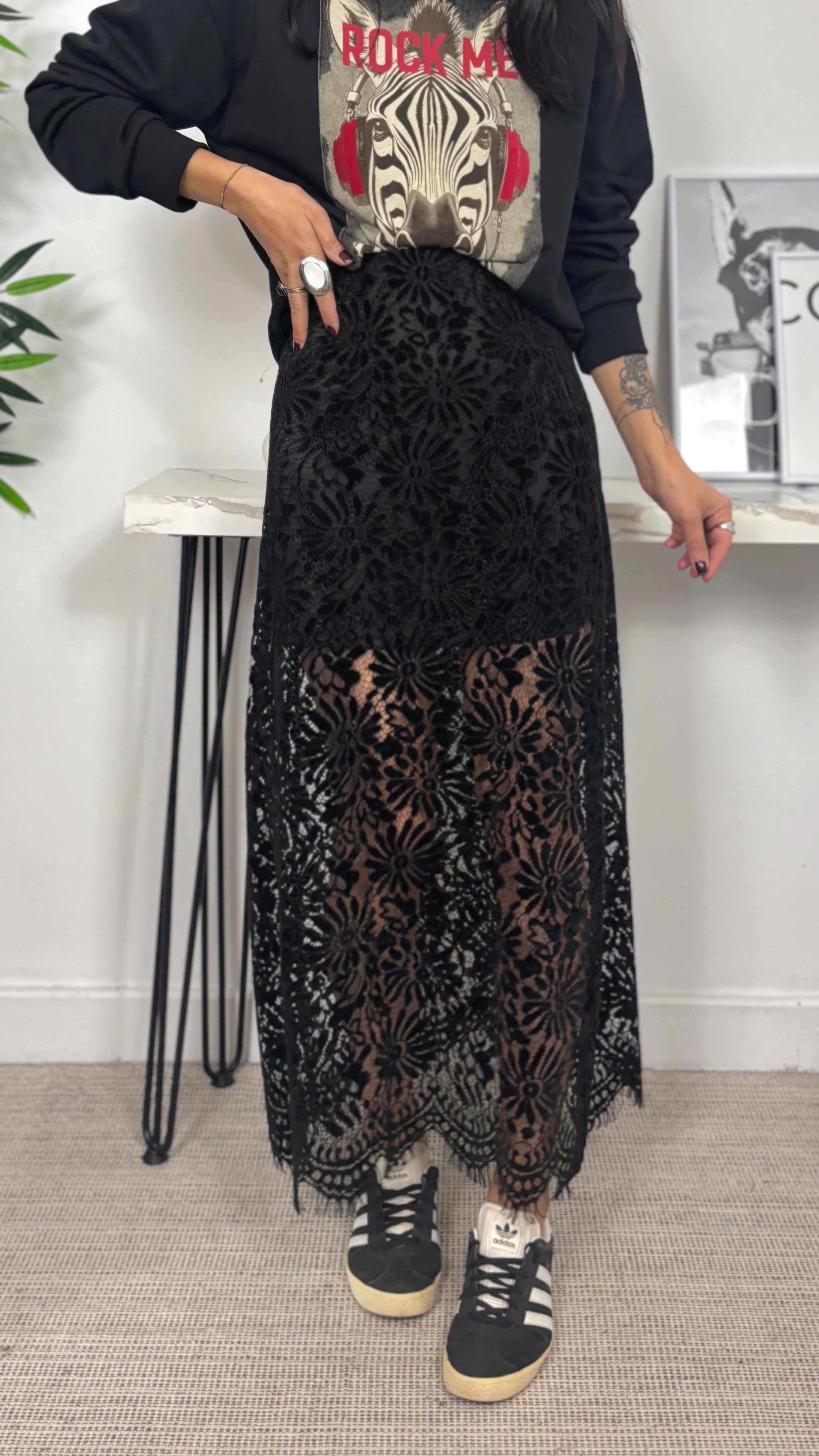 Falda de encaje con tejido aterciopelado. Lleva forro hasta por encima de la cintura. Cintura Elastica.