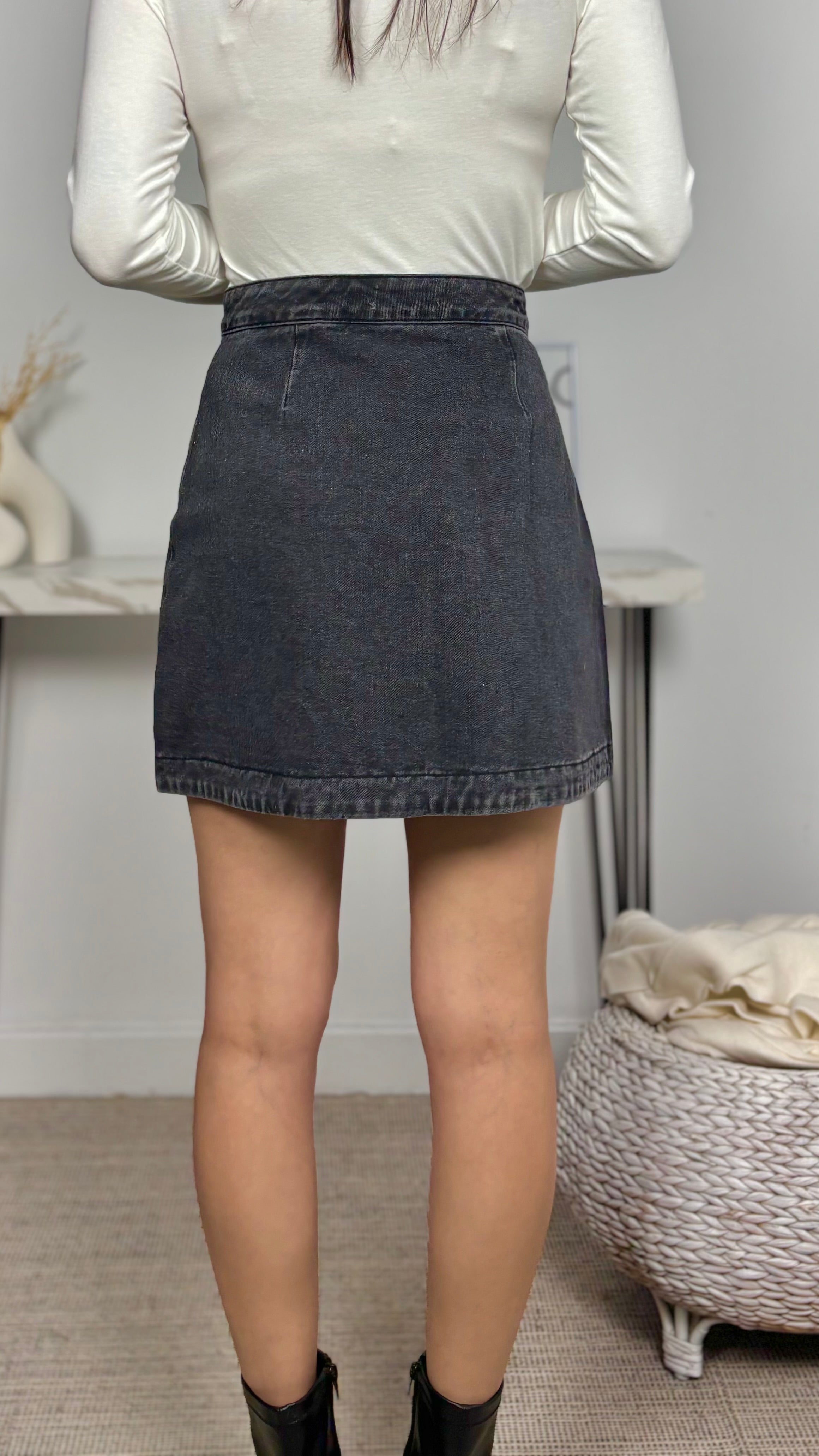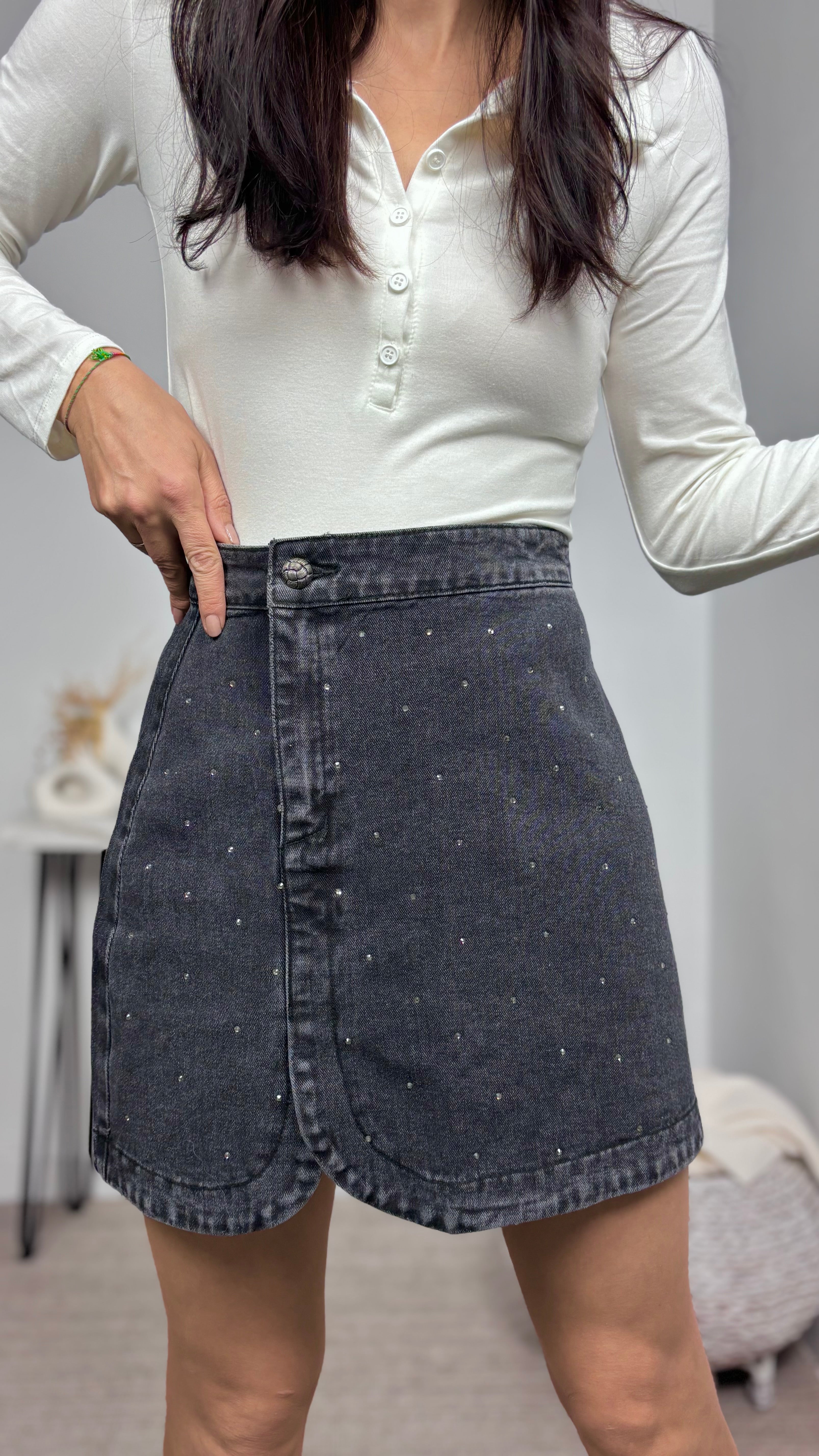 Falda Vaquera en Gris delavado, con detalles de strass por la parte delantera. Cierre con boton y cremallera.