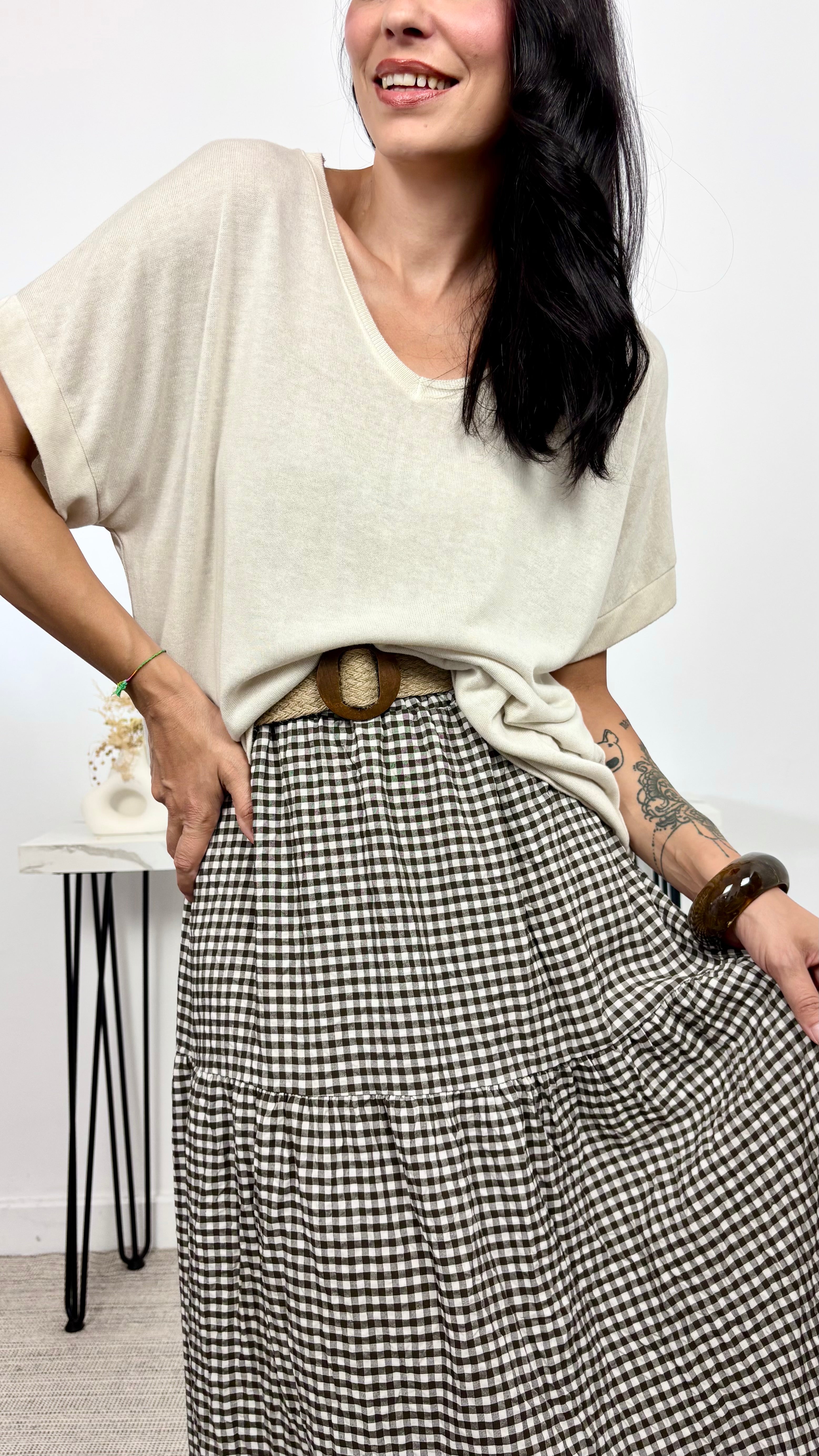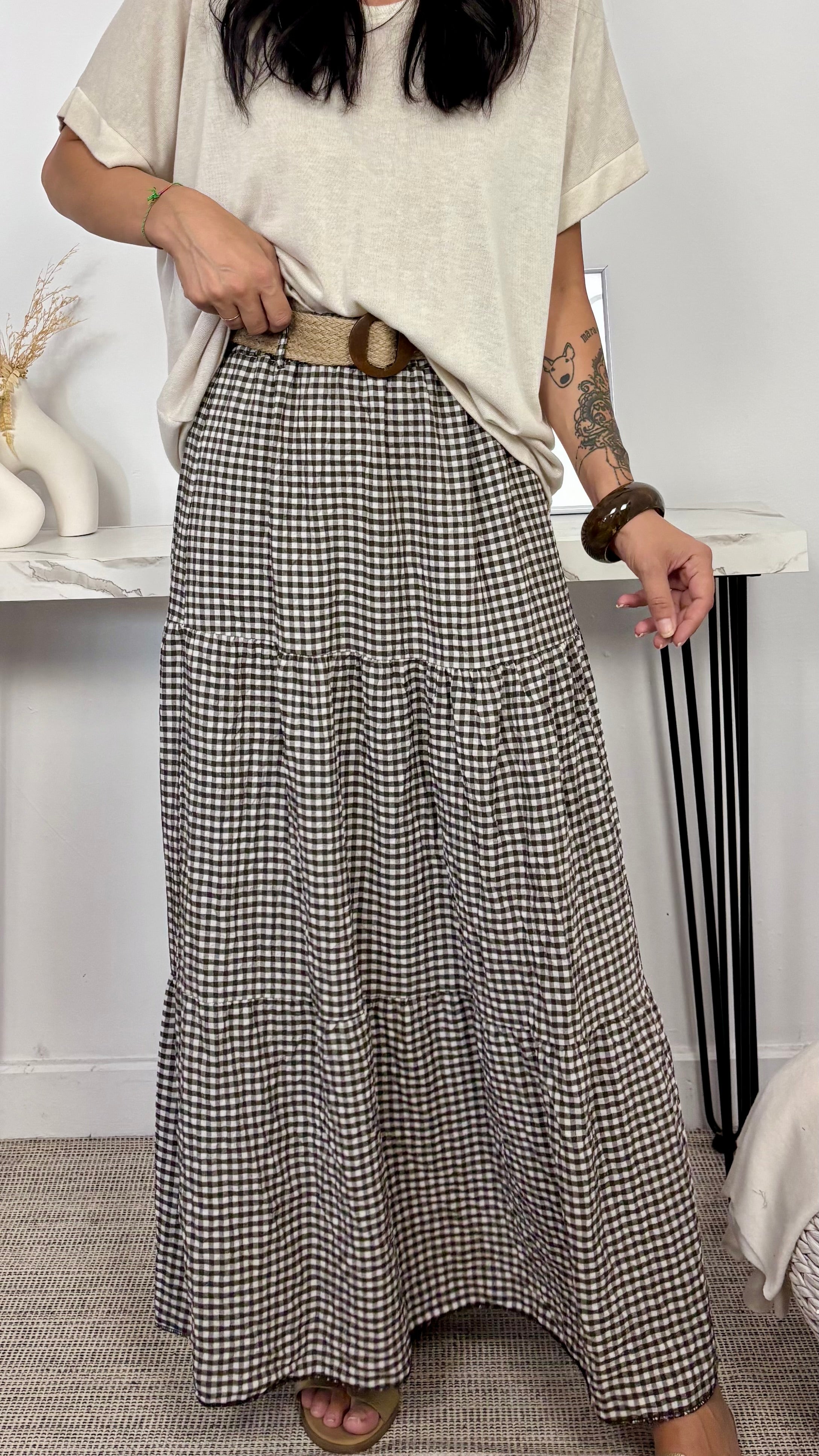 Falda con volantes vichy con cinturón de rafia incluido. COMPOSICIÓN  100% Algodón Hecho en Italia Medidas  Cintura...