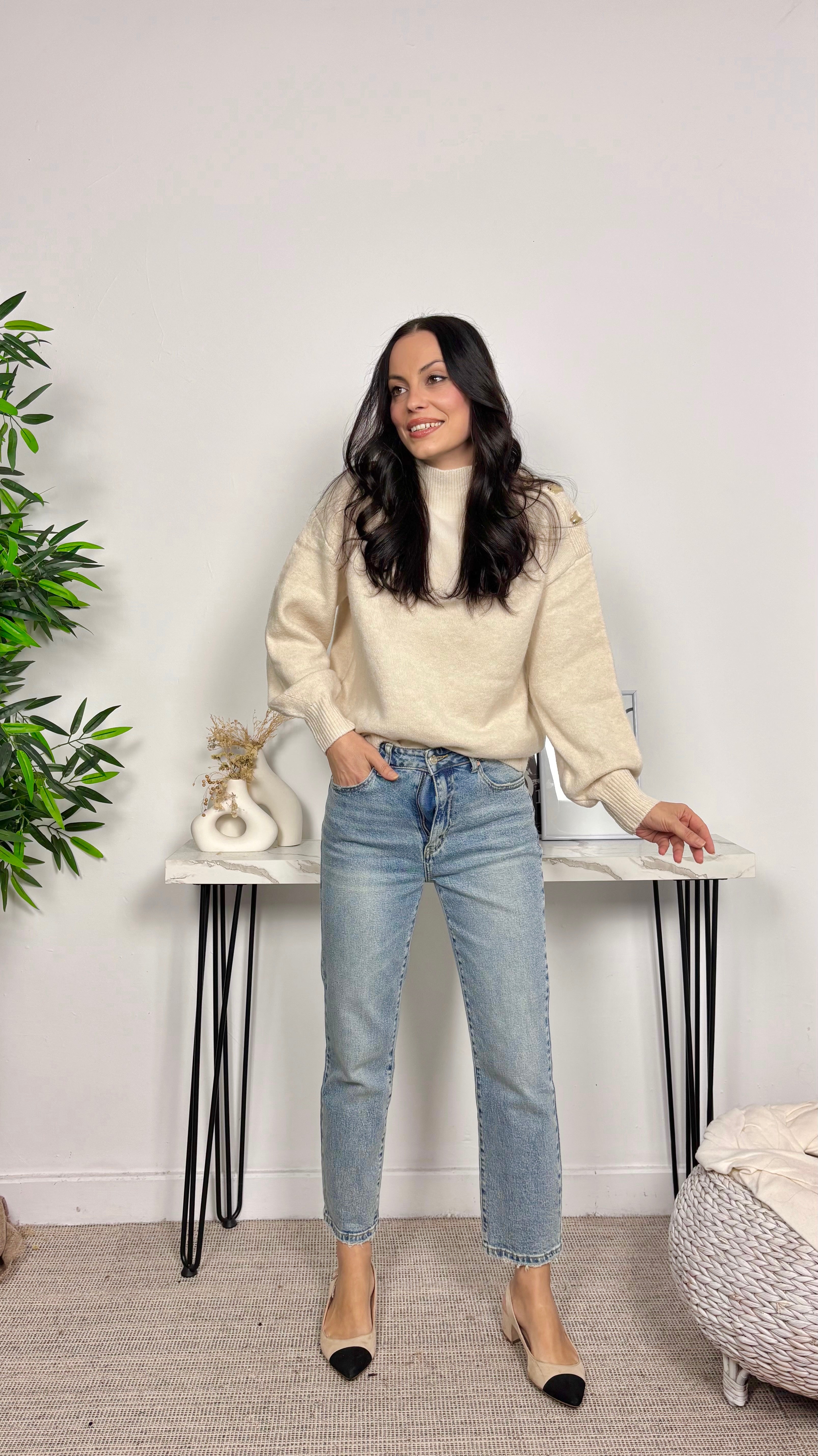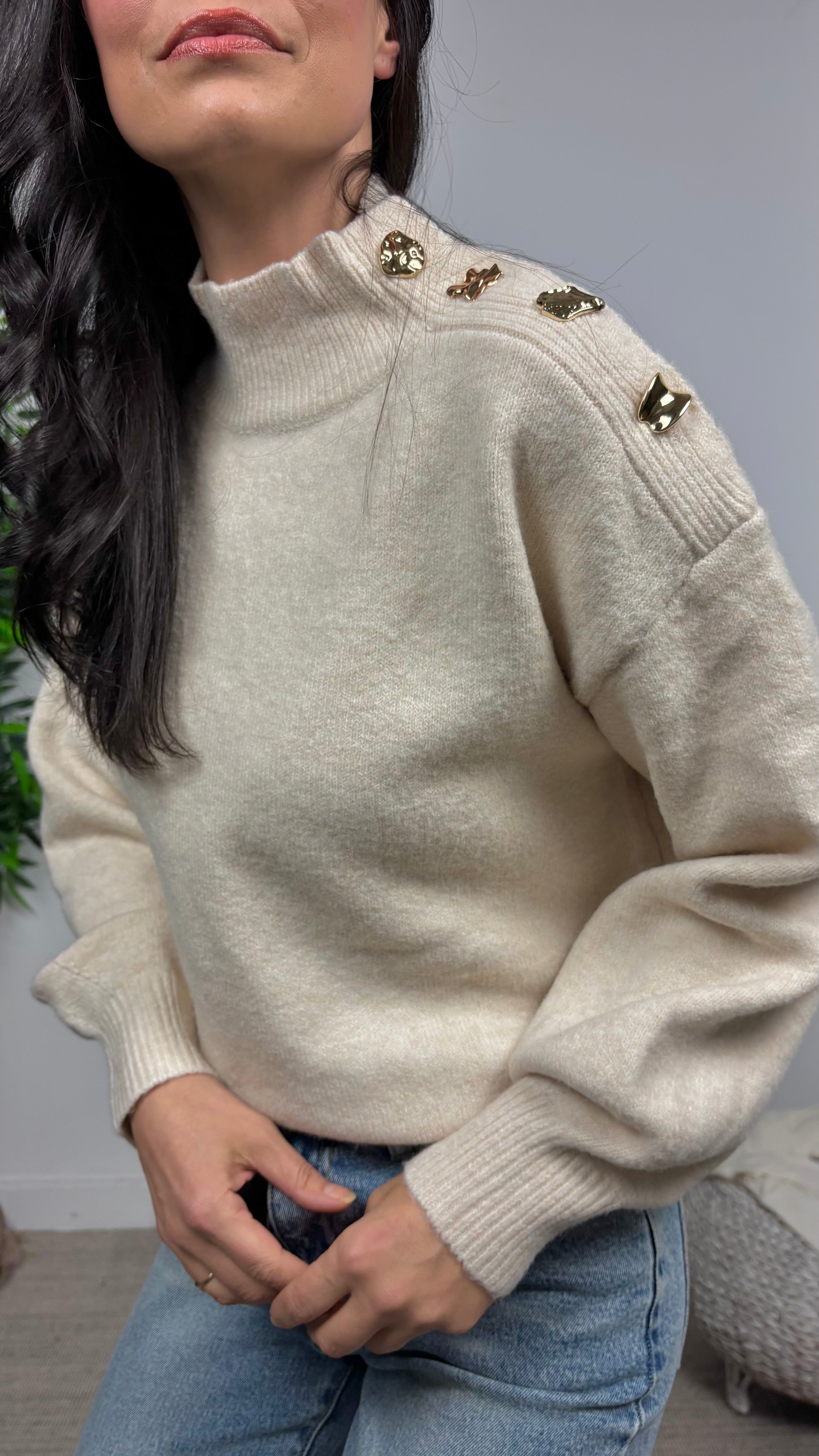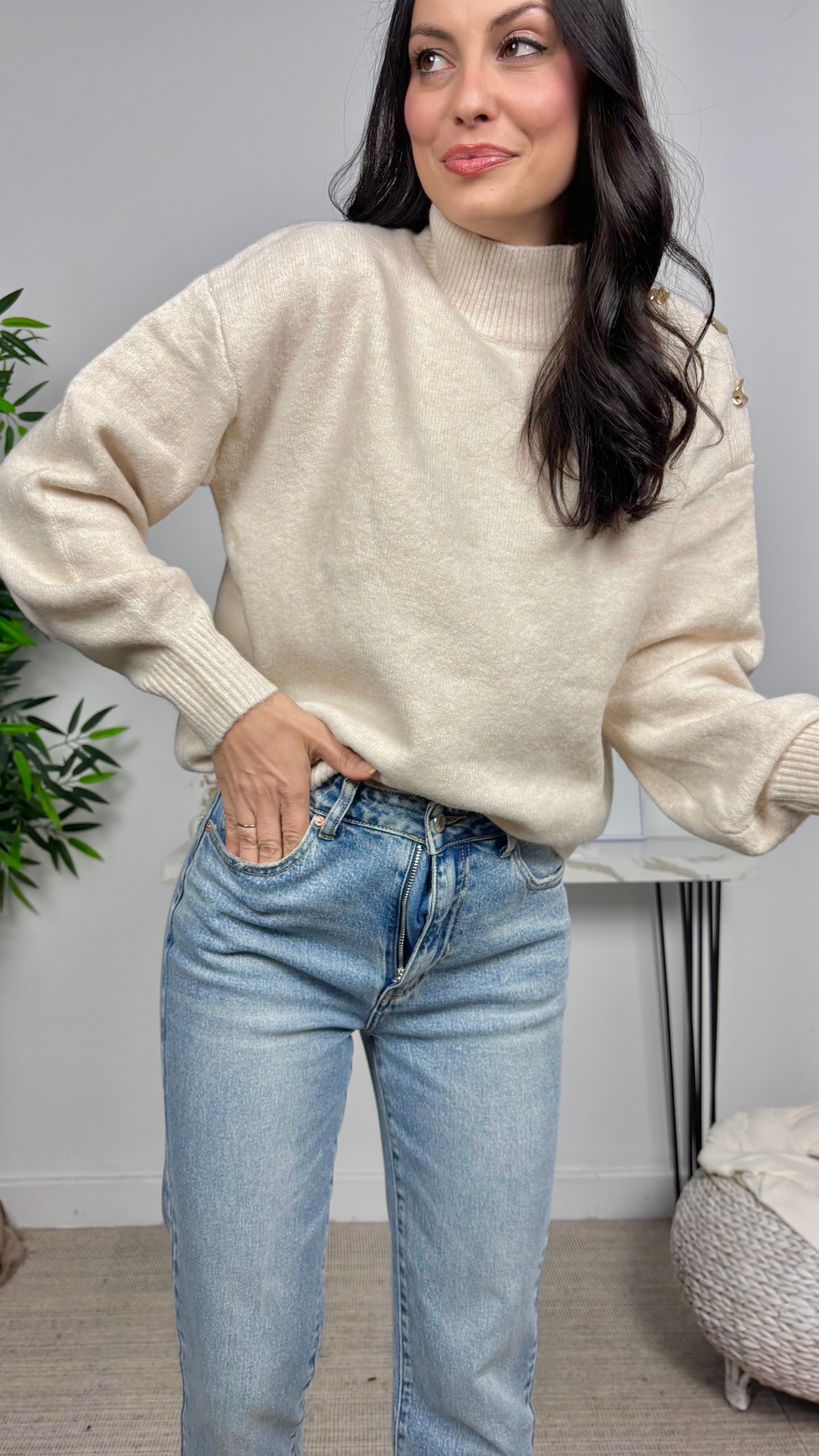 Jersey de cuello perkins con botones dorados en un lateral del hombro. Talla única desde S hasta...