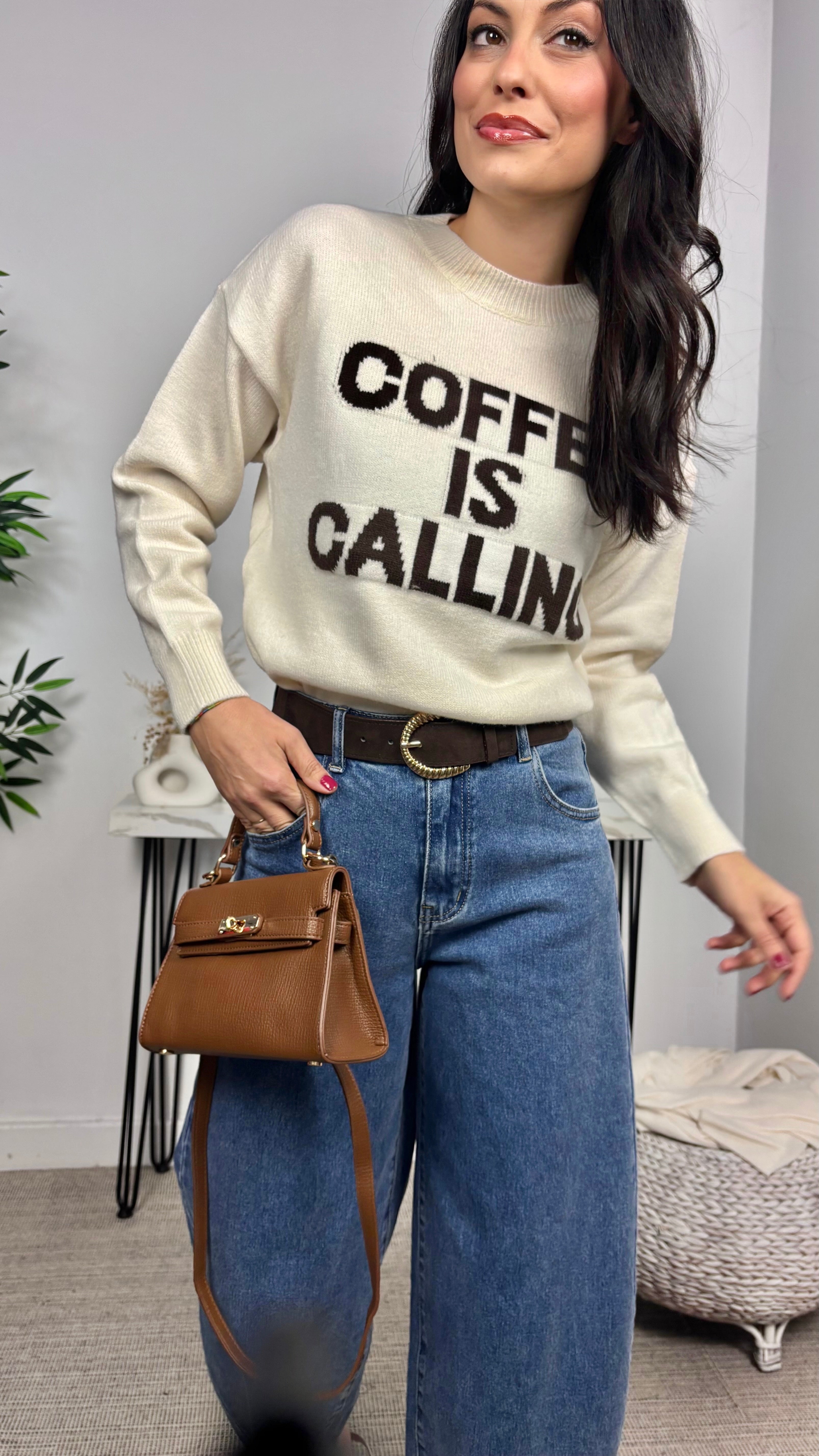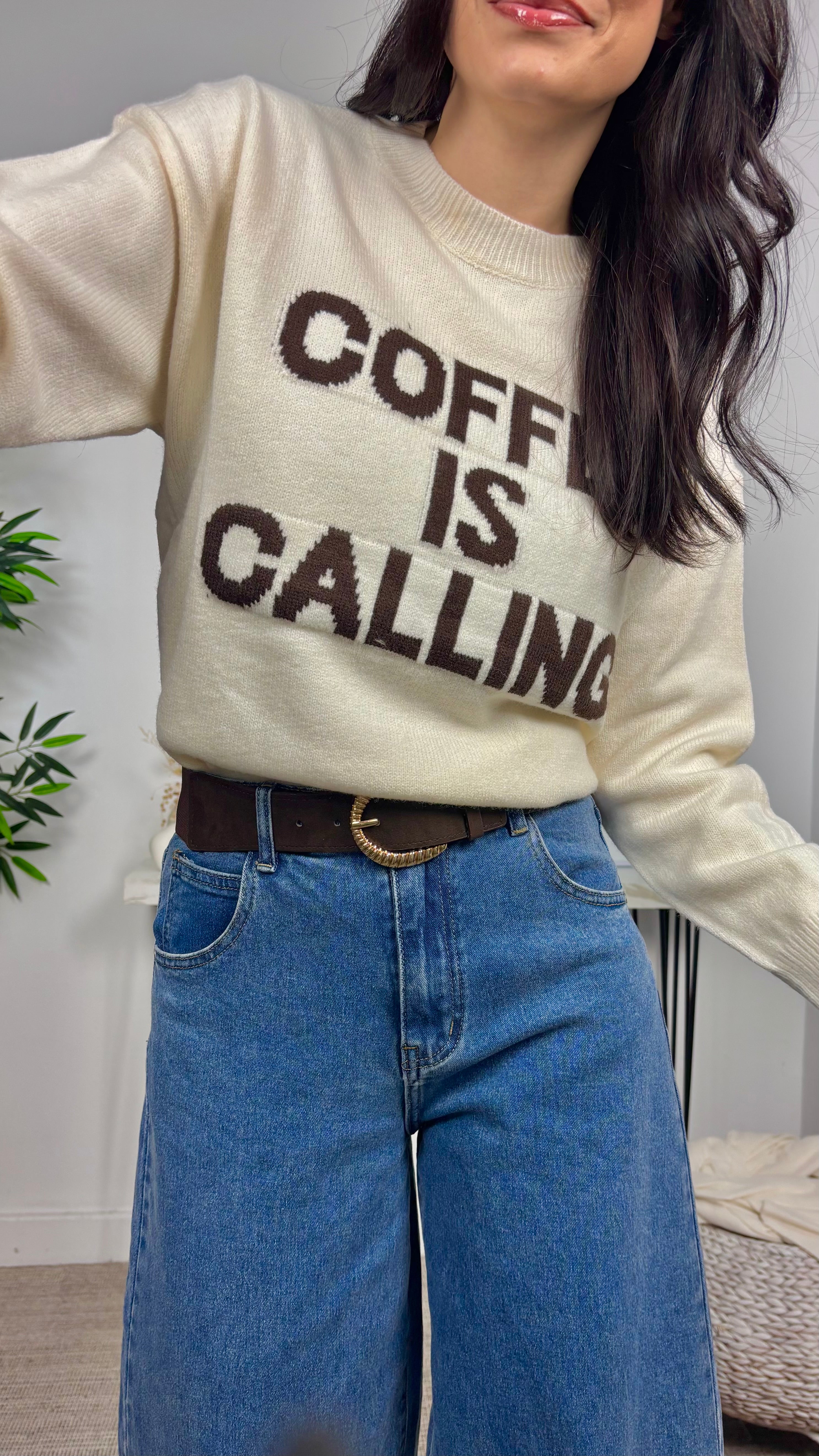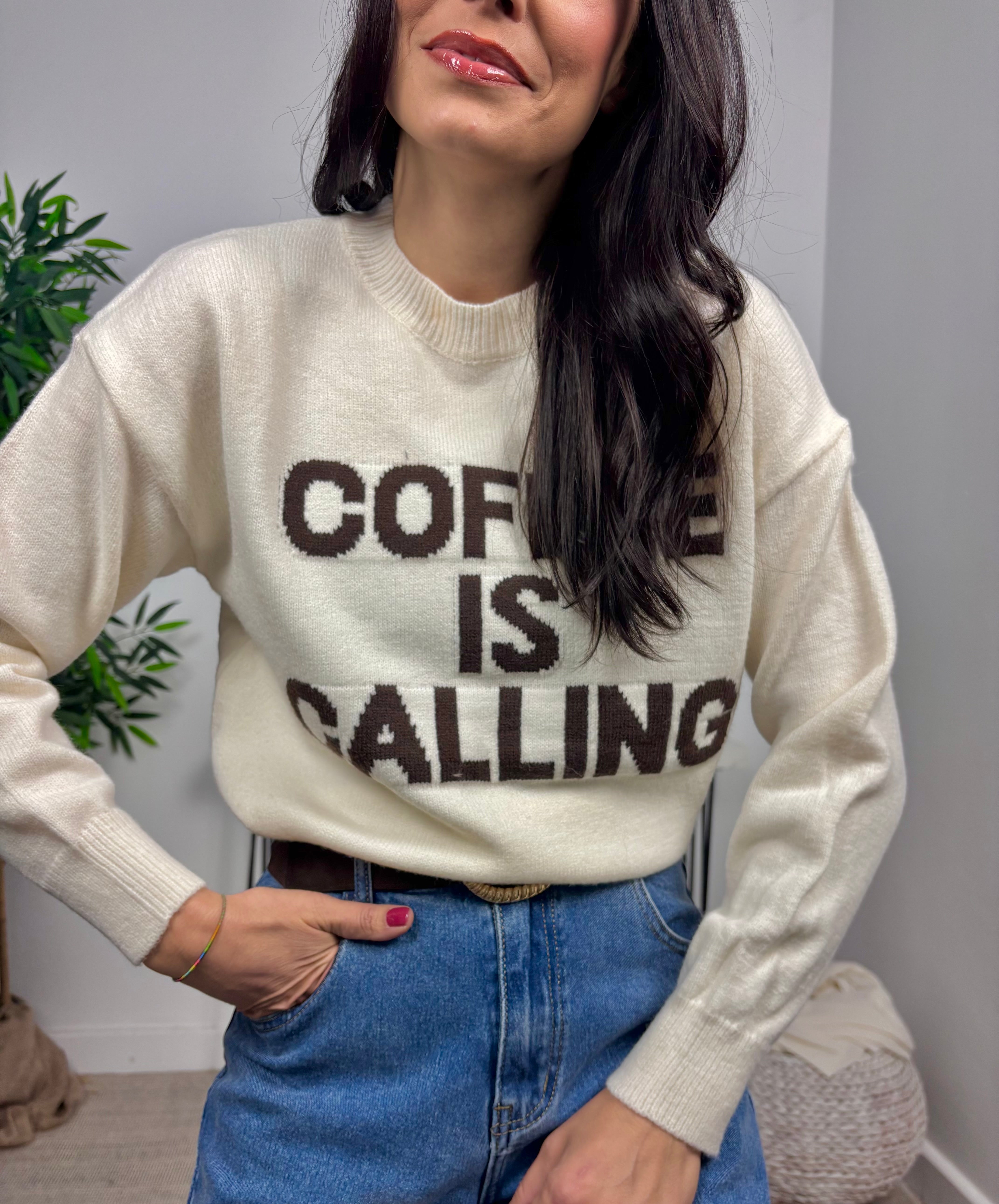 Jersey con mensaje en letras de color marrón y fondo crudo.