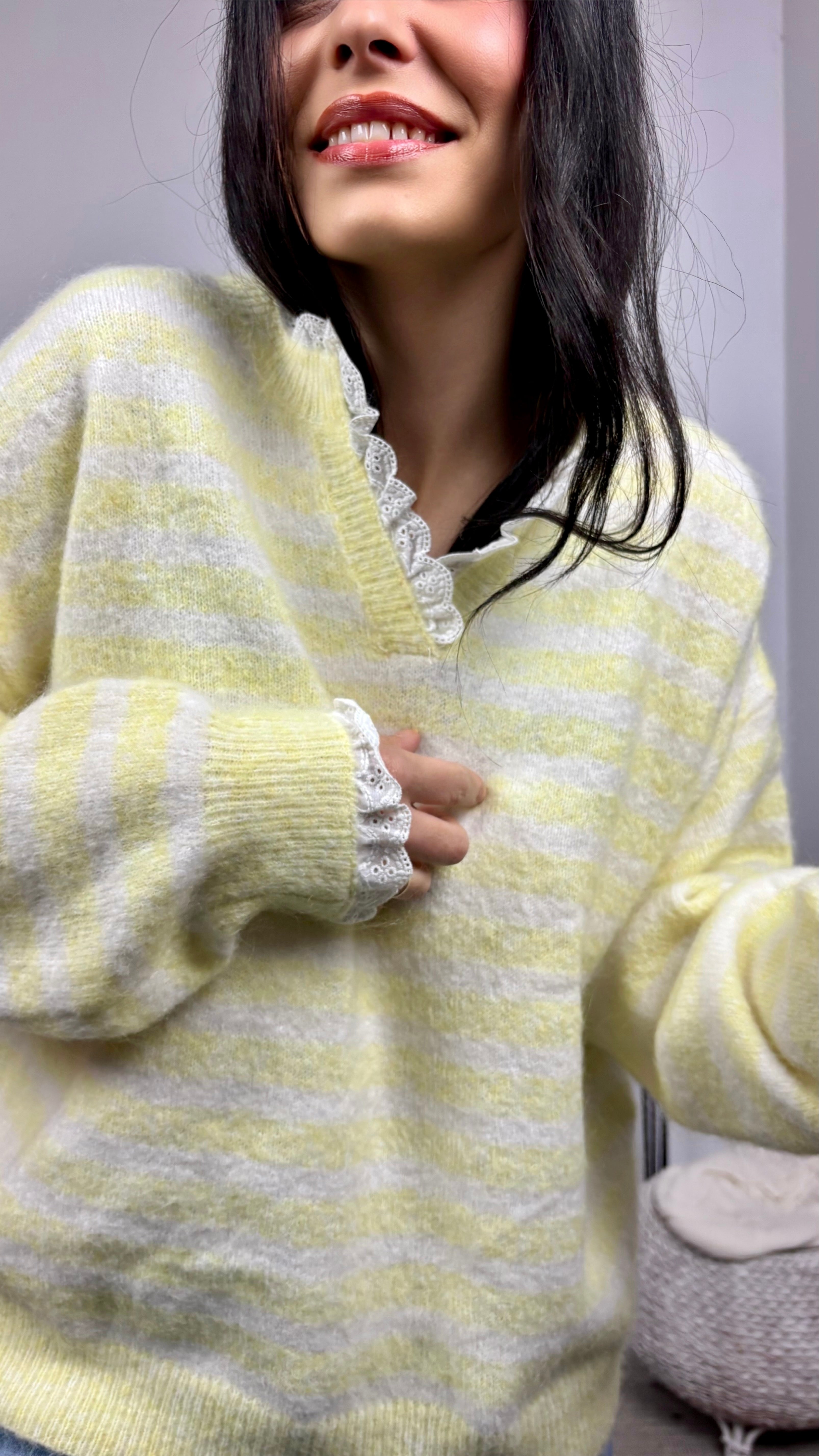 Jersey de cuello pico con detalle de bordado suizo en tejido de popelin en el cuello y en el puño