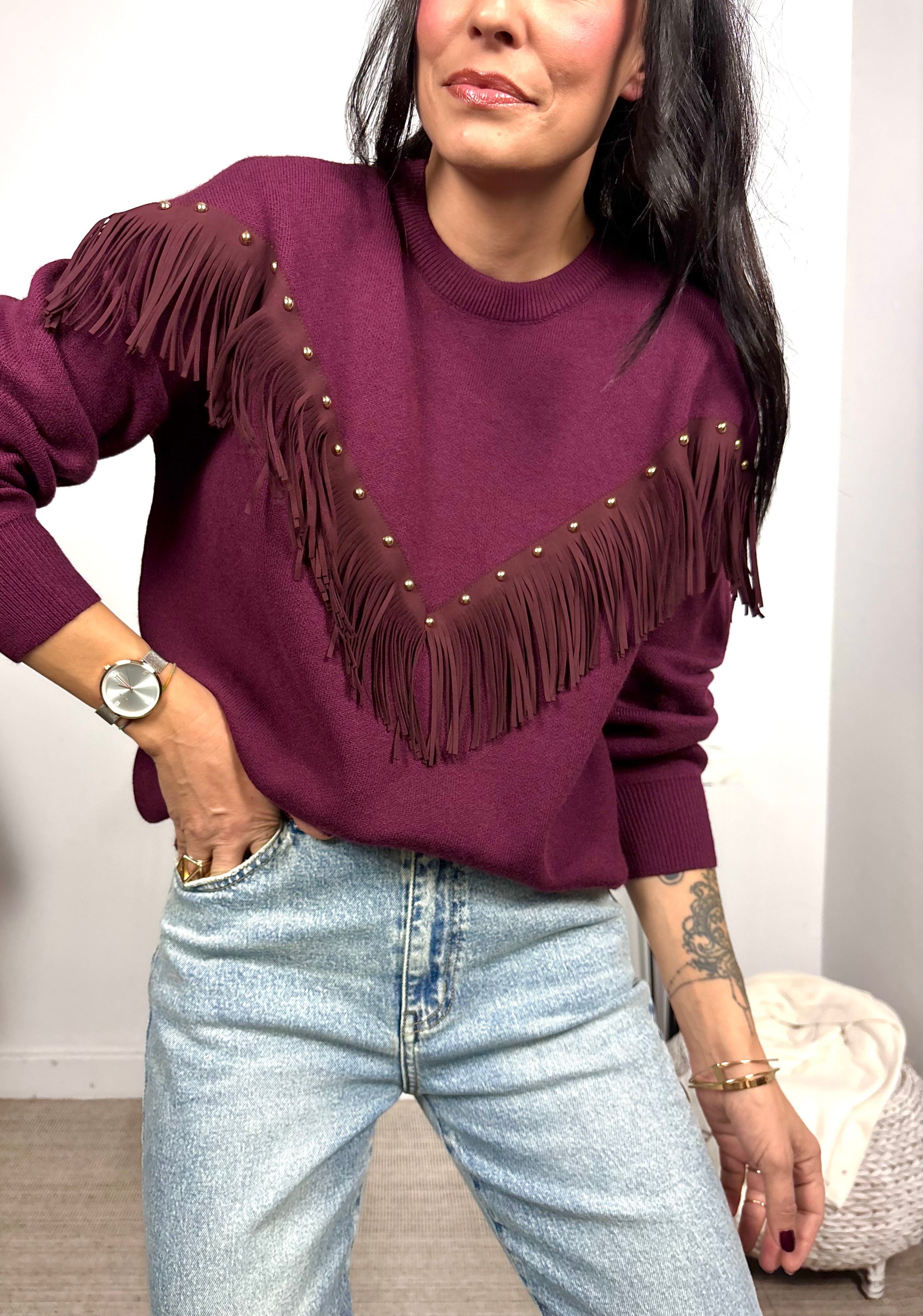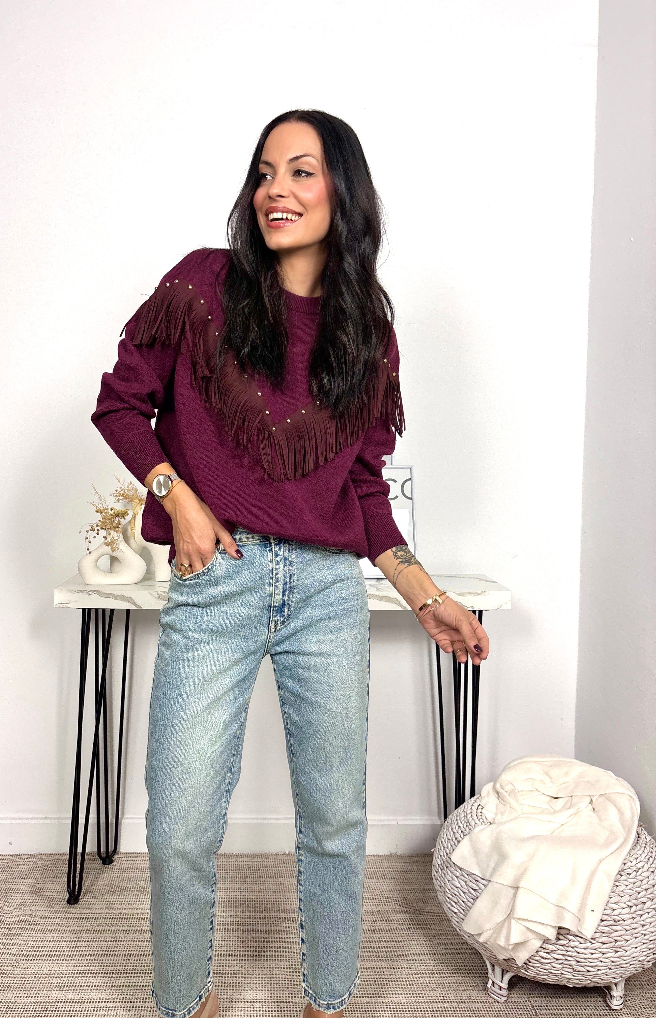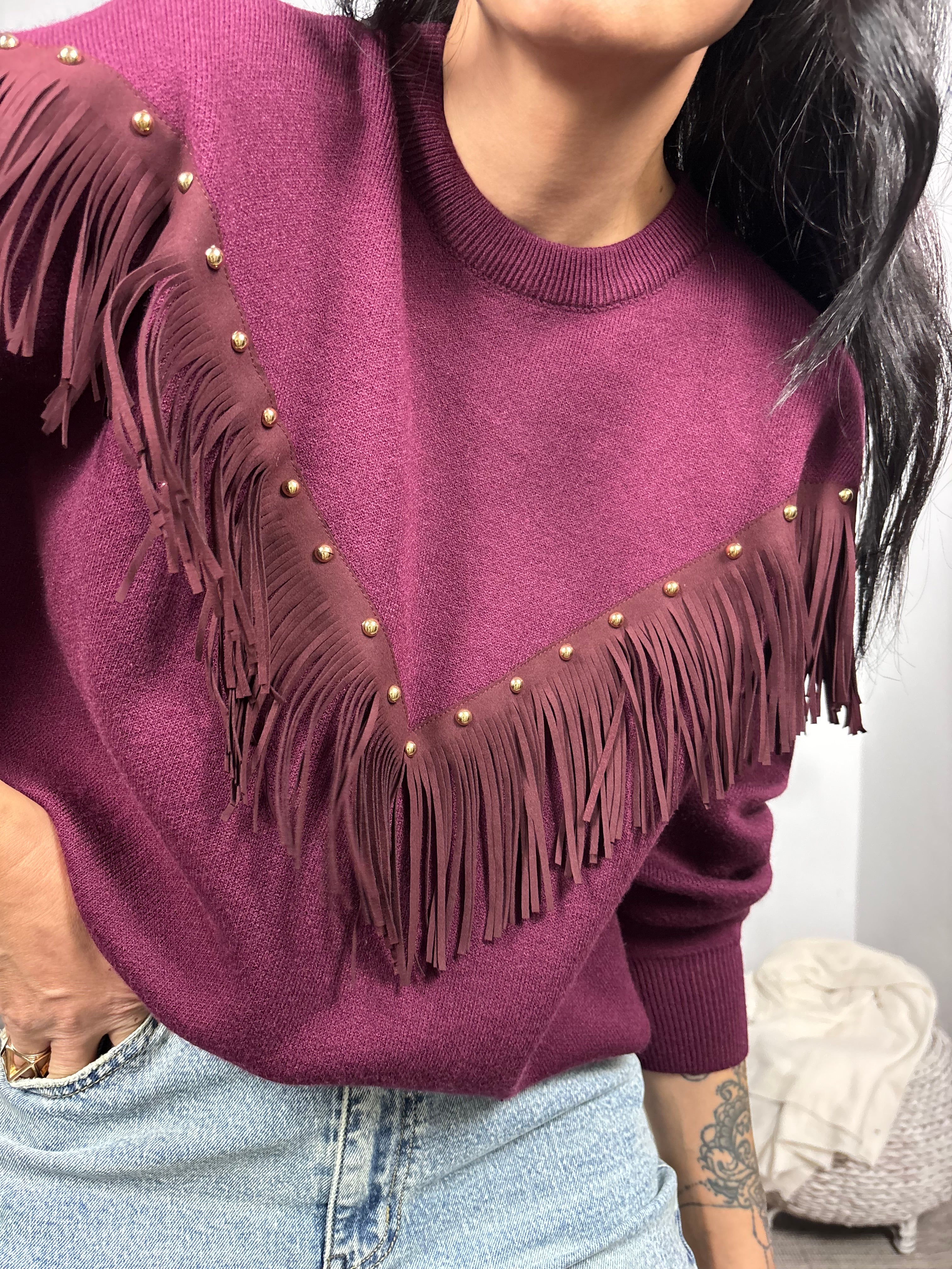 Jersey con flecos de antelina y tachuelas.  Talla única desde S hasta L. COMPOSICIÓN 50% Poliester reciclado...