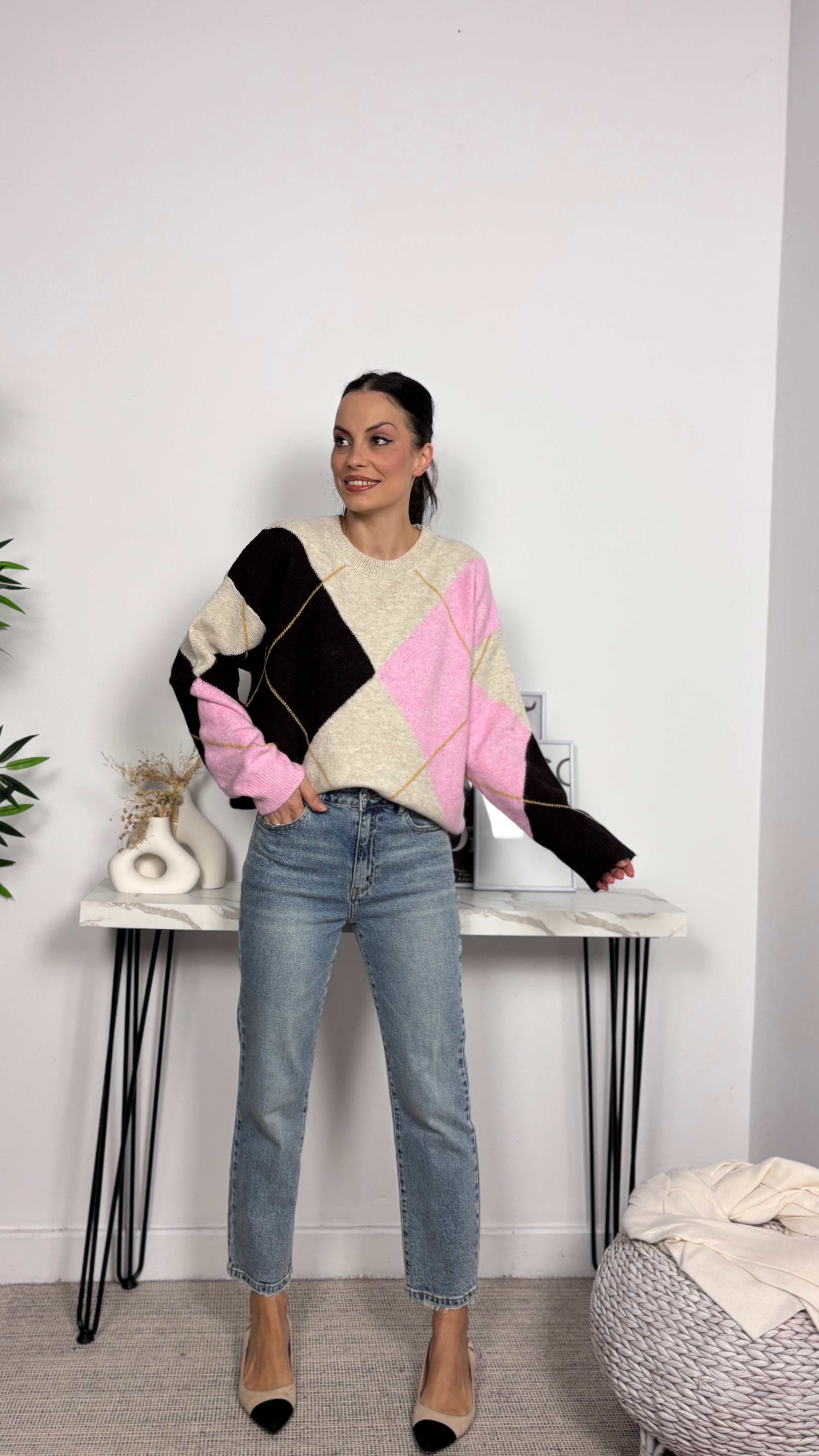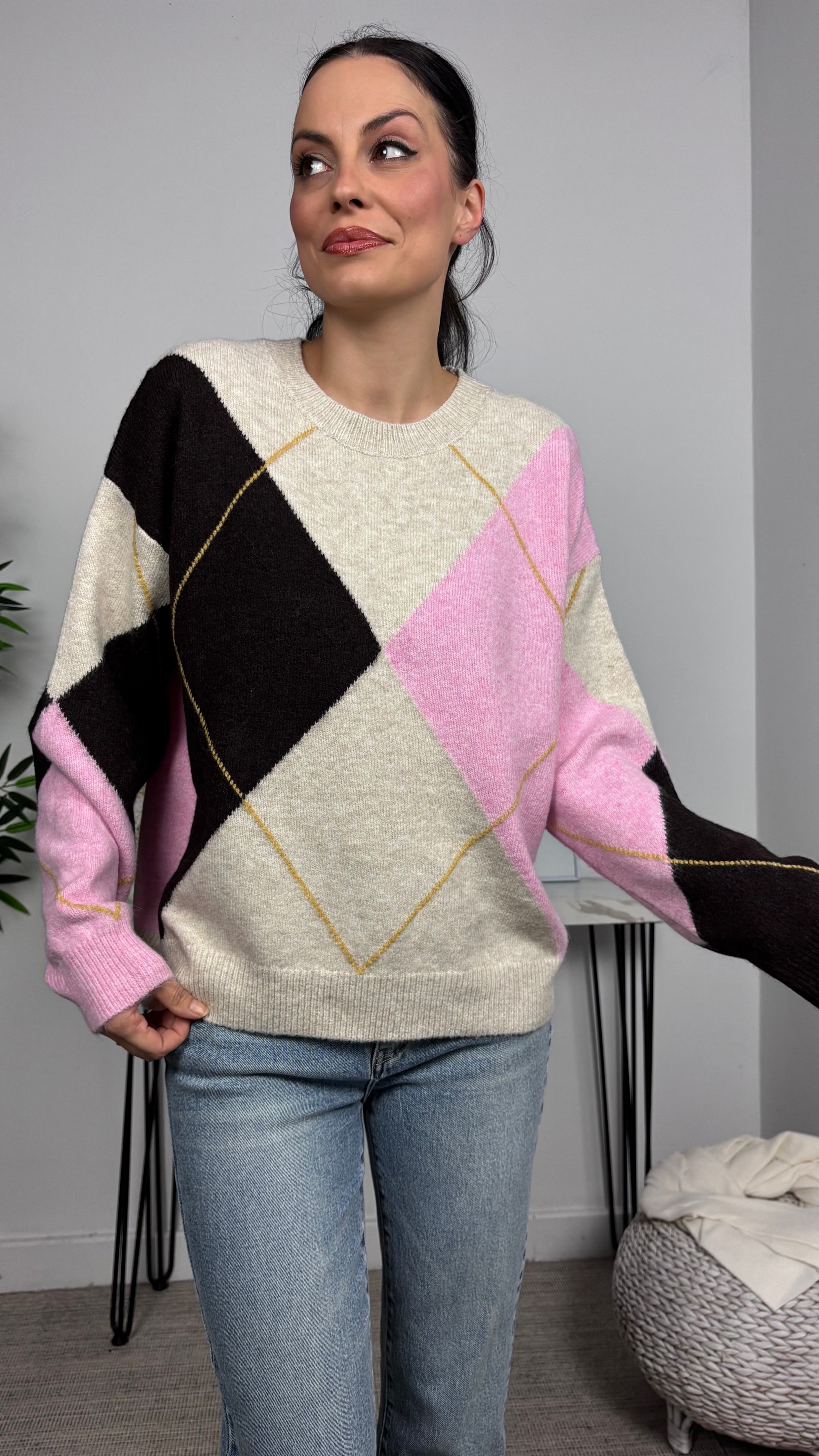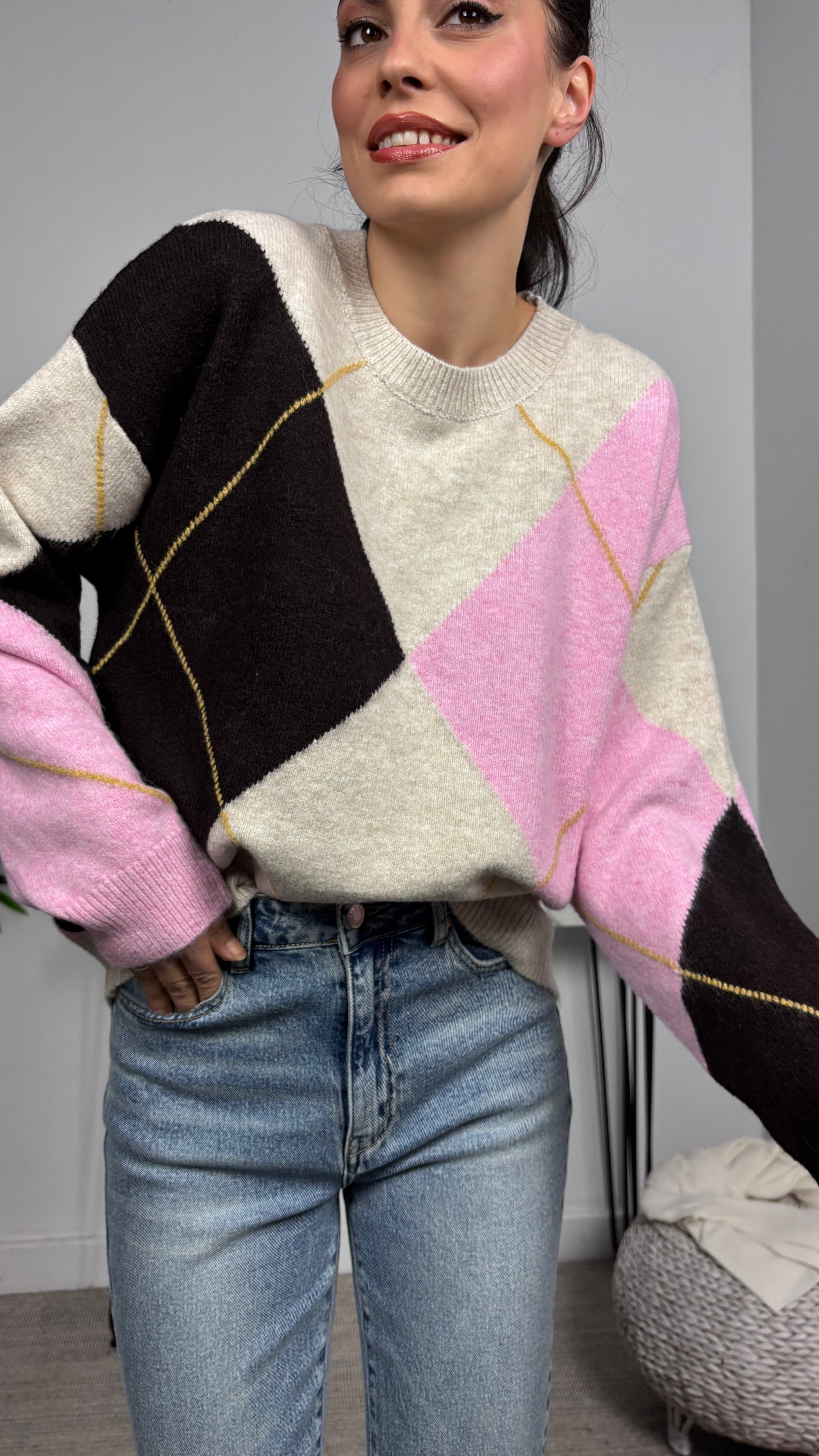 Jersey de rombos en color rosa, crudo y marrón con rayas en color ocre por la parte de delante y de detrás. Punto que no pica.
