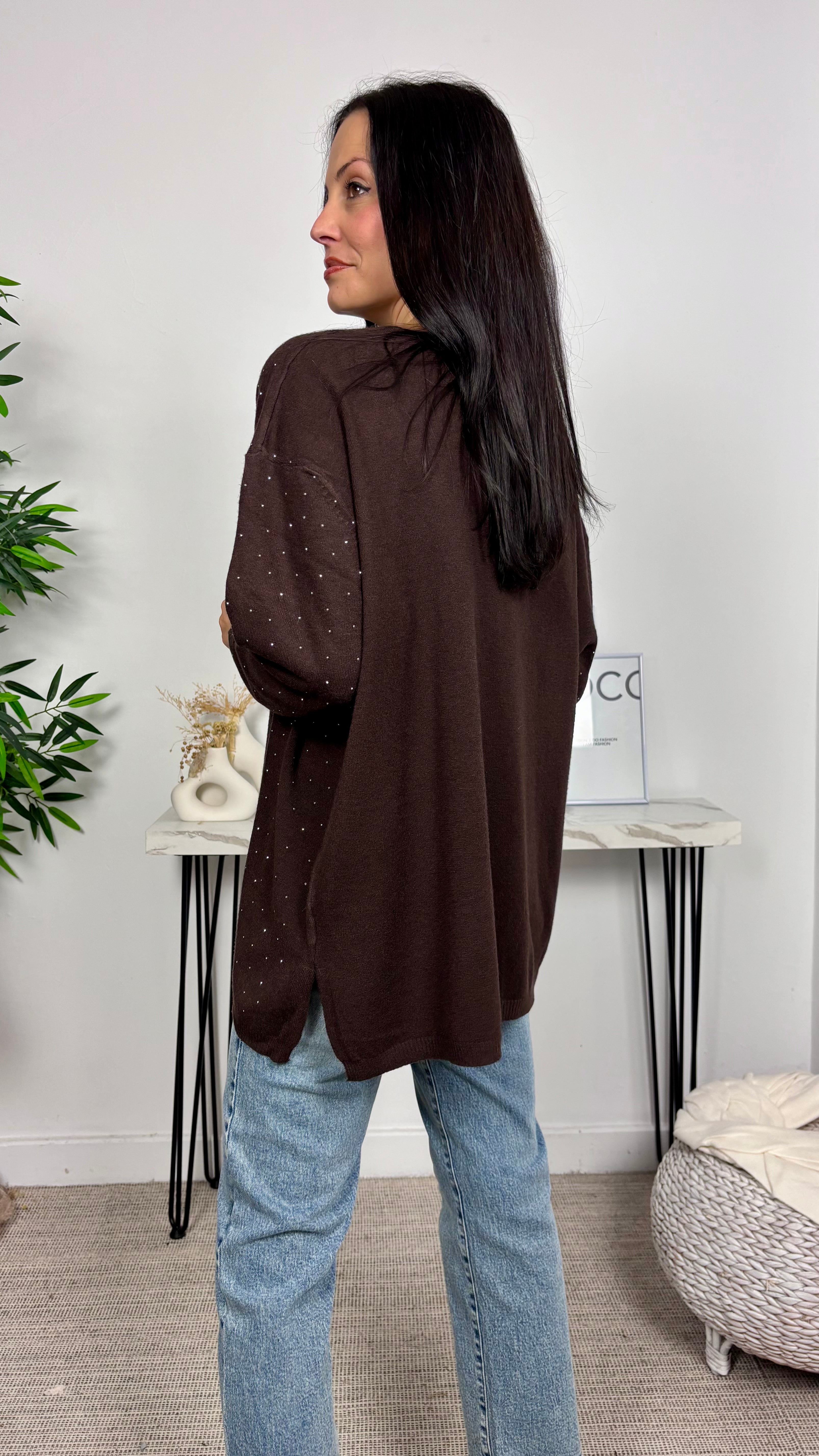 Jersey Strass Cuello Pico Marrón