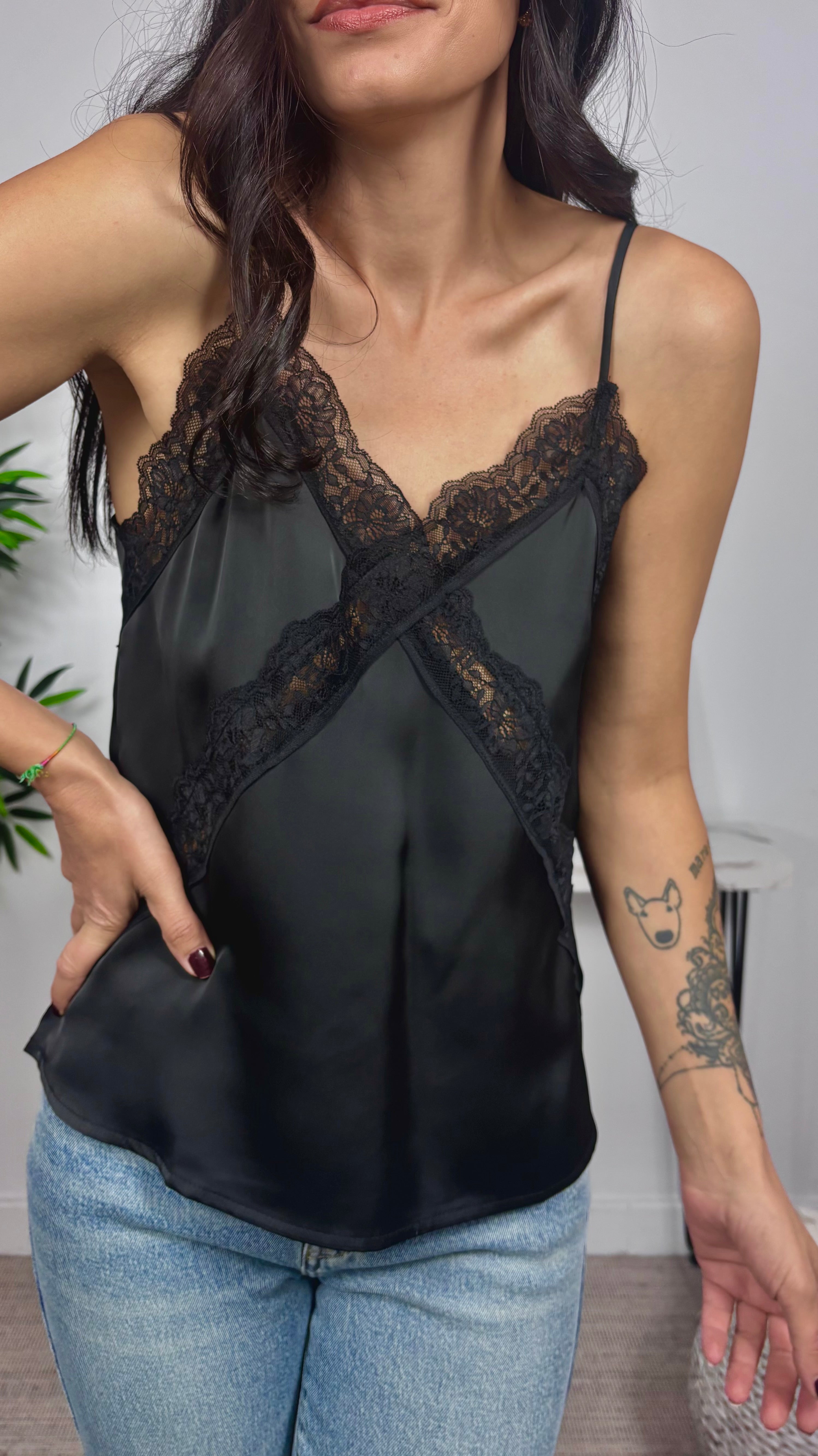 Lencera satinada de tejido grueso con blonda en el pecho y tirante regulable.