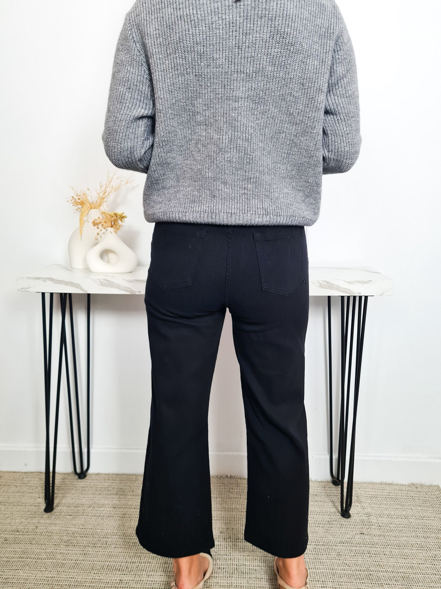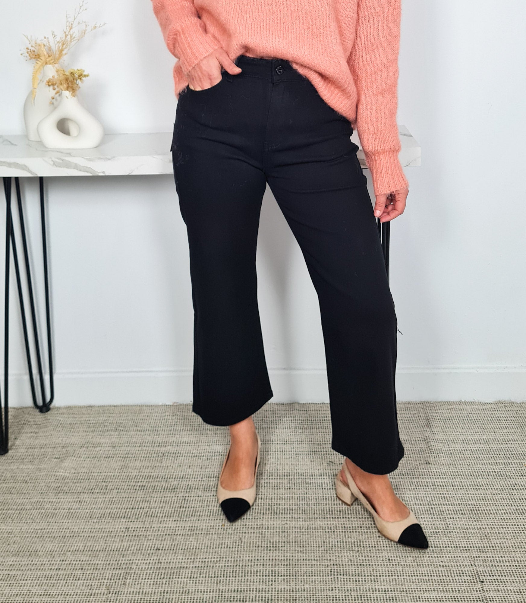 Pantalón vaquero elástico de tiro alto con pata culotte. 5 bolsillos.
