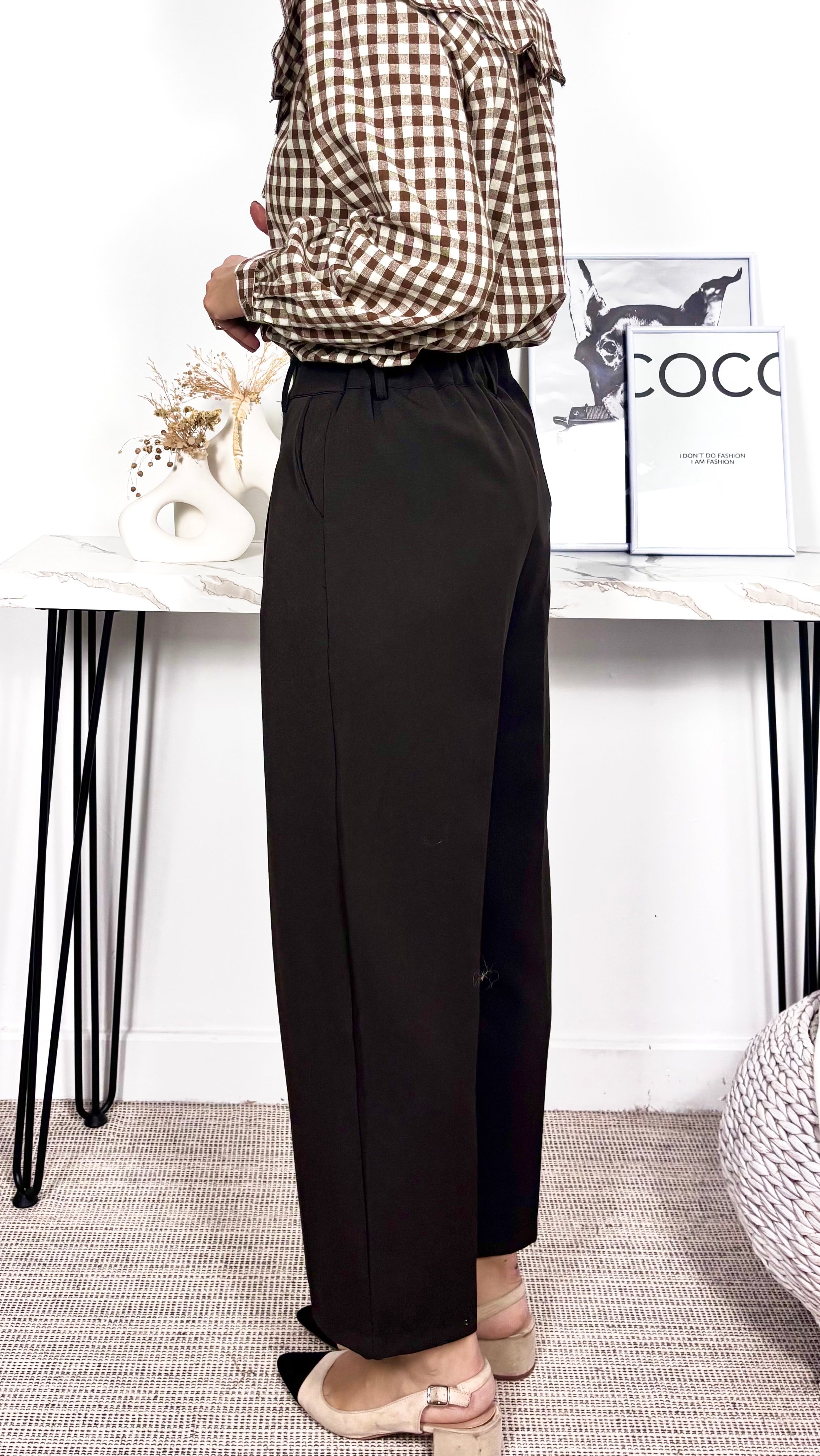Pantalón de pinzas de corte recto, con bolsillos laterales. Tobillero.