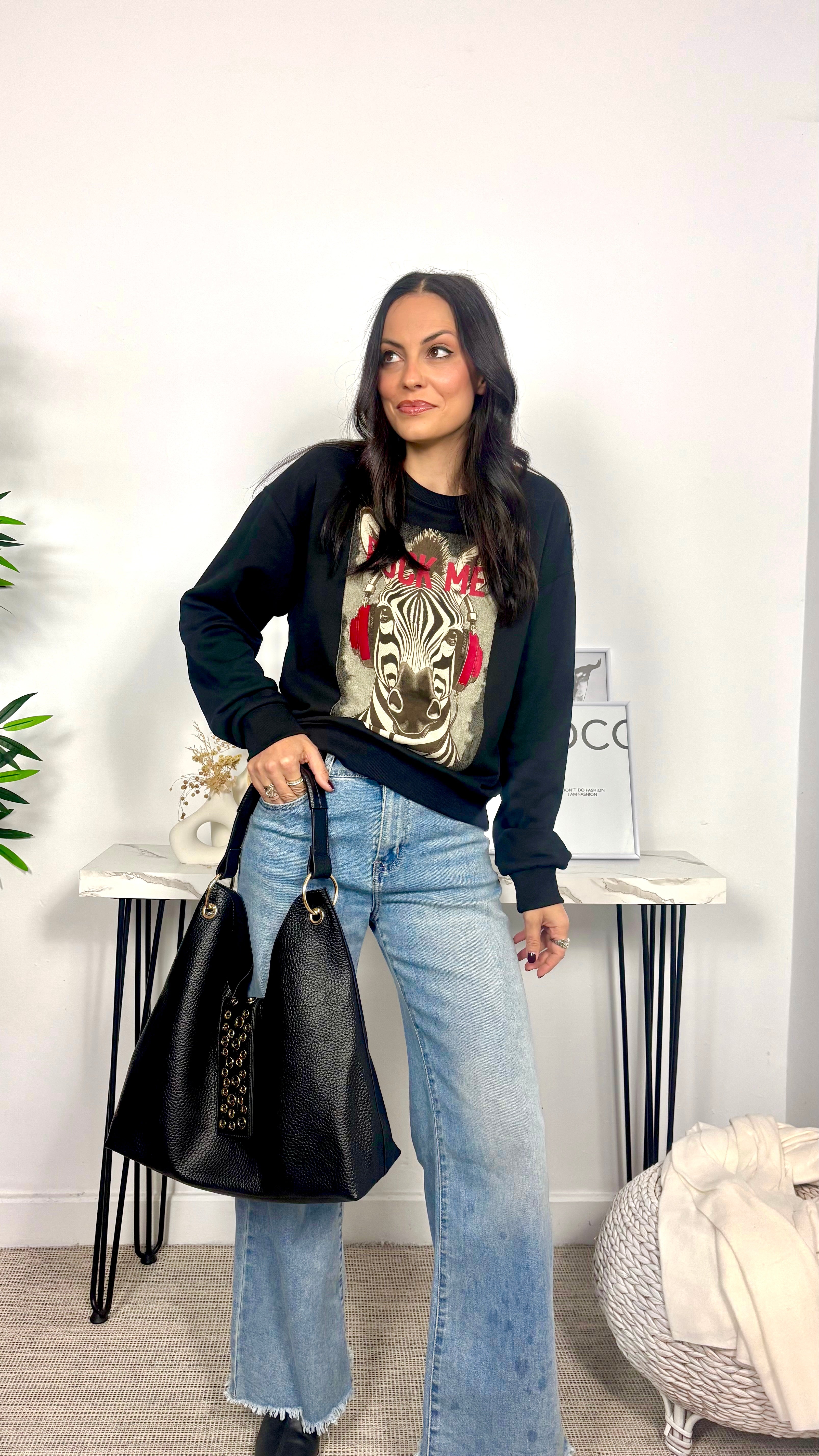 Sudadera con estampado de cebra en negro con detalles rojo oscuro. Tejido gustoso pero sin felpa.