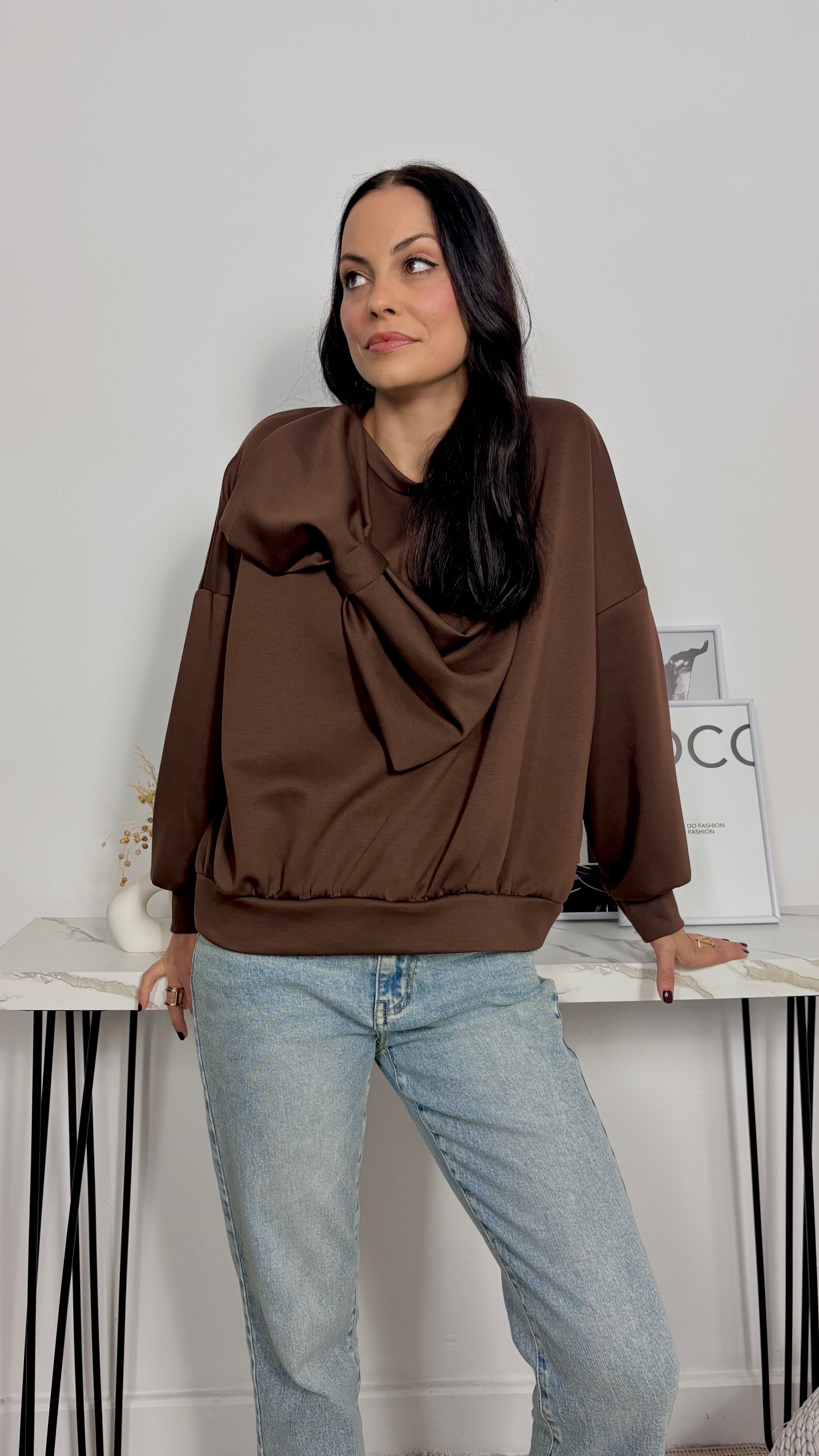 Sudadera con maxi lazo cosido en el hombro y bajo pecho. De corte amplio.