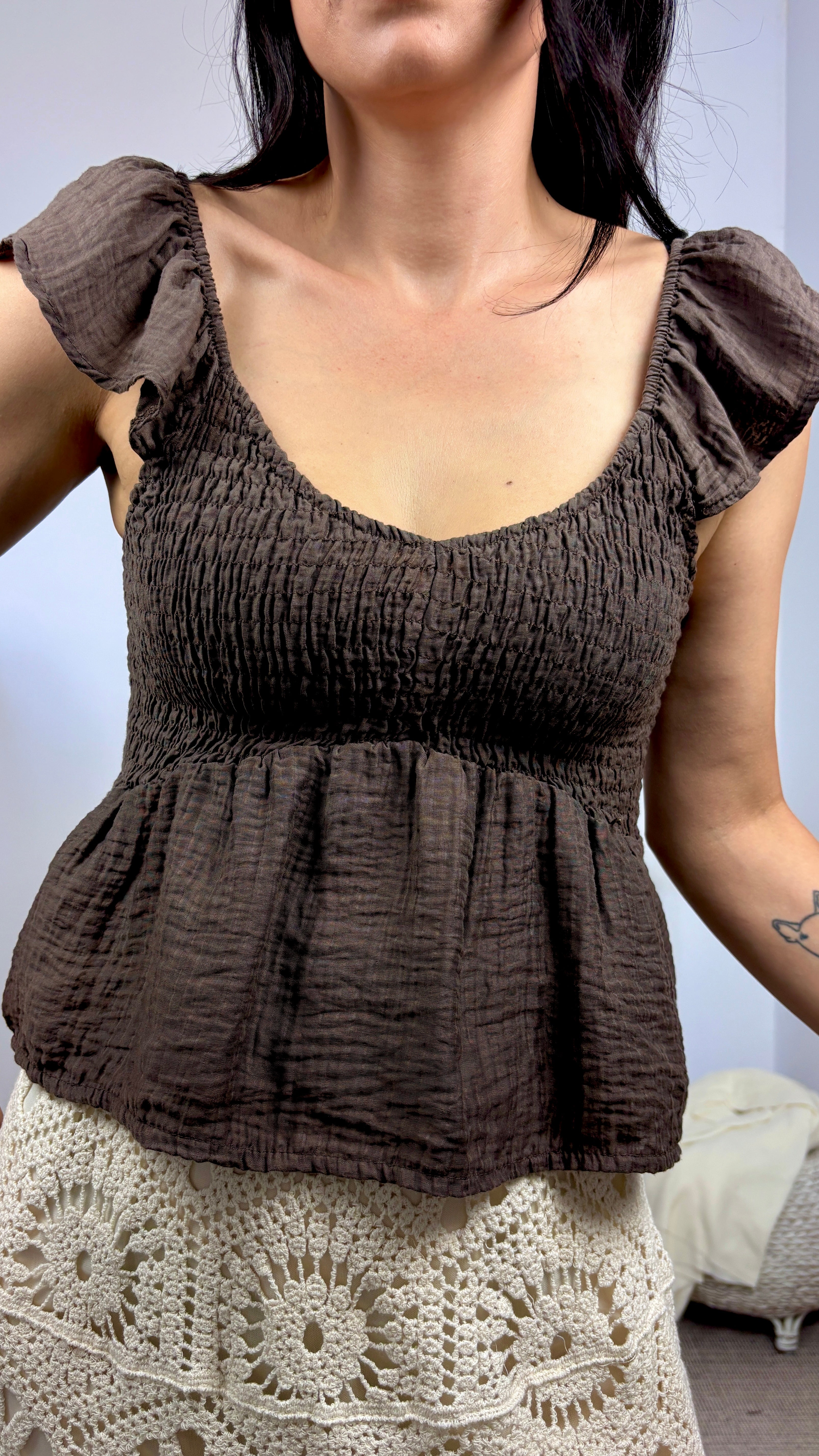 top de tejido de bambula, tipo muselina, con volante en el tirante y nido de abeja en...