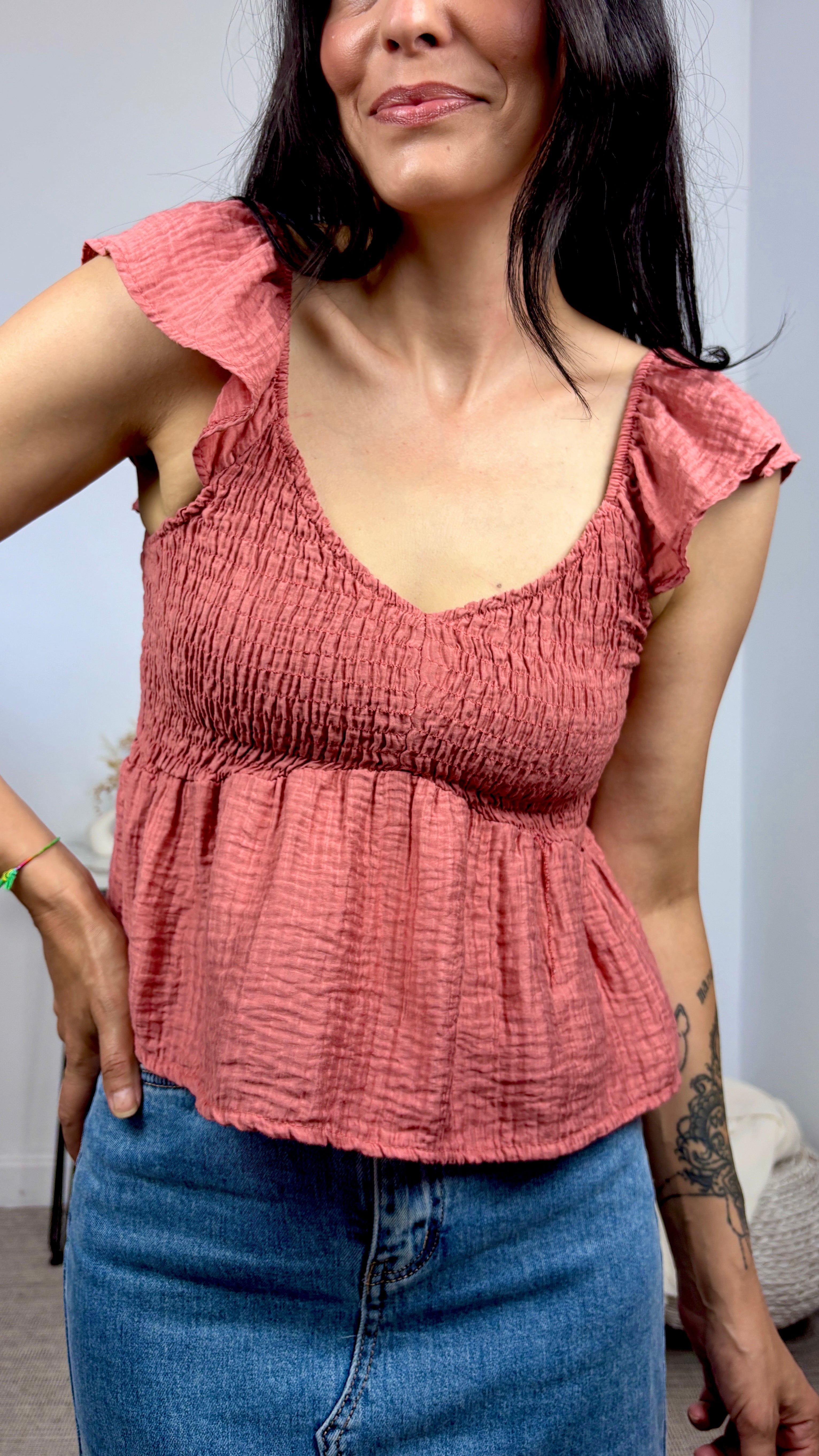 top de tejido de bambula, tipo muselina, con volante en el tirante y nido de abeja en la parte delantera y trasera. Volante bajo.