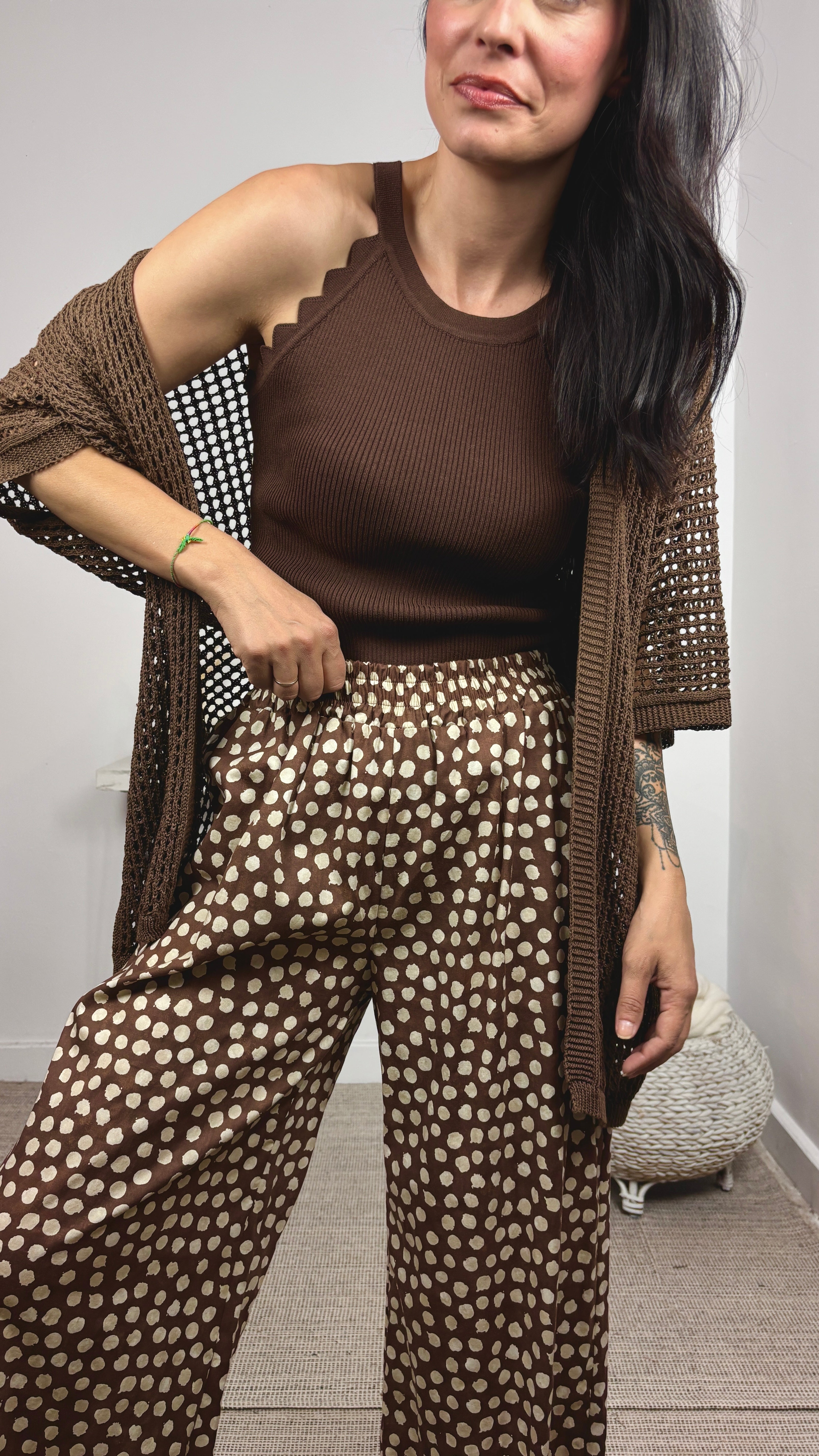 El modelo lleva talla ML. Mide 1.70 y su talla actual es la M/38. Las medidas de las tallas son aproximadas.