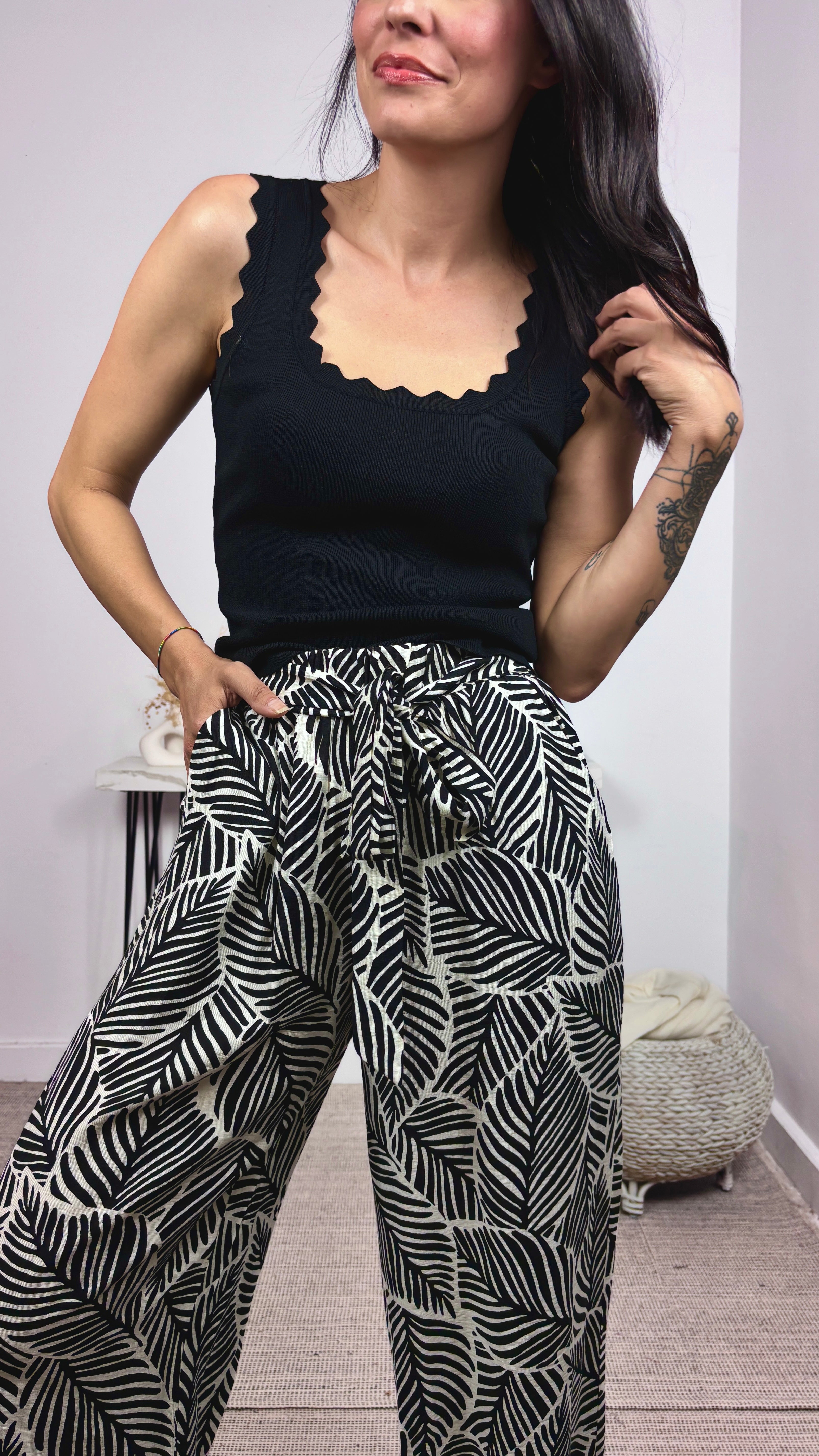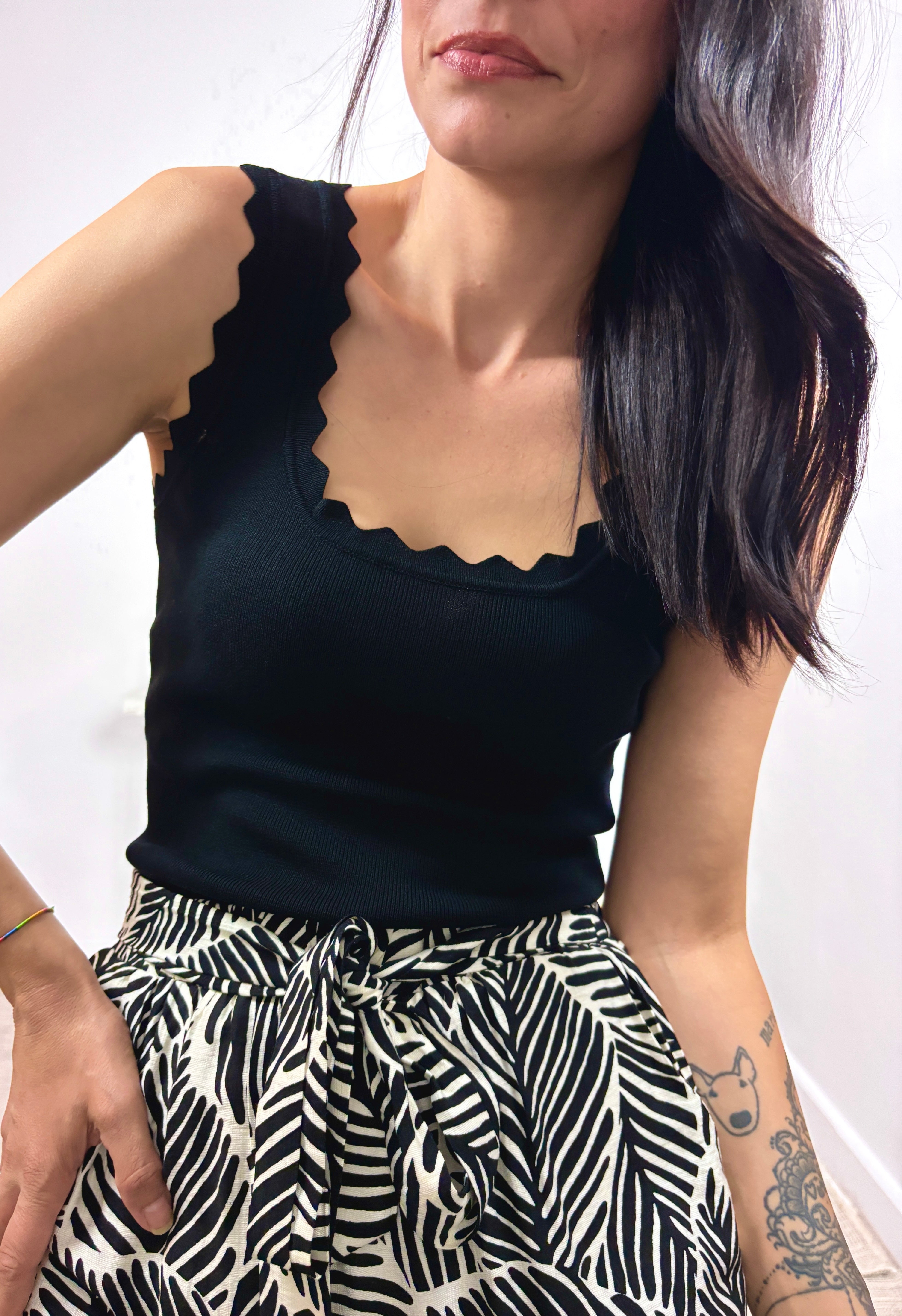 top de tejido de bambula, tipo muselina, con volante en el tirante y nido de abeja en la parte delantera y trasera. Volante bajo.