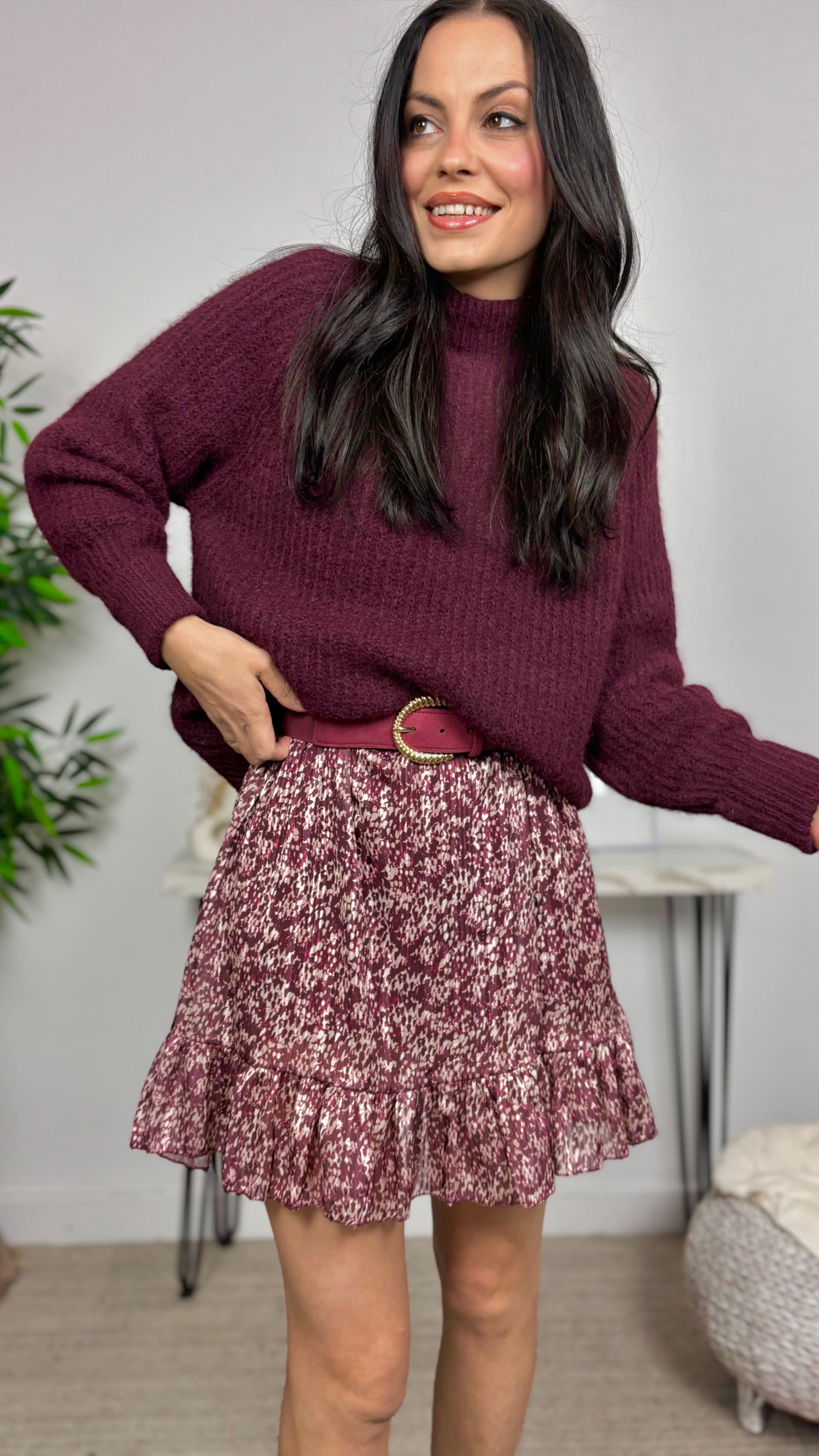 La modelo lleva talla única. Mide 1.70 y su talla actual es la S/36. Las medidas de las tallas son aproximadas.
