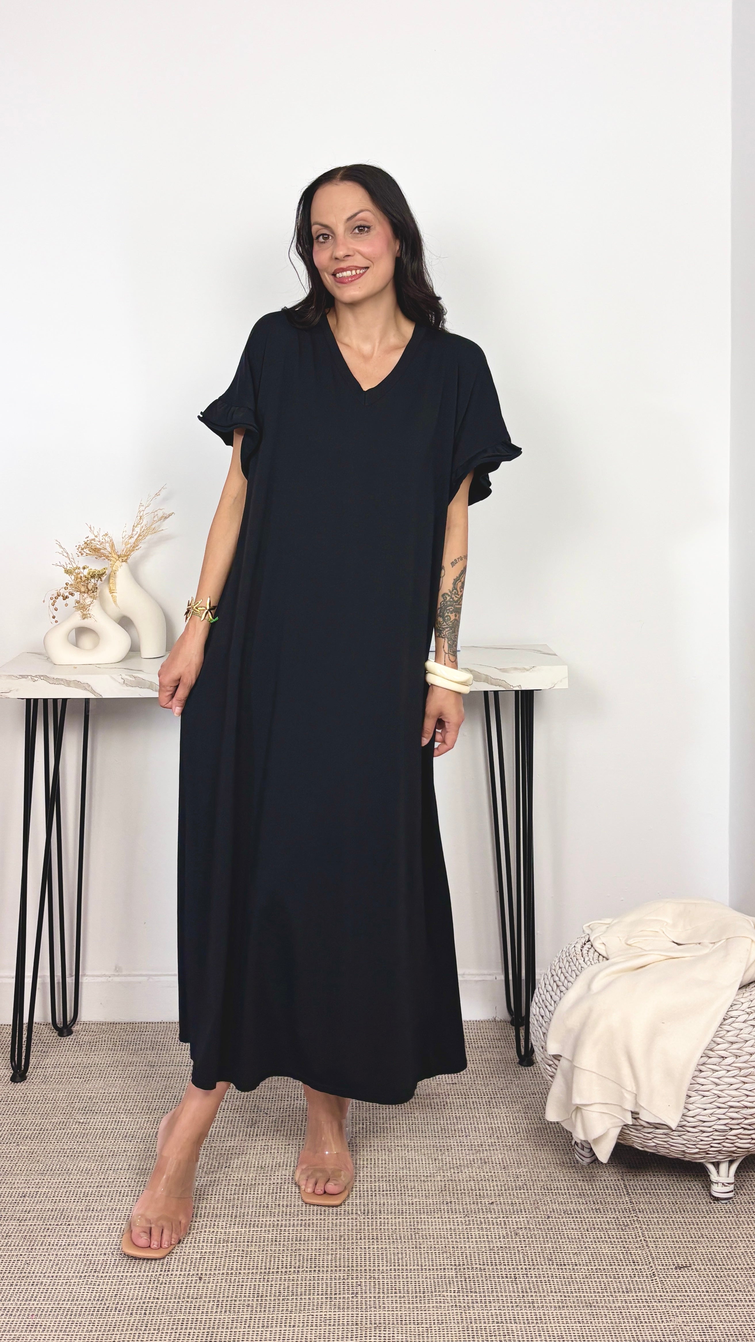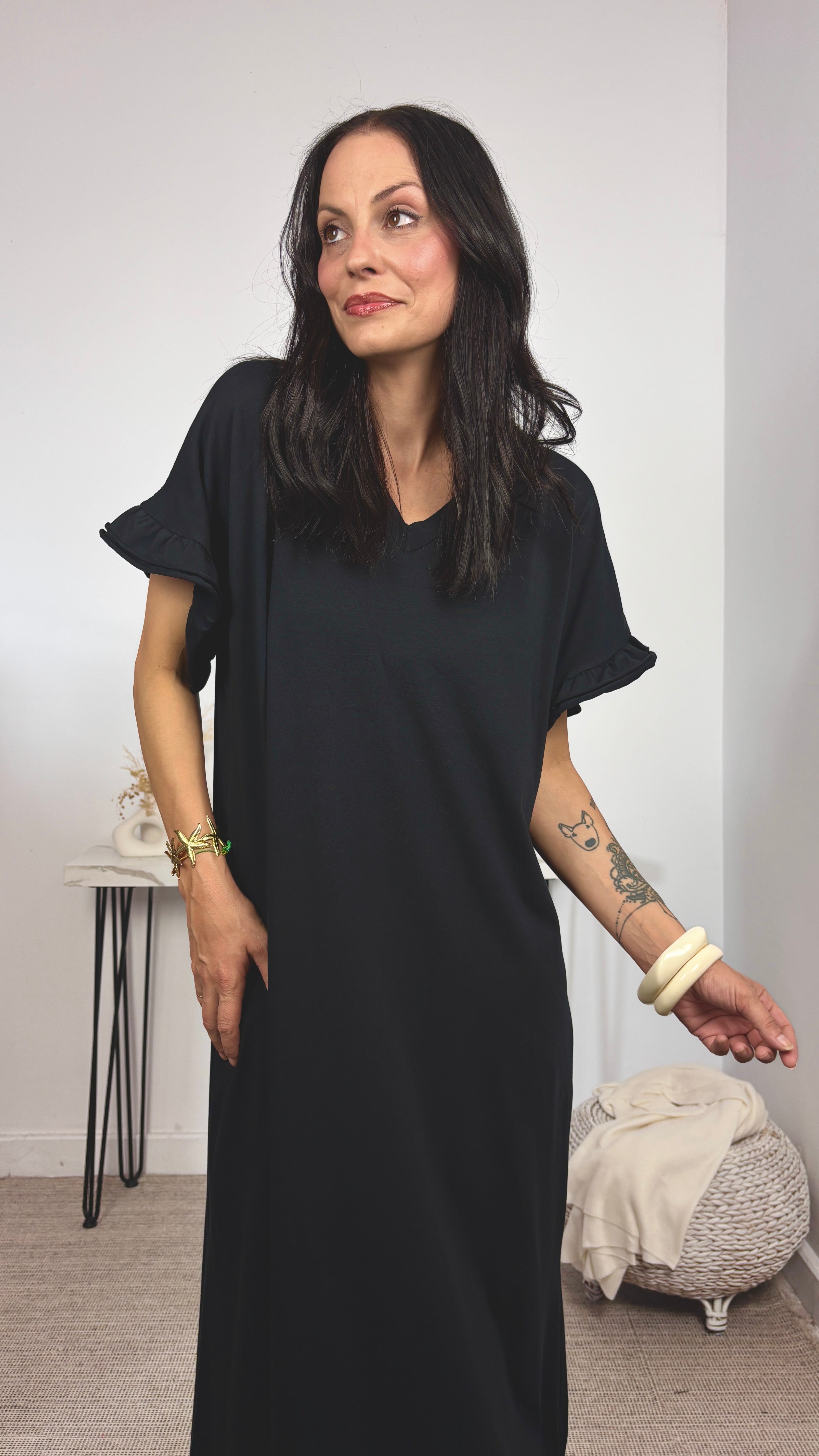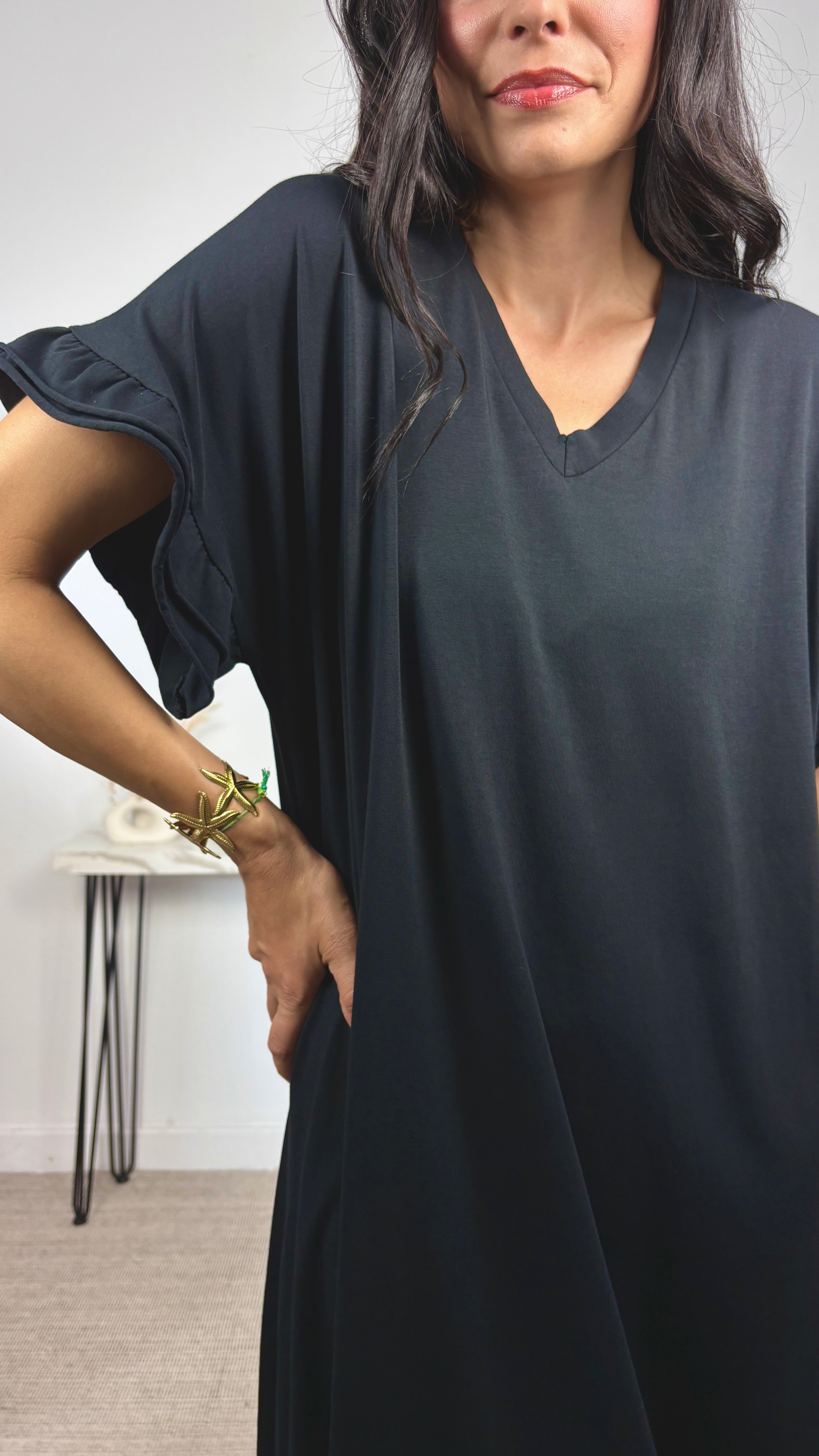 La modelo lleva talla única. Mide 1.70 y su talla actual es la S/36. Las medidas de las tallas son aproximadas.