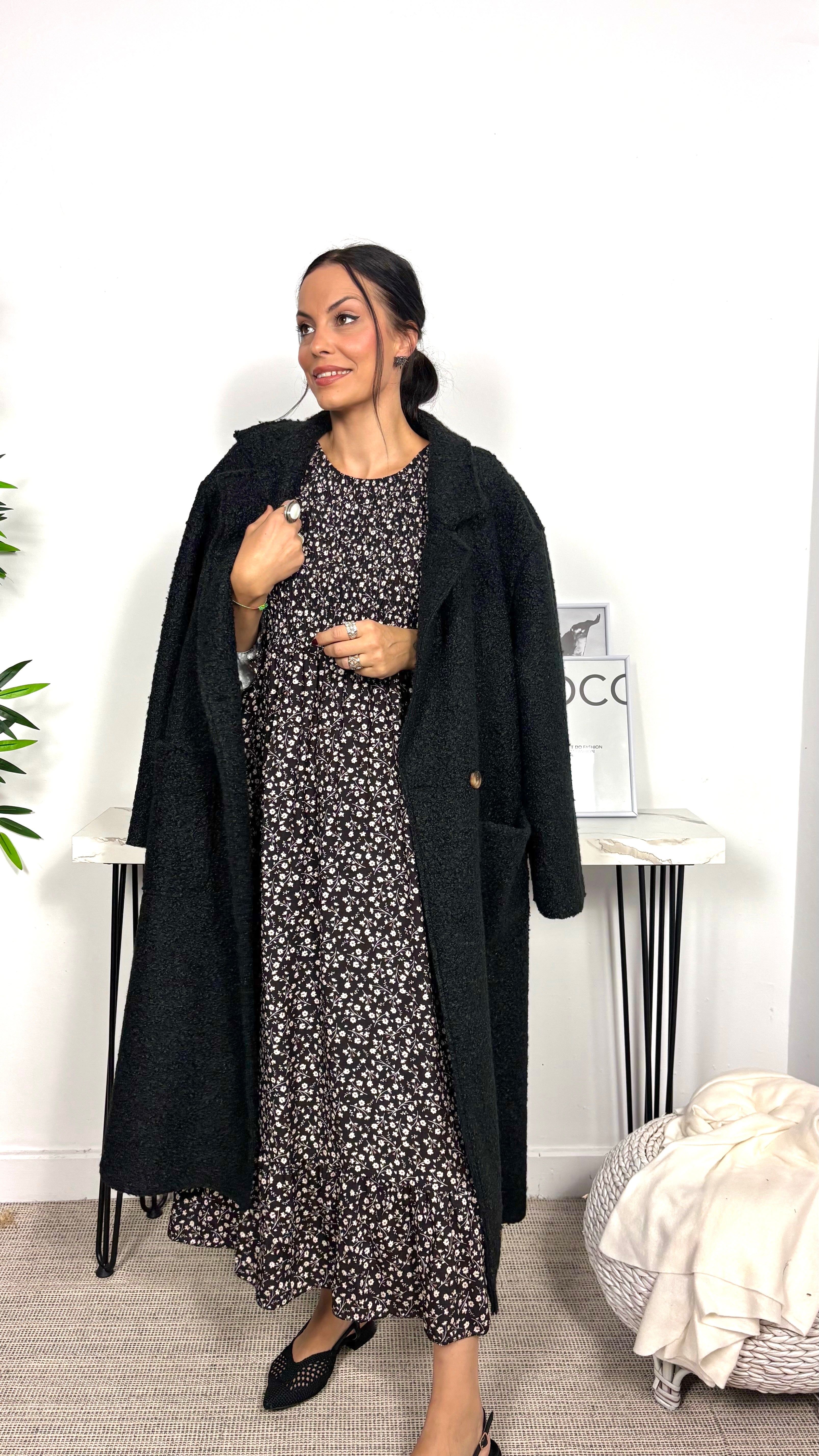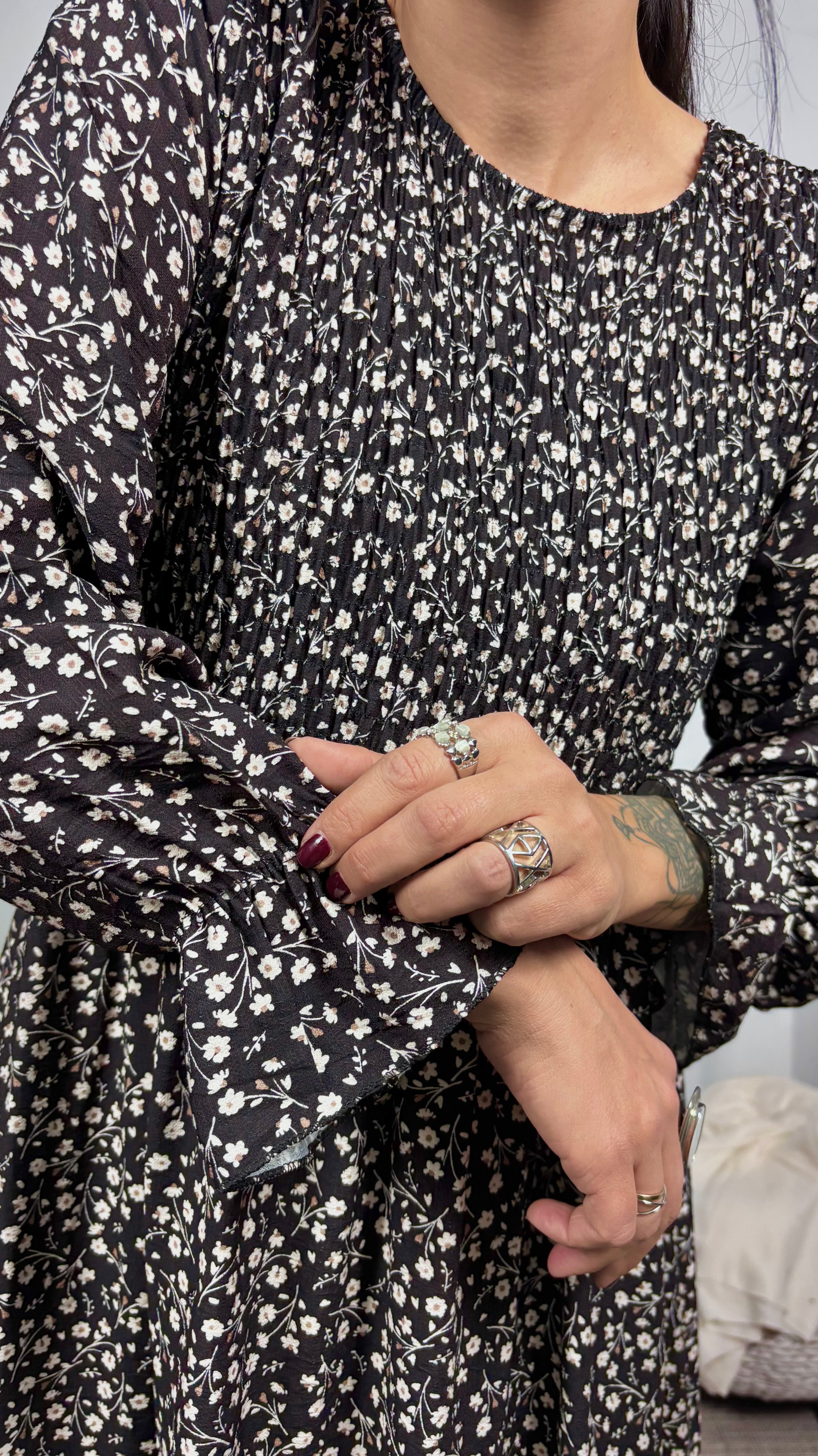 Vestido con cuerpo nido de abeja, falda suelta. Volante en la manga y bajo. Flores mini en...