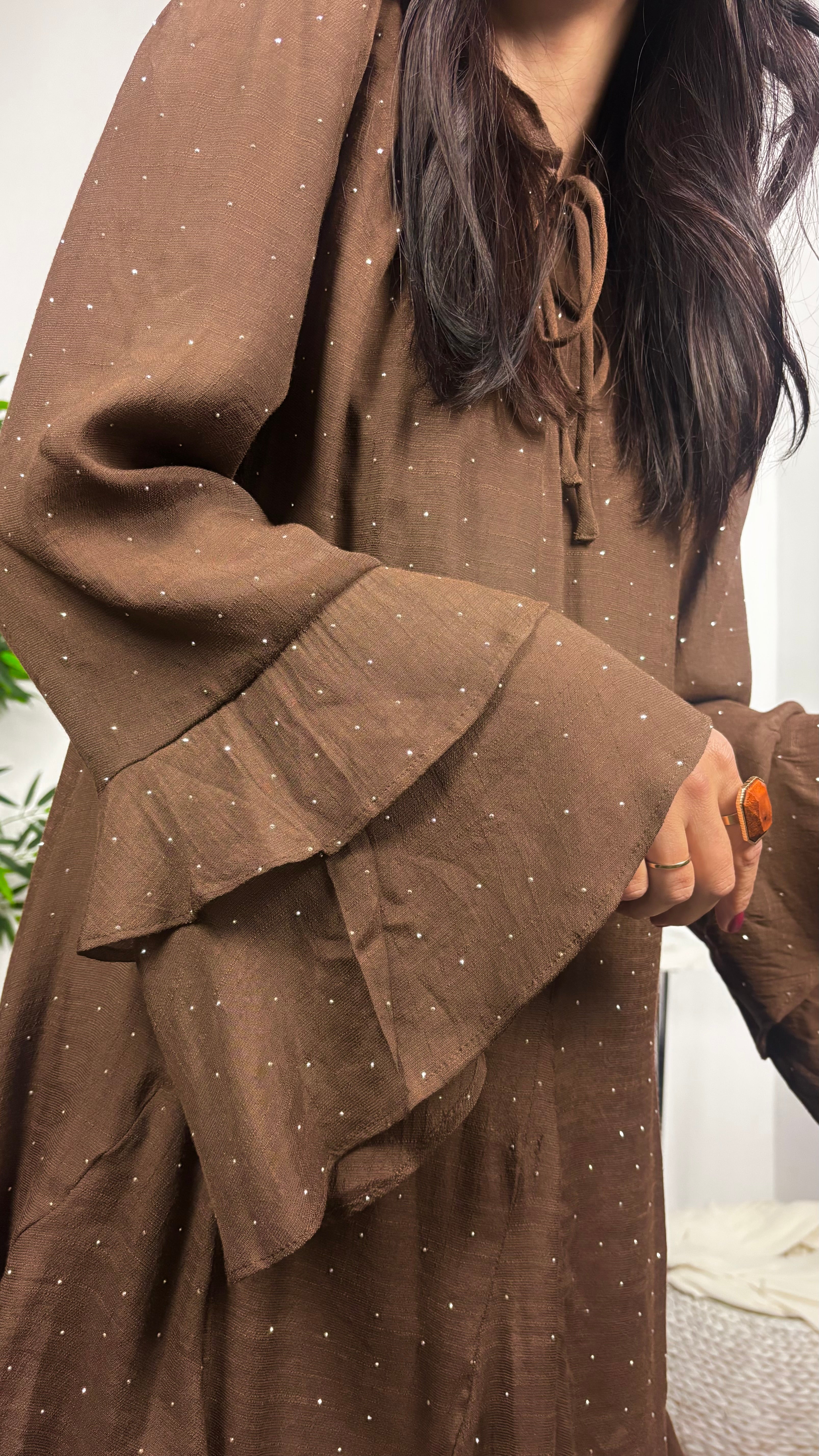 Vestido de tejido ligero con volantes y forro interior. Cuello mao con cierre de cordon. Cinturon de cordon con ojales.